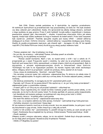 DAFT SPACE Rok 2146. Ziemia została podzielona na 9 dystryktów, by zapobiec przeludnieniu. W niektórych dystryktach są przedstawiciele rasy pozaziemskiej od wielu lat. Nie było wiadomo czy dany człowiek jest człowiekiem. Każdy, kto sprzeciwiał się władzy danego obszaru, zostawał z niego wydalany za jego granice. Przez 2 wieki ludzkość toczyła walkę z najeźdźcami z kosmosu powszechnie znanymi jako „Necromorphy” – ohydne, trzymetrowe stworzenia, które jak mówią legendy, kiedyś były ludźmi wysłanymi na misje w kosmosie do badań satelit. Przez ludzi nazywane były szyderczo „zombiaki”. Powstały specjalne wojska pod nazwą UNSC – oddział żołnierzy działających na Ziemi i Infinity Universe – oddział żołnierzy i wojowników działający poza Ziemią. Zwykle do wojska przyjmowano mężczyzn, gdy stawiali opór – zaciągano ich siłą. W ten sposób rząd GPU (The Global Politician Union) chciał się przy okazji pozbyć nadmiaru ludzi. *** - Thomas, pospiesz się! – Guy krzyknął po raz drugi. - No już idę, nie wrzeszcz – odkrzyknął Thomas, schodząc powoli ze schodów. - No szybciej, bo się spóźnimy na autobus! Thomas zszedł niechętnie. Myśl o tym, że musiał wstać o 6.00 i być w szkole do 17, przyprawiała go o zawał. Przyjaciele wyszli z siedziby, by udać się na przystanek autobusowy. Dystrykt pod nazwą No.6, który zamieszkiwali, w dużym stopniu różnił się od pozostałych. Była to najczystsza, a zarazem najniebezpieczniejsza strefa w International Union Districts. Technologia też była tu na najwyższym poziomie. Za murami regionu było widać wschodzące słońce. Chłopacy dotarli na przystanek i wsiedli do autobusu, który zawiózł ich do liceum. - Jezuu, znowu do siedemnastej… Świetnie! - marudził Thomas. - Nie narzekaj, przecież mamy tak codziennie- odpowiedział Guy. Po dotarciu do szkoły mimo 11 lekcji czas upłynął szybko. Po wyjściu udali się w stronę domu. Po drodze usłyszeli pewną „ciekawą” rozmowę. - Jak skończę osiemnastkę, to zaciągnę się do IU!- powiedział jakiś uczeń. - Pogrzało cię?! Chcesz iść na pewną śmierć? Nie wystarczy ci, że już tutaj mamy przerąbane? – odpowiedział jeden z uczestników rozmowy - A nawet jeśli to co? Chcę się na coś przydać ludzkości! – odburknął ten. Thomasa i Guy’a najwidoczniej nie ruszyła burzliwa rozmowa grupki uczniów przed szkołą, co nie oznaczało, że nie był to dla nich ważny temat. Po drodze spotkała ich jeszcze jedna niespodzianka – byli świadkami zatrzymania jednego z przedstawicieli rasy obcej przez ludzi z UNSC. - Dokumenty, śmieciu – krzyknął jeden z policjantów - Nie mam! Nie daliście mi karty! – odpowiedział wzburzony obcy. - Nie u nas, a w urzędzie załatwia się takie sprawy, kretynie! – wykrzyknął drugi funkcjonariusz. - Jesteśmy zmuszeni cię aresztować. Dawaj łapy! W tym momencie kosmita rzucił się w stronę ucieczki, lecz nie zaszedł daleko, bo policjanci rzucili się natychmiast w jego stronę. Jeden chwycił go z całej siły za kark. - Ładnie to tak uciekać, hę? – powiedziawszy to, powalili obcego na ziemię, po czym zaczęli go bić i kopać. Zszokowany Guy przyglądał się tej sytuacji. Zdenerwowany Thomas popchnął go i dodał: - Chodź, spadamy! Chłopacy uciekli z miejsca zdarzenia, udając, że nic nie widzieli. Jednak Guy’a dręczyło sumienie, że nie mógł jakoś zareagować. Rozwścieczony krzyknął do Thomasa: - Odbiło ci?! Mogliśmy mu pomóc! 1 - A co my niby mogliśmy zrobić?! Potem by nas aresztowali pod pretekstem „pobicia funkcjonariuszy” i co wtedy, co?! Uświadom sobie, Guy, że nadejdzie taki dzień, w którym będziesz musiał się troszczyć tylko o siebie! – odpowiedział równie zezłoszczony Thomas. Guy zamilkł. Wiedział bowiem, że jego kumpel ma rację. Pozostałą drogę do domu przeszli w ciszy. Nic nie wskazywało na to, że jeszcze dzisiaj wydarzy się coś ciekawego. Nagle przed ich nosem wylądował średniej wielkości statek kosmiczny z logiem Infinity Universe, z którego wyszedł wysoki mężczyzna w zbroi majora. - Panowie Guy Clarke i Thomas Carver? – spytał się chłopaków. - Tak.. yyy a w jakiej sprawie? – spytał Thomas. - Wszelkie pytania proszę zadawać, jak już będziemy na miejscu – odpowiedział major. - Ale gdzie…?! – nie dokończył zdania Guy, gdyż ten siłą wciągnął ich na statek po czym odlecieli. Przyjaciele czuli się nieswojo. Ciemne wnętrze pojazdu było przytłaczające, a siedzenia niewygodne. Naprzeciwko nich siedzieli żołnierze. Nie wyglądali na zachwyconych. - A to co? Świeże mięsko? – powiedział szyderczo jeden z nich. - Zamknij się, jeszcze ich wystraszysz, hehe! – odpowiedział drugi. Specjalnie rozmawiali tak głośno, by tamci ich usłyszeli. W Guy’m gotowała się złość. Chciał podejść i ich stłuc, gdy nagle rozbrzmiał głos pilota: - UWAGA, PROSZĘ ZAPIĄĆ PASY, WYLATUJEMY Z ATMOSFERY. - CO?! – pomyśleli równo Thomas i Guy. Nie zdążyli nawet się zapiąć bo statek zaczął lecieć z prędkością światła, co wgniotło ich w siedzenie. Nie zdążywszy zorientować się, co się stało, byli już na stacji kosmicznej należącej do Infinity Universe. Ze zdziwienia opadły im szczęki. Nie kryli zdziwienia, jednak wciąż zadawali sobie pytanie: dlaczego tu są i po co? Pojazd wylądował. Nagle rozległ się głos majora: - Słuchać, bo nie będę powtarzać! Przed wyjściem wszyscy zakładają maski tlenowe! Zrozumiano? - Tak jest sir! – odpowiedzieli żołnierze. Thomas i Guy nie wiedzieli, co robić, jednak nie chcieli wyjść na idiotów. Wzięli maski i niezdarnie je założyli, co było dla starszych delikwentów kolejnym powodem do szyderczych żartów. Major kazał im iść za nimi. Chłopcy wyszli ze statku i im oczom ukazała się ogromna stacja główna Infinity Universe. Gdzieniegdzie było widać bujną roślin