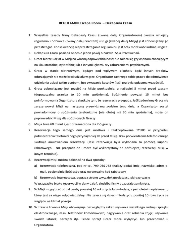 REGULAMIN Escape Room – Dekapsuła Czasu 1. Wszystkie zasady firmy Dekapsuły Czasu (zwaną dalej Organizatorem) określa niniejszy regulamin i odbiorca (zwany dalej Graczem) usługi (zwanej dalej Misją) jest zobowiązany go przestrzegać. Konsekwencją nieprzestrzegania regulaminu jest brak możliwości udziału w grze. 2. Dekapsuła Czasu posiada obecnie jeden pokój o nazwie: Sala Przesłuchań. 3. Gracz bierze udział w Misji na własną odpowiedzialność; nie zaleca się gry osobom chorującym na klaustrofobię, nyktofobię lub z innymi lękami, czy zaburzeniami psychicznymi. 4. Gracz w stanie nietrzeźwym, będący pod wpływem alkoholu bądź innych środków odurzających nie może brać udziału w grze. Organizator zastrzega sobie prawo do odmówienia udzielenia usługi takim osobom, bez zwracania kosztów (jeśli gra była opłacona wcześniej). 5. Gracz zobowiązany jest przyjść na Misję punktualnie, a najlepiej 5 minut przed czasem (dopuszczalna granica to 10 min spóźnienia). Spóźnienie powyżej 15 minut bez poinformowania Organizatora skutkuje tym, że rezerwacja przepada. Jeśli żaden inny Gracz nie zarezerwował Misji na następną przewidzianą godzinę tego dnia, a Organizator został powiadomiony o spóźnieniu telefonicznie (nie dłużej niż 30 min spóźnienia), może on poprowadzić Misję dla spóźnionych Graczy. 6. Misja trwa 60 minut i jest przeznaczona dla 2-5 graczy. 7. Rezerwacja tego samego dnia jest możliwa i zaakceptowana TYLKO w przypadku potwierdzenia telefonicznego przynajmniej 2h przed Misją. Brak potwierdzenia telefonicznego skutkuje anulowaniem rezerwacji. (Jeśli rezerwacja była wykonana za pomocą kuponu rabatowego – NIE przepada on i może być wykorzystany do późniejszej rezerwacji Misji w innym terminie). 8. Rezerwacji Misji można dokonać na dwa sposoby: a) Rezerwacja telefoniczna, pod nr tel. 799 965 768 (należy podać imię, nazwisko, adres email, opcjonalnie ilość osób oraz ewentualny kod rabatowy) b) Rezerwacja internetowa, poprzez stronę www.dekapsulaczasu.pl/rezerwacje W przypadku braku rezerwacji w dany dzień, siedziba firmy pozostaje zamknięta. 9. W Misji mogą brać udział osoby powyżej 16 roku życia lub młodsze, z pełnoletnim opiekunem, który jest za niego odpowiedzialny. Nie zaleca się dzieci młodszych, poniżej 10 roku życia ze względu na klimat pokoju. 10. W trakcie trwania Misji obowiązuje bezwzględny zakaz używania wszelkiego rodzaju sprzętu elektronicznego, m.in. telefonów komórkowych; nagrywania oraz robienia zdjęć; używania swoich latarek, narzędzi itp. Tenże sprzęt Gracz może wyłączyć, lub przechować u Organizatora. 11. Przebieg Misji jest monitorowany (obraz i dźwięk, lecz nie zapisywany, niedostępny dla osób trzecich). 12. Gracz zobowiązany jest do nie niszczenia mienia, w przypadku uszkodzeń do niezwłocznego poinformowania Organizatora, oraz pokrycia ewentualnych kosztów naprawy, wyznaczonych przez Organizatora. 13. Gracz przychodzi w wygodnym stroju, nie krępującym ruchów. W przypadku złego samopoczucia Gracza, istnieje możliwość przerwania Misji bądź wypuszczenia danego Gracza wyjściem awaryjnym oraz kontynuacją Misji dla pozostałych Graczy. 14. Dane do firmy MISJA Angelika Nowak NIP: 78-22-630-357 REGON: 36-46-76-155 a) Siedziba: ul. Nad Wierzbakiem 22/5, 60-612 Poznań b) Telefon: 799 965 768 (preferowane godziny tel. po g.16:30 (pn, wt, czw), lub po 10:00 (pt, sob, nd)) c) Godziny otwarcia: poniedziałki 18:00 i 19:30, wtorki 18:00 i 19:30, środy BRAK REZERWACJI czwartki 18:00 i 19:30, piątki, soboty, niedziele 13:00, 15:00, 17:00, 19:00 i 21:00. d) Strony www: www.dekapsulaczasu.pl www.facebook.com/DekapsulaCzasu www.lockme.pl/dekapsula-czasu/ 15. Organizator zastrzega sobie prawo do zmiany niniejszego regulaminu. 16. Pozostałe zasady, niezawarte w regulaminie określa Kodeks Cywilny