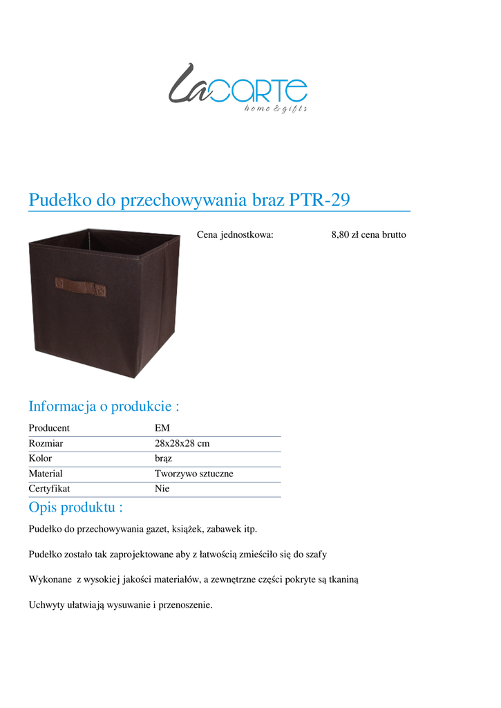 Pudełko do przechowywania braz PTR-29 Cena jednostkowa: 8,80 zł cena brutto Informacja o produkcie : Producent Rozmiar Kolor Material Certyfikat EM 28x28x28 cm brąz Tworzywo sztuczne Nie Opis produktu : Pudełko do przechowywania gazet, książek, zabawek itp. Pudełko zostało tak zaprojektowane aby z łatwością zmieściło się do szafy Wykonane z wysokiej jakości materiałów, a zewnętrzne części pokryte są tkaniną Uchwyty ułatwiają wysuwanie i przenoszenie. Wymiary: Długość: 28 cm Szerokość: 28 cm Wysokość: 28 cm Powered by TCPDF (www.tcpdf.org)