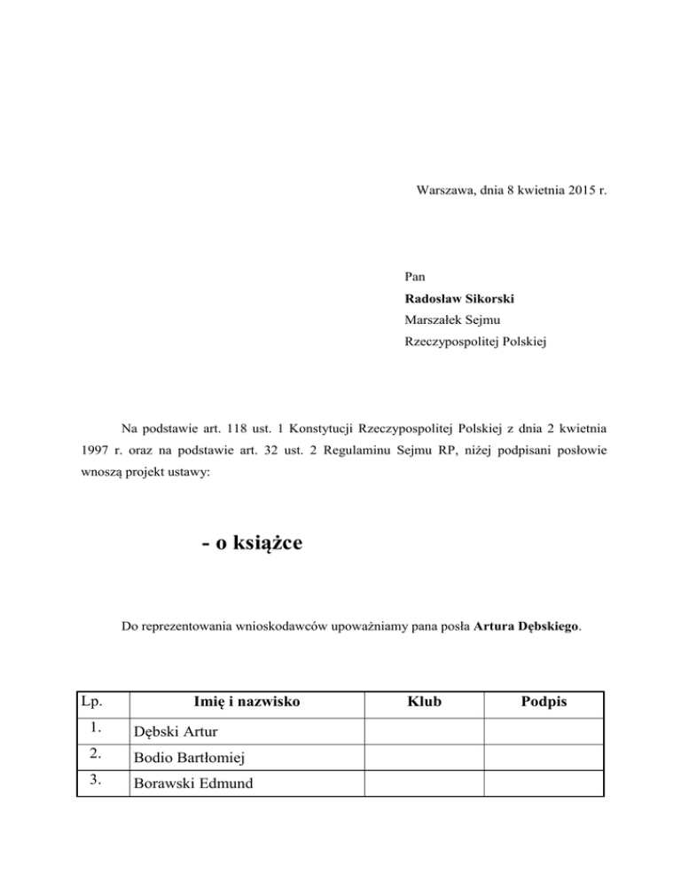 Warszawa, dnia 8 kwietnia 2015 r. Pan Radosław Sikorski Marszałek Sejmu Rzeczypospolitej Polskiej Na podstawie art. 118 ust. 1 Konstytucji Rzeczypospolitej Polskiej z dnia 2 kwietnia 1997 r. oraz na podstawie art. 32 ust. 2 Regulaminu Sejmu RP, niżej podpisani posłowie wnoszą projekt ustawy: - o książce Do reprezentowania wnioskodawców upoważniamy pana posła Artura Dębskiego. Lp. Imię i nazwisko 1. Dębski Artur 2. Bodio Bartłomiej 3. Borawski Edmund Klub Podpis Imię i nazwisko Lp. 4. Borkowski Krzysztof 5. Bramora Artur 6. Bury Jan 7. Dziadzio Dariusz Cezar 8. Garczewski Romuald 9. Godson John Abraham 10. Gos Marek 11. Górczyński Artur 12. Grzeszczak Eugeniusz Tomasz 13. Kalemba Stanisław 14. Kasprzak Mieczysław 15. Kłopotek Eugeniusz 16. Kmiecik Henryk 17. Łopata Jan 18. Makowski Tomasz 19. Maliszewski Mirosław 20. Nawrocka Elżbieta 21. Ozga Krystyna 22. Pacholski Michał 23. Pasławska Urszula 24. Pawlak Mirosław 25. Pawlak Waldemar 26. Piechociński Janusz 27. Racki Józef 28. Sajak Paweł 29. Sawicki Marek 30. Smolarz Henryk Klub Podpis Lp. Imię i nazwisko 31. Sosnowski Zbigniew 32. Stefaniuk Franciszek Jerzy 33. Sztorc Andrzej 34. Szymiec-Raczyńska Halina 35. Tokarska Genowefa 36. Walkowski Piotr 37. Zgorzelski Piotr 38. Zych Józef 39. Żelichowski Stanisław Klub Podpis Projekt USTAWA z dnia ……….… 2015 r. o książce Rozdział 1 Przepisy ogólne Art. 1. Ustawa określa: 1) zasady uregulowania rynku wydawniczego i dystrybucji książek; 2) zasady ustalania jednolitej ceny książki; 3) prawa i obowiązki wydawców, importerów oraz sprzedawców końcowych, związane z dystrybucją książek. Art. 2. Przepisów ustawy nie stosuje się do sprzedaży książek w ramach ponadgranicznego handlu elektronicznego, chyba że książka jest odbierana przez nabywcę końcowego na terytorium kraju w punkcie wskazanym przez sprzedawcę końcowego lub wysyłka do nabywcy końcowego następuje z terytorium kraju. Art. 3. Ilekroć w ustawie jest mowa o: 1) książce - należy przez to rozumieć publikację objętą symbolem 58.11.1 lub 58.11.2 Polskiej Klasyfikacji Wyrobów i Usług, z wyłączeniem ulotek; 2) nabywcy końcowym - należy przez to rozumieć osobę, która nabywa książki w celach innych niż ich dalsza odsprzedaż, w szczególności w ramach wykonywanej przez siebie działalności gospodarczej; 3) sprzedawcy końcowym - należy przez to rozumieć podmiot wykonujący działalność gospodarczą w zakresie obrotu gospodarczego książkami, który sprzedaje książki nabywcy końcowemu; 4) terytorium kraju - należy przez to rozumieć terytorium Rzeczypospolitej Polskiej. Rozdział 2 Obowiązki określenia ceny książki Art. 4. 1. Wydawca i importer są obowiązani do ustalenia, przed wprowadzeniem książki do obrotu, jednolitej ceny książki obowiązującej przy sprzedaży nabywcy końcowemu, obejmującej wartość podatku od towarów i usług, zwanej dalej „ceną”. 2. Cena książki obejmuje wszelkie dodatki sprzedawane wraz z książką, w szczególności zdjęcia, taśmy magnetyczne oraz inne nośniki utworów muzycznych i audiowizualnych. 3. Obowiązek ustalenia ceny nie ma zastosowania do książek: 1) w wydaniach bibliofilskich, charakteryzujących się wysoką jakością wydania, mających przeznaczenie kolekcjonerskie i wydanych w numerowanym nakładzie, nieprzekraczającym 500 egzemplarzy; 2) artystycznych, których wydanie wymagało wykorzystania metod rękodzielniczych; 3) wydanych na zamówienie, w łącznym nakładzie nieprzekraczającym 150 egzemplarzy; 4) wydanych przez zagranicznego wydawcę w języku innym niż polski i importowanych na terytorium kraju. Art. 5. 1. Cena oraz informacja o roku i miesiącu wprowadzenia książki do obrotu powinny zostać trwale umieszczone na książce lub zamieszczone w internetowym katalogu wydawcy. 2. Wydawca i importer są obowiązani do przekazania do Biblioteki Narodowej w Warszawie, przed wprowadzeniem książki do obrotu, informacji o jej cenie. Art. 6. 1. Cena sprzedaży książki w ramach subskrypcji lub w ramach jednorazowej sprzedaży całej serii lub kolekcji książek oraz wielotomowych encyklopedii i słowników może być różna od sumy cen ich poszczególnych części lub tomów. 2. Jeżeli sprzedaż książki nabywcy końcowemu odbywa się na raty, suma rat nie może być niższa niż określona uprzednio cena. 3. Wydawca lub importer mogą ustalić różne ceny książki w poszczególnych jej standardach edytorskich, w szczególności wydania w twardej lub miękkiej oprawie. 4. Wydawca lub importer mogą ustalić cenę inną niż jednolita cena dla prenumeratorów czasopism w przypadku sprzedaży książki wydanej przez wydawcę danej gazety lub czasopisma. Art. 7. 1. Stosowanie ceny jest obowiązkowe w okresie 12 miesięcy od końca miesiąca, w którym wprowadzono książkę do obrotu. 2. Po upływie 6 miesięcy od końca miesiąca, w którym wprowadzono książkę do obrotu, wydawca i importer są uprawnieni do wycofania z rynku całego nakładu książki i ustalenia nowej ceny na okres pozostały do upływu okresu, o którym mowa w ust. 1. 3. W przypadku podwyższenia stawki podatku od towarów i usług na książki w okresie, o którym mowa w ust. 1, wydawca i importer są uprawnieni do zmiany ceny uwzględniającej tę podwyżkę. 4. W przypadku importu na terytorium kraju książki wydanej w Polsce, a następnie objętej eksportem, cena sprzedaży nie może, w okresie obowiązywania jednolitej ceny, być niższa niż cena ustalona przez wydawcę. 5. Przepisu ust. 4 nie stosuje się w przypadku importowania książek z państw należących do Europejskiego Obszaru Gospodarczego, chyba że obiektywne czynniki, a w szczególności brak rzeczywistej sprzedaży w tym państwie, pozwalają stwierdzić, że działanie to miało na celu obejście przepisów ustawy. Art. 8. 1. Do stosowania ceny jest obowiązany sprzedawca końcowy. 2. Obowiązek sprzedaży książki po jednol