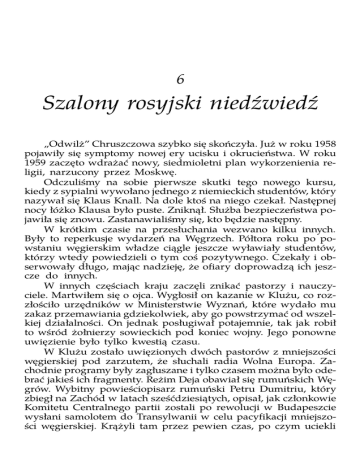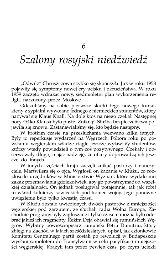 6 Szalony rosyjski niedźwiedź „Odwilż” Chruszczowa szybko się skończyła. Już w roku 1958 pojawiły się symptomy nowej ery ucisku i okrucieństwa. W roku 1959 zaczęto wdrażać nowy, siedmioletni plan wykorzenienia religii, narzucony przez Moskwę. Odczuliśmy na sobie pierwsze skutki tego nowego kursu, kiedy z sypialni wywołano jednego z niemieckich studentów, który nazywał się Klaus Knall. Na dole ktoś na niego czekał. Następnej nocy łóżko Klausa było puste. Zniknął. Służba bezpieczeństwa pojawiła się znowu. Zastanawialiśmy się, kto będzie następny. W krótkim czasie na przesłuchania wezwano kilku innych. Były to reperkusje wydarzeń na Węgrzech. Półtora roku po powstaniu węgierskim władze ciągle jeszcze wyławiały studentów, którzy wtedy powiedzieli o tym coś pozytywnego. Czekały i obserwowały długo, mając nadzieję, że ofiary doprowadzą ich jeszcze do innych. W innych częściach kraju zaczęli znikać pastorzy i nauczyciele. Martwiłem się o ojca. Wygłosił on kazanie w Klużu, co rozzłościło urzędników w Ministerstwie Wyznań, które wydało mu zakaz przemawiania gdziekolwiek, aby go powstrzymać od wszelkiej działalności. On jednak posługiwał potajemnie, tak jak robił to wśród żołnierzy sowieckich pod koniec wojny. Jego ponowne uwięzienie było tylko kwestią czasu. W Klużu zostało uwięzionych dwóch pastorów z mniejszości węgierskiej pod zarzutem, że słuchali radia Wolna Europa. Zachodnie programy były zagłuszane i tylko czasem można było odebrać jakieś ich fragmenty. Reżim Deja obawiał się rumuńskich Węgrów. Wybitny powieściopisarz rumuński Petru Dumitriu, który zbiegł na Zachód w latach sześćdziesiątych, opisał, jak członkowie Komitetu Centralnego partii zostali po rewolucji w Budapeszcie wysłani samolotem do Transylwanii w celu pacyfikacji mniejszości węgierskiej. Krążyli tam przez pewien czas, po czym uciekli stamtąd, ponieważ nie ufali nawet tamtejszej służbie bezpieczeństwa. Po stłumieniu powstania poczyniono w stosunku do Węgrów pewne ustępstwa, potem jednak zastosowano surowe sankcje wobec wszystkich, podejrzewanych o to, że mogą być źródłem kłopotów, włączając w to pastorów i księży. W seminarium pojawił się nowy student — kolejny chłopiec z mniejszości niemieckiej, którego wyrzucono ze szkoły milicyjnej. Powiedzmy, że był to Fritz Neumann. Jego historia była komiczna i podejrzana. Neumanna zmuszono, by wstąpił do szkoły milicyjnej. Jej siły liczyły już czterdzieści tysięcy ludzi, ale było im ciągle za mało. Nie można było minąć nawet jednej przecznicy bez natknięcia się na znienawidzony błękitny mundur. Rekrutowano chłopców prosto ze szkół średnich, którzy po ukończeniu milicyjnej szkoły wyższej wychodzili z „dyplomami” i podejmowali najlepiej płatną pracę w całym państwie, otrzymując samochód i liczne przywileje. Zawodowi funkcjonariusze nigdy nie zdołają się wymknąć, nawet jeśli zostaną zwolnieni. Otrzymują wtedy inną pracę, gdzie mogą szpiegować, na przykład kierownika działu kadr w przedsiębiorstwie. Państwo nie marnuje czasu ani pieniędzy na ich wyszkolenie. Jednocześnie jednak państwo nie ścierpi w tej pracy nikogo z nawet najlżejszym śladem nielojalności. Znałem milicjanta, który został zwolniony, ponieważ nie zameldował swoim przełożonym, że jego brat poprosił go, by wstawił się dobrym słowem za chorym więźniem. Byłem pewny, że Neumann w dalszym ciągu szpieguje dla służby bezpieczeństwa. Mieli na niego swoje haczyki. Opowiedział, jak został wyrzucony: — Widzicie, kiedy ktoś wstępuje do ludowej służby bezpieczeństwa, sprawdzani są wszyscy jego krewni, aby była pewność co do jego pochodzenia społecznego. Miałem w Stanach Zjednoczonych pewnego dalekiego kuzyna, o którym nawet nie wiedziałem. Wyemigrował jeszcze przed wojną. Napisałem więc, że nie mam krewnych za granicą. Lecz potem ten facet, nie wiadomo po co, napisał do naszej rodziny z Waszyngtonu i wyszło to na jaw. — Jakim sposobem? — Prosto. Kontrolowali korespondencję mojego ojca. — Chcesz powiedzieć, że byłeś na trzecim roku studiów, a oni ciągle jeszcze czytali listy twojego ojca? — Oczywiście. A to był od czasów wojny jedyny list do nas z zagranicy. — A czy powiedziałeś im, że nie znasz tego kuzyna? — Rozmawiał ze mną jeden z głównych oficerów. Pytałem, jak można mnie winić za to, że jakiś dziesiąty kuzyn z Ameryki napisał list do mojego ojca. Odpowiedź brzmiała: „Jeśli kiedyś każemy ci strzelać do tego kuzyna, to skąd możemy być pewni, że to zrobisz? Masz krewnych, którzy zaprzedali się imperialistom”. Służba bezpieczeństwa przetrząsała ogromne ilości korespondencji prywatnej. Mieli na to specjalny departament. Mam wiadomości z pierwszej ręki o tym, jak listy były otwierane w specjalnych urządzeniach pod działaniem gorącej pary, potem przenoszone na mikrofilmy i odsyłane dalej. Mojemu ojcu pokazywano podczas przesłuchań kopie listów, wysłanych przez niego wiele lat temu. Neumann utrzymywał, że przeżył religijne nawrócenie w czasie trudnych miesięcy swojego życia, które nastąpiły po jego zwolnieniu. Inni chłopcy, którym się zwierzał, nie wierzyli, że może mieć jeszcze kontakty ze służbą bezpieczeństwa. Ja jednak nie miałem co do tego złudzeń. W styczniu roku 1959 było dużo śniegu. Zalegał na ulicach i na dachach. Góry ponad nimi były na tle szarego nieba białe jak kreda. Było bardzo zimno i rzadko wychodziliśmy, miałem jednak przyjaciół w mieście i czasem wygłaszałem kazania na tajnych spotkaniach w ich domach. Pewnego poranku mały chłopak jednego z tych przyjaciół przyszedł, by mi powiedzieć, że chce się ze mną widzieć w pilnej sprawie pewna pani, która przyjechała z Bukaresztu. — Czeka w tym małym parku po drugiej stronie ulicy — wyszepta