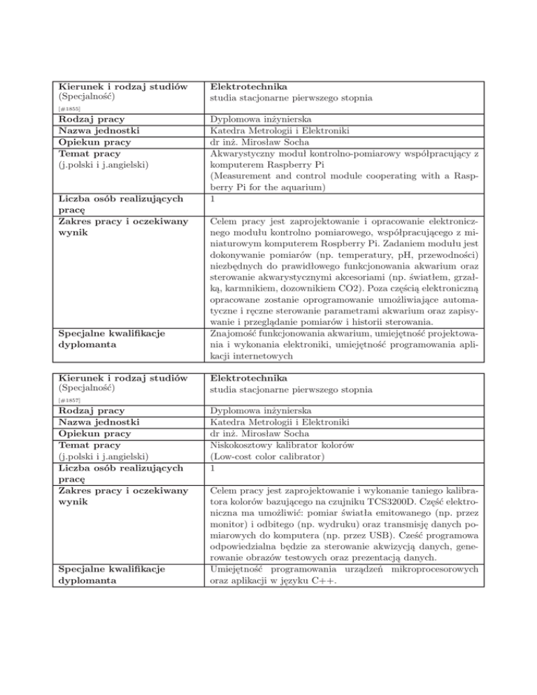 Kierunek i rodzaj studiów (Specjalność) Elektrotechnika studia stacjonarne pierwszego stopnia [#1855] Rodzaj pracy Nazwa jednostki Opiekun pracy Temat pracy (j.polski i j.angielski) Liczba osób realizujących pracę Zakres pracy i oczekiwany wynik Specjalne kwalifikacje dyplomanta Kierunek i rodzaj studiów (Specjalność) Dyplomowa inżynierska Katedra Metrologii i Elektroniki dr inż. Mirosław Socha Akwarystyczny moduł kontrolno-pomiarowy współpracujący z komputerem Raspberry Pi (Measurement and control module cooperating with a Raspberry Pi for the aquarium) 1 Celem pracy jest zaprojektowanie i opracowanie elektronicznego modułu kontrolno pomiarowego, współpracującego z miniaturowym komputerem Rospberry Pi. Zadaniem modułu jest dokonywanie pomiarów (np. temperatury, pH, przewodności) niezbędnych do prawidłowego funkcjonowania akwarium oraz sterowanie akwarystycznymi akcesoriami (np. światłem, grzałką, karmnikiem, dozownikiem CO2). Poza częścią elektroniczną opracowane zostanie oprogramowanie umożliwiające automatyczne i ręczne sterowanie parametrami akwarium oraz zapisywanie i przeglądanie pomiarów i historii sterowania. Znajomość funkcjonowania akwarium, umiejętność projektowania i wykonania elektroniki, umiejętność programowania aplikacji internetowych Elektrotechnika studia stacjonarne pierwszego stopnia [#1857] Rodzaj pracy Nazwa jednostki Opiekun pracy Temat pracy (j.polski i j.angielski) Liczba osób realizujących pracę Zakres pracy i oczekiwany wynik Specjalne kwalifikacje dyplomanta Dyplomowa inżynierska Katedra Metrologii i Elektroniki dr inż. Mirosław Socha Niskokosztowy kalibrator kolorów (Low-cost color calibrator) 1 Celem pracy jest zaprojektowanie i wykonanie taniego kalibratora kolorów bazującego na czujniku TCS3200D. Część elektroniczna ma umożliwić: pomiar światła emitowanego (np. przez monitor) i odbitego (np. wydruku) oraz transmisję danych pomiarowych do komputera (np. przez USB). Cześć programowa odpowiedzialna będzie za sterowanie akwizycją danych, generowanie obrazów testowych oraz prezentacją danych. Umiejętność programowania urządzeń mikroprocesorowych oraz aplikacji w języku C++. Kierunek i rodzaj studiów (Specjalność) Elektrotechnika studia stacjonarne pierwszego stopnia [#1078] Rodzaj pracy Nazwa jednostki Opiekun pracy Temat pracy (j.polski i j.angielski) Liczba osób realizujących pracę Zakres pracy i oczekiwany wynik Specjalne kwalifikacje dyplomanta Kierunek i rodzaj studiów (Specjalność) Dyplomowa inżynierska Katedra Elektrotechniki i Elektroenergetyki dr inż. Przemysław Syrek Wyznaczanie rozkładu gęstości prądów wirowych powstających podczas przezczaszkowej stymulacji mózgu (Determination of eddy currents generated during transcranial magnetic stimulation) 1 1.Zastosowanie metody różnic skończonych do tworzenia układu równań umożliwiającego wyznaczenie przestrzennego rozkładu gęstości prądów wirowych (w oparciu o tzw. model A-V). 2.Wyznaczanie rozkładu gęstości prądów wirowych przy zadanym rozkładzie indukcji pola magnetycznego w obrębie głowy. Opis właściwości elektrycznych ludzkiej głowy wprowadzony zostanie za pomocą modeli pochodzących z biblioteki Virtual Population (udostępnianej przez The Foundation for Research on Information Technologies in Society (IT’IS)) Język angielski Elektrotechnika studia stacjonarne pierwszego stopnia [#1077] Rodzaj pracy Nazwa jednostki Opiekun pracy Temat pracy (j.polski i j.angielski) Liczba osób realizujących pracę Zakres pracy i oczekiwany wynik Specjalne kwalifikacje dyplomanta Dyplomowa inżynierska Katedra Elektrotechniki i Elektroenergetyki dr inż. Przemysław Syrek Zastosowanie bezsiatkowej metody różnic skończonych do numerycznego wyznaczania rozkładu prądów wirowych (Application of meshless finite difference method to numerical determination of eddy current distribution) 1 1.Wybór odpowiedniego modelu służącego do wyznaczania rozkładu gęstości prądów wirowych w obszarach znajdujących się w polu magnetycznym o ekstremalnie niskiej częstotliwości (do 100 Hz). 2.Tworzenie układów równań dla losowo wygenerowanych węzłów w obszarach takich jak prostopadłościan i kula, przy założeniu, że mają one stały współczynnik materiałowy (tj. przewodność elektryczną). Porównanie uzyskanych wyników z rozwiązaniami analitycznymi, przy założeniu, że obszary przewodzące znajdują się w zewnętrznym, jednorodnym polu magnetycznym. 3.Przedstawienie wyników dla obszarów niejednorodnych materiałowo, poddanych działaniu zewnętrznego pola magnetycznego o niejednorodnym rozkładzie. Język angielski