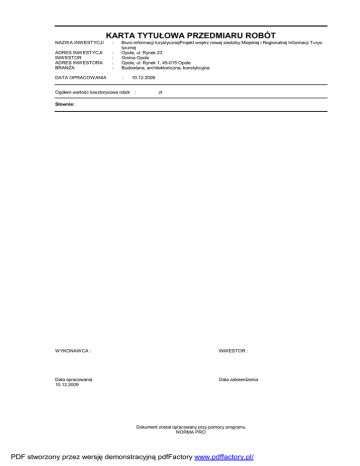 KARTA TYTUŁOWA PRZEDMIARU ROBÓT NAZWA INWESTYCJI : ADRES INWESTYCJI INWESTOR ADRES INWESTORA BRANŻA : : : : DATA OPRACOWANIA Biuro informacji turystycznejProjekt wnętrz nowej siedziby Miejskiej i Regionalnej Informacji Turystycznej Opole, ul. Rynek 23 Gmina Opole Opole, ul. Rynek 1, 45-015 Opole Budowlana, architektoniczna, konstykcyjna : Ogółem wartość kosztorysowa robót 10.12.2009 : zł Słownie: WYKONAWCA : INWESTOR : Data opracowania 10.12.2009 Data zatwierdzenia Dokument został opracowany przy pomocy programu NORMA PRO PDF stworzony przez wersję demonstracyjną pdfFactory www.pdffactory.pl/ OGÓLNA CHARAKTERYSTYKA OBIEKTU KLASYFIKACJA WEDŁUG WSPÓLNEGO SŁOWNIKA ZAMÓWIEŃ CPV: Dział: Kod CPV 45000000-7 - Roboty budowlane Grupa: Kod CPV 45100000-8 - Roboty budowlane w zakresie przygotowania terenu pod budowę Kod CPV 45200000-9 - Roboty budowlane w zakresie wznoszenia kompletnych obiektów budowlanych lub ich części oraz roboty w zakresie inżynierii lądowej i wodnej Kod CPV 45400000-1 - Roboty wykończeniowe w zakresie obiektów budowlanych Kategoria: Kod CPV 45410000 - 4 - Tynkowanie Kod CPV 45420000 - 7 - Roboty w zakresie stolarki budowlanej oraz roboty ciesielskie Kod CPV 45421000 - 4 - Roboty w zakresie stolarki budowlanej Kod CPV 45421100 - 5 - Instalowanie drzwi i okien oraz podobnych elementów Kod CPV 45111000 - 8 - Roboty w zakresie burzenia, roboty ziemne Kod CPV 45111100 - 9 - Roboty w zakresie burzenia Kod CPV 45111220 - 6 - Roboty w zakresie usuwania gruzu Kod CPV 45262500 - 6 - Roboty murarskie Kod CPV 45431000 - 7 - Kładzenie płytek Kod CPV 45430000 - 0 - Pokrywanie podłóg i ścian Kod CPV 45431000 - 7 - Kładzenie płytek Kod CPV 45431100 - 8 - Kładzenie terakoty Kod CPV 45431200 - 9 - Kładzenie glazury Kod CPV 45442100 - 8 - Roboty malarskie Kod CPV 45450000 - 6 - Roboty budowlane wykończeniowe, pozostałe -2- Norma PRO Wersja 4.01, Marzec 2003 r. PDF stworzony przez wersję demonstracyjną pdfFactory www.pdffactory.pl/ Galeria artystyczna 1 - przedmiar Lp. 1 1.1 1.1. 1 1 d.1. 1.1 KSIĄŻKA PRZEDMIARÓW Podst Opis i wyliczenia KOD CPV 45000000-7 - ROBOTY BUDOWLANE DZIAŁ I - KOD CPV 45100000-8 - PRZYGOTOWANIE TERENU POD BUDOWĘ Demontaże j.m. KNR-W 4- Wykucie z muru krat okiennych o pow.ponad 2 m2 01 0353-08 m2 SST - 1 m2 3*1.40*2.40 2 KNR-W 4- Wykucie z muru ościeżnic drewnianych o pow.do 2 m2 d.1. 01 0353-04 1.1 SST - 1 3 szt. 3 KNR-W 4- Wykucie z muru ościeżnic drewnianych o pow.ponad 2 m2 d.1. 01 0353-05 1.1 SST - 1 3*1.22*1.95+1.30*2.10 m2 4 KNR-W 4- Wykucie z muru podokienników drewnianych,stalowych d.1. 01 0353-11 1.1 SST - 1 3*1.25+2*1.05 m 5 KNR-W 4- Rozebranie obróbek murów ogniowych, okapów, kołnierzy, gzymsów itp. z d.1. 01 0545-08 blachy nie nadającej się do użytku 1.1 SST - 1 3*1.25*0.40 m2 6 kalk. wlas- Demontaż osłon grzejników d.1. na 1.1 SST - 1 3*1.10*1.30 m3 7 kalk. włas- Demontaż płyt kartonowo - gipsowych na ścianach d.1. na 1.1 SST - 1 (2*7.25+2*6.0)*4.30+(2*4.92+2*6.36)*4.30-2*1.70*1.05-1.30*2.10-1.40* 0.95-2*1.78*2.0-0.90*2.0-1.22*1.95 m2 8 kalk. włas- Demontaż sufitów podwieszanych z płyt gipsowo - kartonowych d.1. na 1.1 SST - 1 7.25*6.0+7.20*6.36 m2 9 KNR 4-04 d.1. 0602-01 1.1 SST - 1 Burzenie murów z cegły zwykłej na zaprawie cementowej o wys.do 4 m ponad terenem przy użyciu młotów pneumatycznych m3 2.10*4.30*0.05+2.57*4.30*0.12+4.90*4.30*0.09+2.22*4.30*0.12+4.15* 4.30*0.05+2.22*4.30*0.20+2.22*4.30*0.15+2.22*4.30*0.10-0.90*2.0*0.054*0.90*2.0*0.09-0.90*2.0*0.15-0.90*2.0*0.20 m3 10 KNR 4-04 d.1. 0504-06 1.1 SST - 1 Rozebranie posadzek dywanowych m2 7.25+6.0+1.78*0.90+4.92*6.36+3.05*1.25+2.22*2.42 m2 11 KNR-W 4- Rozebranie okładziny ściennej z płytek ceramicznych d.1. 01 0820-08 1.1 SST - 1 (2*2.22+2*1.32)*2.0-2*0.90*2.0+(2*4.90+2*1.07)*2.0-2*1.22*1.0-2*0.80* 2.0+(2*2.57+4*0.95)*2.0-3*0.80*2.0 m2 12 KNR 4-04 d.1. 0504-03 1.1 SST - 1 Rozebranie posadzek z płytek ceramicznych m2 2.22+1.32+4.90*1.07+2.57*0.95 m2 szt. m2 m m2 m3 m2 Poszcz 10.080 RAZEM 10.080 3.000 RAZEM 3.000 9.867 RAZEM 9.867 5.850 RAZEM 5.850 1.500 RAZEM 1.500 4.290 RAZEM 4.290 192.029 RAZEM m2 89.292 RAZEM 192.029 89.292 8.639 RAZEM m2 Razem 55.328 RAZEM 8.639 55.328 41.880 RAZEM 41.880 11.225 RAZEM 11.225 1.2 DZIAŁ II - KOD CPV - 45200000-9 - ROBOTY BUDOWLANE W ZAKRESIE WZNOSZENIA KOMPLETNYCH OBIEKTÓW BUDOWLANYCH LUB ICH CZĘŚCI ORAZ ROBOTY W ZAKRESIE INŻYNIERII LĄDOWEJ I WODNEJ -3- Norma PRO Wersja 4.01, Marzec 2003 r. PDF stworzony przez wersję demonstracyjną pdfFactory www.pdffactory.pl/ Galeria artystyczna 1 - przedmiar Lp. 1.2. 1 13 d.1. 2.1 Podst Konstrukcja KSIĄŻKA PRZEDMIARÓW Opis i wyliczenia j.m. NNRNKB (z.VIII) Ścianki działowe o grubości 12 cm z płytek z betonu komórkowego o m2 202 0190a- długości 49 cm na zaprawie klejowej - transport materiałów wyciągiem 02 SST - 2 (1.20+2.75+5.16+2*1.30+2.65+1.20)*4.30-4*0.90*2.0 m2 14 NNRNKB Ścianki działowe o grubości 6 cm z płytek z betonu komórkowego o długości m2 d.1. 202 0190a- 49 cm na zaprawie klejowej - transport materiałów wyciągiem 2.1 01 SST - 2 1.30*4.30-0.90*2.0 m2 15 KNR 2-02 d.1. 0126-05 2.1 SST - 2 Otwory w ścianach murowanych -ułożenie nadproży prefabr. - belka nadpro- szt żowa L 50x50x5 dł.95 cm 16 KNR 2-02 d.1. 0126-05 2.1 SST - 2 Otwory w ścianach murowanych - ułożenie nadproży prefabrykowanych Po- szt rotherm 11,5 o długości 125 cm lub równoważne 17 KNNR 7 d.1. 0208-06 2.1 SST - 2 Wykonanie na budowie i montaż konstrukcji spawanych - konstrukcja nośna t wieży z ceowników stalowych 1 szt 4 szt 0.5 Poszcz Razem 59.708 RAZEM 59.708 3.790 RAZEM 3.790 1.000 RAZEM 1.000 4.000 RAZEM 4.000 t 0.500 RAZEM 1.3 DZIAŁ IV - 45400000-1 - ROBOTY WYKOŃCZENIOWE W ZAKRESIE OBIEKTÓW BUDOWLANYCH 1.3. Kod CPV: 45410000-4 - Tynkowanie 1 18 KNR 2-02 Tynki wewn.zwykłe cementowo - wapienne wykon.mechanicznie na ściam2 d.1. 0801-02 nach - ściany nowoprojektowane 3.1 SST - 3 2*(1.20+2.75+5.16+2*1.30+2.65+1.20)*3.50-8*0.