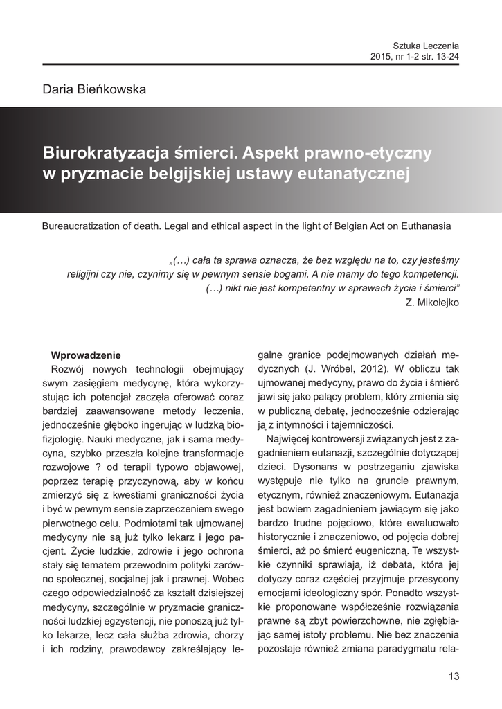 Sztuka Leczenia 2015, nr 1-2 str. 13-24 Daria Bieńkowska Biurokratyzacja śmierci. Aspekt prawno-etyczny w pryzmacie belgijskiej ustawy eutanatycznej Bureaucratization of death. Legal and ethical aspect in the light of Belgian Act on Euthanasia „(…) cała ta sprawa oznacza, że bez względu na to, czy jesteśmy religijni czy nie, czynimy się w pewnym sensie bogami. A nie mamy do tego kompetencji. (…) nikt nie jest kompetentny w sprawach życia i śmierci” Z. Mikołejko Wprowadzenie Rozwój nowych technologii obejmujący swym zasięgiem medycynę, która wykorzystując ich potencjał zaczęła oferować coraz bardziej zaawansowane metody leczenia, jednocześnie głęboko ingerując w ludzką biofizjologię. Nauki medyczne, jak i sama medycyna, szybko przeszła kolejne transformacje rozwojowe ? od terapii typowo objawowej, poprzez terapię przyczynową, aby w końcu zmierzyć się z kwestiami graniczności życia i być w pewnym sensie zaprzeczeniem swego pierwotnego celu. Podmiotami tak ujmowanej medycyny nie są już tylko lekarz i jego pacjent. Życie ludzkie, zdrowie i jego ochrona stały się tematem przewodnim polityki zarówno społecznej, socjalnej jak i prawnej. Wobec czego odpowiedzialność za kształt dzisiejszej medycyny, szczególnie w pryzmacie graniczności ludzkiej egzystencji, nie ponoszą już tylko lekarze, lecz cała służba zdrowia, chorzy i ich rodziny, prawodawcy zakreślający le- galne granice podejmowanych działań medycznych (J. Wróbel, 2012). W obliczu tak ujmowanej medycyny, prawo do życia i śmierć jawi się jako palący problem, który zmienia się w publiczną debatę, jednocześnie odzierając ją z intymności i tajemniczości. Najwięcej kontrowersji związanych jest z zagadnieniem eutanazji, szczególnie dotyczącej dzieci. Dysonans w postrzeganiu zjawiska występuje nie tylko na gruncie prawnym, etycznym, również znaczeniowym. Eutanazja jest bowiem zagadnieniem jawiącym się jako bardzo trudne pojęciowo, które ewaluowało historycznie i znaczeniowo, od pojęcia dobrej śmierci, aż po śmierć eugeniczną. Te wszystkie czynniki sprawiają, iż debata, która jej dotyczy coraz częściej przyjmuje przesycony emocjami ideologiczny spór. Ponadto wszystkie proponowane współcześnie rozwiązania prawne są zbyt powierzchowne, nie zgłębiając samej istoty problemu. Nie bez znaczenia pozostaje również zmiana paradygmatu rela13 Biurokratyzacja śmierci. Aspekt prawno-etyczny w pryzmacie belgijskiej ustawy eutanatycznej cji lekarz-pacjent, rozwój koncepcji autonomii jednostki. To wszystko sprawia, że prawo oparte jedynie na aspektach natury stricte dogmatycznej analizy nie jest w stanie przedstawić rzeczowych rozwiązań. Tak ujęte daje tylko wyraz twierdzeniu, że „(...) akceptacja eutanazji przez prawo nie jest bynajmniej zwycięstwem jej zwolenników ani triumfem <kultury śmierci>, lecz tylko smutnym ustępstwem na rzecz ułomnej kondycji ludzkiej” (J. Hołówka, 1998). Dlatego też, tak ważnym jest, aby z rozwagą, niezwykłą delikatnością, zgłębiać tak wrażliwe i wątpliwe moralnie tematy, jednocześnie z pełną świadomością powagi problemu poszukiwać harmonijnych rozwiązań, aby umieć wyważyć propozycję wysuwane przez ustawodawcę w konkretnym akcie prawnym, a wartościami dla człowieka najistotniejszymi. Wartościami, które najczęściej w obliczu sytuacji granicznych, pozostają w skrajnej opozycji, co do poszczególnych rozwiązań ustawodawczych. „Prawo nie znosi próżni” (M. Sajfan, 2011, s. 12), stąd też zbyt szybkie odpowiedzi na pojawiające się zawiłości moralne, etyczne we współczesnym świecie. Jednak, aby można było mówić o prawie, tworzącym ramy dla bezpieczeństwa jednostki, dla ochrony życia i zdrowia ludzkiego, istotna jest dogłębna analiza nawet najbardziej newralgicznych zagadnień. Analiza ta musi wykraczać poza ramy sformalizowanych, sztywnych zapisów prawnych. Potrzebne jest podejście interdyscyplinarne, zawierające refleksję nad danym aktem prawnym w oparciu o inne nauki, nie zapominając o filozofii, etyce, czy też teologii. Niemniej, prawdziwy konflikt wartości w obliczu podejmowania decyzji dotyczących graniczności życia rozgrywa się indywidualnie w człowieku, i każdy z nas „(…) w jakimś 14 sensie pełni rolę dworkinowskiego Herkulesa, poszukując przy zastosowaniu racjonalnej i zbalansowanej argumentacji, punktu możliwego kompromisu” (M. Sajfan, 2011, s.15). Pojęcie eutanazji szczególnie dotyczącej dzieci, jej wymiaru, uchwycenia cienkiej granicy pomiędzy rezygnacją z usilnego podtrzymywania przy życiu a pomocy w jego zakończeniu jest wątpliwa. Jak słusznie wskazuje Pietrzykowski „(...) nie wydaje się przy tym, aby najistotniejsze było wikłanie się w subtelności definicyjne” (T. Pietrzykowski, 2009, s. 116). Zasadniczym problemem, jaki wytworzył się wokół powyższego zagadnienia, jest spór o to czy łatwiejszym w imię doniosłości błędnie interpretowanych Praw Człowieka jest zalegalizowanie udziału w zabójstwie człowieka przez osoby trzecie, czy z szacunku właśnie dla człowieka, dla jego godności, właściwej tylko istocie ludzkiej, pozwolić mu żyć, i w całej tej dramatycznej rzeczywistości, przesiąkniętej bólem i cierpieniem, po prostu z nim być, towarzyszyć w zmaganiu się ze złem choroby. Cel artykułu Celem artykułu jest ukazanie właściwego statusu prawnego przyjętej przez Parlament Belgijski poprawki do Ustawy Eutanatycznej z dnia 13 lutego 2014 roku, wskazanie jej niejasności, występujących kolizji dóbr prawnych, jak i poszukiwanie fundamentalnej wartości dla osoby doświadczającej sytuacji granicznej. 1/ STATUS PRAWNY BELGIJSKIEJ USTAWY EUTANAZYJNEJ 13 lutego 2014 roku Parlament Belgii zaakceptował poprawkę do belgijskiej Ustawy Daria Bieńkowska Eutanatycznej1 zezwalając tym samym na eutanazję chronicznie chorych dzieci bez granicy wiekowej. Pierwszą kwestią, jaką