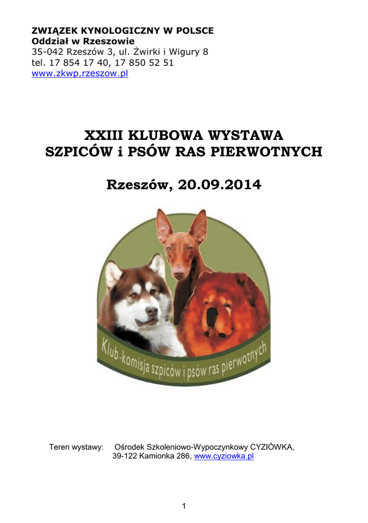 ZWIĄZEK KYNOLOGICZNY W POLSCE Oddział w Rzeszowie 35-042 Rzeszów 3, ul. Żwirki i Wigury 8 tel. 17 854 17 40, 17 850 52 51 www.zkwp.rzeszow.pl XXIII KLUBOWA WYSTAWA SZPICÓW i PSÓW RAS PIERWOTNYCH Rzeszów, 20.09.2014 Teren wystawy: Ośrodek Szkoleniowo-Wypoczynkowy CYZIÓWKA, 39-122 Kamionka 286, www.cyziowka.pl 1 PROGRAM WYSTAWY - SHOW PROGRAMME 8.00 - 9.45 9.55 - 10.00 10.00 - 11.00 11.15 - 14.30 14.30 - Przyjmowanie psów na wystawę - Dogs Admittance - Otwarcie wystawy - Show Opening - KONKURENCJE HODOWLANE - Breeding competitions: Najlepsza Hodowla – Best Kennel – Katarzyna Fiszdon Najlepszy Reproduktor – Best Stud Dog – Maria Kavcic Najlepsza Suka Hodowlana – Best Brood Bitch – Eli Marie Klepp Najlepsza Para – Best Couple – Ewa Szeliga-Szeremeta - Ocena psów na ringach - Dogs Evaluation - KONKURENCJE FINAŁOWE - The final competitions • Wybór Najpiękniejszego Młodszego Szczenięcia– BEST MINOR PUPPY Sędzia – Maria Kavcic • Wybór Najpiękniejszego Szczenięcia – BEST PUPPY Sędzia – Maria Kavcic • Wybór Najpiękniejszego Juniora – BEST JUNIOR Sędzia – Katarzyna Fiszdon • Wybór Najpiękniejszego Weterana – BEST VETERAN Sędzia – Elżbieta Augustyniak • Wybór Najpiękniejszego Nordyckiego Psa Zaprzęgowego Sędzia – Eli Marie Klepp • Wybór Najpiękniejszego Nordyckiego Psa Myśliwskiego Sędzia – Eli Marie Klepp • Wybór Najpiękniejszego Nordyckiego Psa Pasterskiego i Stróżującego Sędzia – Katarzyna Fiszdon • Wybór Najpiękniejszego Szpica Europejskiego Sędzia – Elżbieta Augustyniak • Wybór Najpiękniejszego Szpica Azjatyckiego i Ras Pokrewnych Sędzia – Ewa Szeliga-Szeremeta • Wybór Najpiękniejszego Psa Ras Pierwotnych Sędzia – Katarzyna Fiszdon • Wybór Najpiękniejszego Psa Myśliwskiego Ras Pierwotnych Sędzia – Ewa Szeliga-Szeremeta • Wybór Najpiękniejszego Psa Myśliwskiego Ras Pierwotnych z pręgą na grzbiecie Sędzia – Eli Marie Klepp BEST IN SHOW WYBÓR NAJPIĘKNIEJSZEGO PSA KLUBOWEJ WYSTAWY Rzeszów – 2014 Sędzia – Maria Kavcic 16.00 - Zamknięcie Wystawy – Closs of the Show 2 Szanowni Państwo, Drodzy Miłośnicy Szpiców* W imieniu organizatorów – Zarządu Oddziału Związku Kynologicznego w Rzeszowie oraz Klubu Komisji Szpiców i Psów Ras Pierwotnych przy Zarządzie Głównym Związku Kynologicznego w Polsce – serdecznie witam Państwa na XXIII Klubowej Wystawie Szpiców i Psów Ras Pierwotnych. W przyszłym roku minie ćwierć wieku odkąd regularnie spotykamy się na klubowych wystawach Grupy V, aby poznawać, podziwiać i doceniać bogactwo oraz piękno natury, jeszcze zachowane w tej najbardziej psiej ze wszystkich grup psów. Cudem ocalałe w nich najczystsze cechy psychiczne i fizyczne canis lupus – które od dziesiątków tysiącleci – miały wpływ na obopólne kształtowanie się i rozwój gatunków homo i canis. Nie znamy jeszcze dokładnej daty i miejsca gdzie, kiedy i dlaczego ten unikalny proces został zapoczątkowany i kultywowany. Jak doszło do spotkania praczłowieka z prapsem, które przedzierzgnęło się w tak bogate, różnorodne i zmieniające się współistnienie. Nie wiadomo też na jakim etapie ewolucji człowieka i psa doszło do tej wyjątkowej kooperacji. Pies, jak dotychczas zgodnie twierdzą znawcy przedmiotu był – we wszystkich poznanych do dziś cywilizacjach – pierwszym udomowionym zwierzęciem. Jakie jednak były wzajemne wpływy oddziaływania – interferencji na rozwój obu gatunków – jeszcze nie wiemy, może zbyt mało o nich się mówi, zbyt mało się je bada – to wiedza nieuporządkowana i bardzo skromna. Historia psa i jego przeobrażeń, które dokonywały się z wielu przyczyn i wielowątkowo, szczególnie zaś pod wpływem potrzeb użytkowych na rzecz człowieka – mamy dość szczegółowo opracowaną, opisaną i wyuczoną. Ale o odwrotnym wpływie – zwłaszcza z okresu sprzed podporządkowania i całkowitego zniewolenia psa – bogactwa zachowań canis lupus na rozwój człowieka, które musiały być przeogromne – prawie nie znamy. A przecież współpraca człowieka z psem podczas polowań, stróżowania, domestykacji innych gatunków była przeogromna. Pies był (i do dziś jest w wielu sytuacjach) przedłużonym ramieniem człowieka ale jednak myślącym samodzielnie. Zachowania psa, jego praca, reakcje, musiały mieć wpływ na spostrzeganie, uczenie się, na rozwój człowieka. O doniosłości roli psa w procesie „dojrzewania” homo sapiens świadczą choćby dwa zjawiska – mitologia i malarstwo (ryty) naskalne. Czymże są mity, legendy –są niepisanymi, przekazywanymi słownie, z pokolenia na pokolenie, wstępami do tworzących się historii cywilizacji i kultur. W mitologii pies odgrywa zauważalną i charakterystyczną dla swoich walorów rolę. Pies występuje w mitologiach kultur pokrewnych np. świata antycznego Egipty, Grecji, Rzymu, ale także znany jest w mitach światów odosobnionych Skandynawii, Afryki, wśród ludów eskimoskich, czy wśród australijskich Aborygenów. Mity rozwijały ludzką wyobraźnię, abstrakcyjne myślenie. W sztuce malarstwa naskalnego, istniejącej od tysiącleci – człowiek odważył się upamiętnić obraz otaczającego go świata. Było to zapoczątkowaniem najwspanialszej przygody ludzkości ze sztuką, intelektualnym awansem. W jaskiniach, na skałach – techniką rytu i malarską – w prehistorycznych czasach, w odległych zakątkach ziemi, w Hiszpanii, Szwecji, Francji, Algierii, w górach Ałtaju, a półwyspie arabskim – uwieczniono psy towarzyszące człowiekowi na łowach. To były wiekopomne znaki – na człowieczej drodze do postępu – których wierny pies był aktywnym sprzymierzeńcem. Pies przez dziesiątki tysiącleci współpracujący z człowiekiem, przybierał różne formy. Były one uzależnione od środowiska, stawianych mu użytkowych lub estetycznych wymogów, poddawał się im niejako naturalnie. Szczęśl