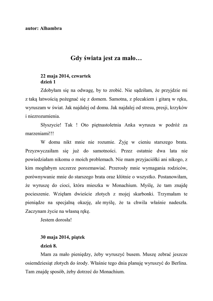 autor: Alhambra Gdy świata jest za mało… 22 maja 2014, czwartek dzień 1 Zdobyłam się na odwagę, by to zrobić. Nie sądziłam, że przyjdzie mi z taką łatwością pożegnać się z domem. Samotna, z plecakiem i gitarą w ręku, wyruszam w świat. Jak najdalej od domu. Jak najdalej od stresu, presji, krzyków i niezrozumienia. Słyszycie! Tak ! Oto piętnastoletnia Anka wyrusza w podróż za marzeniami!!! W domu nikt mnie nie rozumie. Żyję w cieniu starszego brata. Przyzwyczaiłam się już do samotności. Przez ostatnie dwa lata nie powiedziałam nikomu o moich problemach. Nie mam przyjaciółki ani nikogo, z kim mogłabym szczerze porozmawiać. Przerosły mnie wymagania rodziców, porównywanie mnie do starszego brata oraz kłótnie o wszystko. Postanowiłam, że wyruszę do cioci, która mieszka w Monachium. Myślę, że tam znajdę pocieszenie. Wzięłam dwieście złotych z mojej skarbonki. Trzymałam te pieniądze na specjalną okazję, ale myślę, że ta chwila właśnie nadeszła. Zaczynam życie na własną rękę. Jestem dorosła! 30 maja 2014, piątek dzień 8. Mam za mało pieniędzy, żeby wyruszyć busem. Muszę zebrać jeszcze osiemdziesiąt złotych do środy. Właśnie tego dnia planuję wyruszyć do Berlina. Tam znajdę sposób, żeby dotrzeć do Monachium. Ostatnio mi się nie wiedzie. Kilka nocy przespałam w parku. Wiem, że jestem już czterdzieści kilometrów od domu. Trochę przejechałam autostopem, trochę przeszłam. Póki co nie myślę o rodzinie. Teraz liczę się tylko ja! Nikt inny! Wczoraj wpadłam na pomysł, jak zebrać pieniądze na wyjazd. Wzięłam gitarę i usiadłam na deptaku przed miejscową galerią. Zaczęłam grać. Kompletnie nie przejmowałam się ludźmi. Sześć lat spędzonych w szkole muzycznej nie poszło na marne. Grałam i śpiewałam. Czułam się świetnie. Nim się obejrzałam, w futerale leżało jakieś sto złotych. Wow… niesamowite!!! Pomyśleć, że grałam tam tylko dwie godziny. Myślę, że gdybym dłużej tam siedziała, zarobiłabym o wiele więcej. Wszystko układa się po mojej myśli. 15 czerwca 2014, niedziela dzień 24. Jestem chora. Mam gorączkę i dreszcze. Oby to nic poważnego. Opłaciłam bilet do Berlina, ale, niestety, nie udało mi się dotrzeć na dworzec na czas. Załamałam się. Straciłam prawie wszystkie pieniądze. Nie mam siły grać na deptaku. Zresztą i tak zostałam stamtąd przegnana. Z mojego pierwszego miejsca pracy. Właściciel stwierdził, że odstraszam klientów. Teraz nie mam pieniędzy na jedzenie ani leki. W plecaku mam jeszcze bułkę i butelkę wody. Wystarczy mi to do jutra. Nie chcę żebrać. Nie chcę się poniżać, więc postanowiłam wyruszyć dalej. Tydzień temu poznałam Wojtka - chłopaka w podobnej sytuacji. Jest brunetem o jasnej karnacji. Ma siedemnaście lat. Uciekł z domu od ojca alkoholika i matki, która bała mu się postawić. Dzielimy się jedzeniem i pomagamy sobie. Opiekuje się mną. Biwakujemy teraz na łące obok rzeki. W nocy rozpalamy ognisko. Za dnia planujemy trasę dalszej wędrówki. Według mojej mapy do celu pozostało pięćdziesiąt sześć kilometrów. Zdałam sobie sprawę, że Wojtek zastępuje mi mojego starszego brata. Jest dokładnie taki jak Kamil, mój okropny starszy brat, z wiecznie potarganymi włosami i skupionym wzrokiem. Bardzo często się z nim kłóciłam. Trochę mi go brakuje. Nie, żebym tęskniła… Nie! To nie w moim stylu. Nadal jest dla mnie tylko złym wspomnieniem. Muszę przerwać te wspominki…. Idę wyprać moją przedartą na plecach koszulkę. 17 czerwca 2014, wtorek dzień 26. Czuję się lepiej! Wróciło mi dobre samopoczucie. Jak to cudownie budzić się wczesnym rankiem wraz ze wschodem słońca oraz zasypiać, wpatrując się w głębię czarnego sklepienia. Liczenie gwiazd jest dla mnie najlepszą kołysanką. Dziś przypomniałam sobie list, który zostawiłam rodzicom na moim łóżku: Kochana rodzino! Wiem, że nie wytrzymałabym długo w tym chorym środowisku. Życie w cieniu mojego starszego braciszka wcale nie okazało się być marzeniem. Brak mi przyjaciół. Ciężka praca nad ocenami, bo ,,mogą być lepsze". Chciałabym być normalną dziewczyną. Chciałabym, żeby komuś na mnie zależało. Chciałabym, żebyście wiedzieli, co czuję. Jestem zakompleksioną dziewczyną, bez przyjaciół, bez marzeń i ambicji. Wymagacie ode mnie za dużo. Szkoła muzyczna, plastyczna, kurs angielskiego i niemieckiego, karate i siatkówka. Dodatkowo lekcje i sprzątanie. Przerosło mnie to. Dlatego postanowiłam uciec od tego. Wiem, jestem tchórzem, ale inaczej nie potrafię. Mam dość! Dlatego uciekam. Nie chcę tak dalej żyć. Poradzę sobie. Jestem dojrzalsza niż myślicie. Nie szukajcie mnie. Będę bezpieczna, obiecuję. Dziękuję za wszystko. Wasza Anka Chyba mi ich brakuje. Nie wiem, co bym zrobiła, gdybym zobaczyła ich teraz. Czuję do nich wielką niechęć, ale jednocześnie coś, czego nie jestem w stanie opisać. Mam nadzieję, że to uczucie szybko minie. Ciągle pamiętam też o moim psie. Fabian był z nami od trzech lat. Kocham tego małego futrzaka. Wiele bym dała, żeby móc się teraz z nim pobawić. 29 lipca 2014, wtorek dzień 68. Razem z Wojtkiem przebyliśmy już wiele kilometrów. Bardzo się zżyliśmy. Mamy, co jeść. Zarabiam, grając na ulicy, a Wojtek zbiera owoce. Wbrew pozorom nie brakuje nam podstawowych środków do życia. Mamy trzy zapalniczki. Ogień jest teraz dla nas niezbędny. Nie myślałam, że kiedyś zapałka będzie dla mnie cenniejsza niż najnowszy model telefonu. Mamy psa. Nazwałam go Fabi. Wojtek przyniósł go z lasu. Ktoś przywiązał go smyczą do drzewa. Pies był brudny, głodny i wyczerpany. Daliśmy mu jeść. Wykąpałam go w rzece. Od razu odzyskał siły. Mam się kim zajmować, gdy mój towarzysz wychodzi do pracy. Zbiera puszki, butelki, pakuje zakupy w sklepie. Co się nadarzy. Podziwiam go. Wojtek opiekuje się mną, pomaga