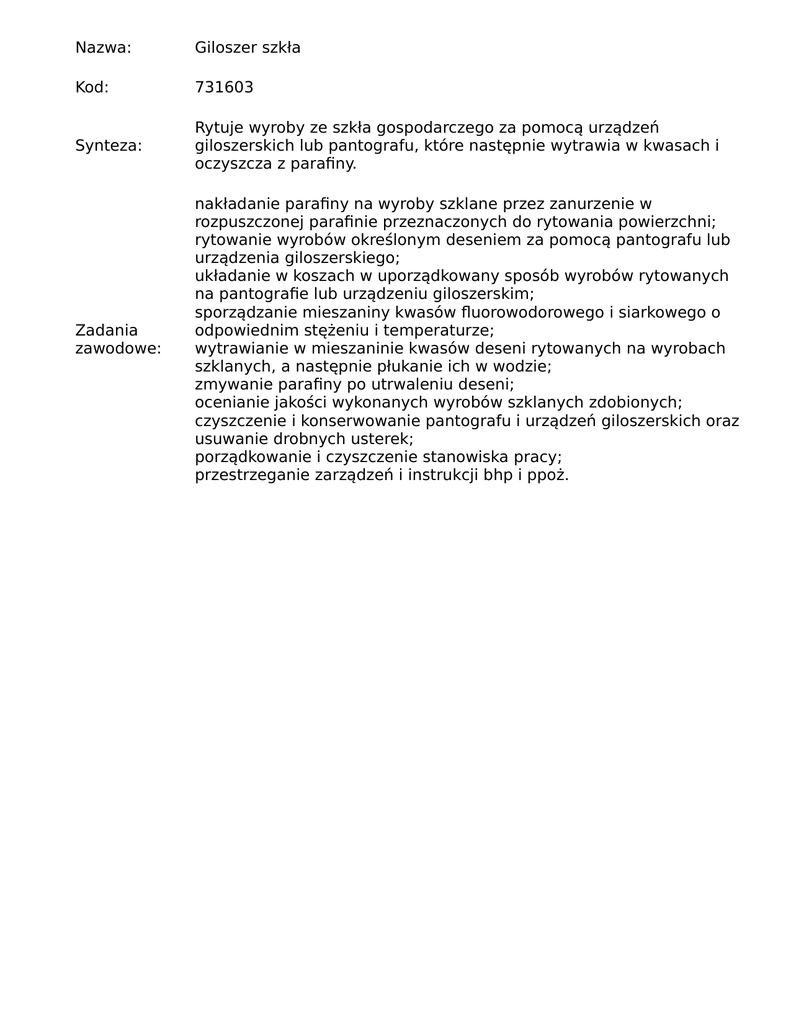 Nazwa: Giloszer szkła Kod: 731603 Synteza: Rytuje wyroby ze szkła gospodarczego za pomocą urządzeń giloszerskich lub pantografu, które następnie wytrawia w kwasach i oczyszcza z parafiny. Zadania zawodowe: nakładanie parafiny na wyroby szklane przez zanurzenie w rozpuszczonej parafinie przeznaczonych do rytowania powierzchni; rytowanie wyrobów określonym deseniem za pomocą pantografu lub urządzenia giloszerskiego; układanie w koszach w uporządkowany sposób wyrobów rytowanych na pantografie lub urządzeniu giloszerskim; sporządzanie mieszaniny kwasów fluorowodorowego i siarkowego o odpowiednim stężeniu i temperaturze; wytrawianie w mieszaninie kwasów deseni rytowanych na wyrobach szklanych, a następnie płukanie ich w wodzie; zmywanie parafiny po utrwaleniu deseni; ocenianie jakości wykonanych wyrobów szklanych zdobionych; czyszczenie i konserwowanie pantografu i urządzeń giloszerskich oraz usuwanie drobnych usterek; porządkowanie i czyszczenie stanowiska pracy; przestrzeganie zarządzeń i instrukcji bhp i ppoż.