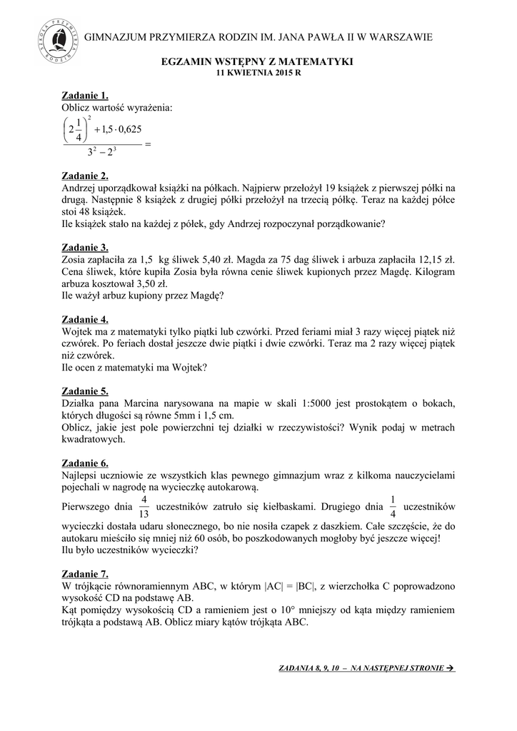egzamin wstępny z matematyki - Gimnazjum Przymierza Rodzin