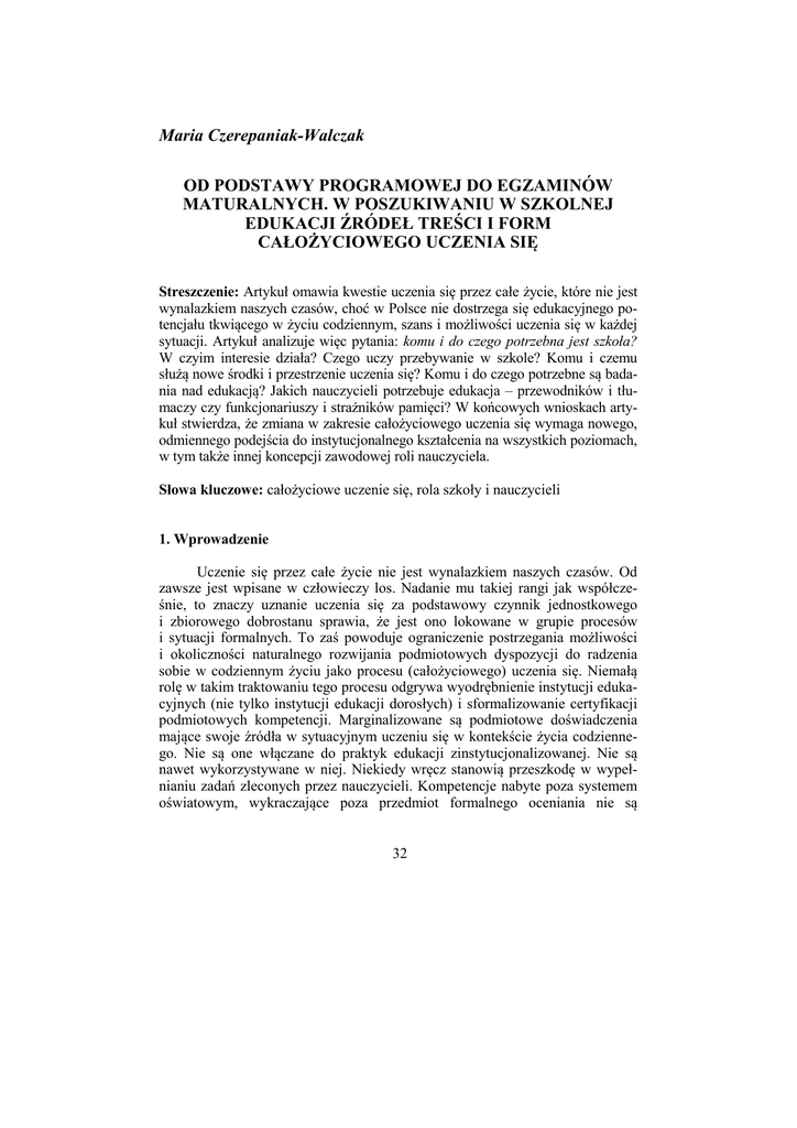 Maria Czerepaniak-Walczak OD PODSTAWY PROGRAMOWEJ DO EGZAMINÓW MATURALNYCH. W POSZUKIWANIU W SZKOLNEJ EDUKACJI ŹRÓDEŁ TREŚCI I FORM CAŁOŻYCIOWEGO UCZENIA SIĘ Streszczenie: Artykuł omawia kwestie uczenia się przez całe życie, które nie jest wynalazkiem naszych czasów, choć w Polsce nie dostrzega się edukacyjnego potencjału tkwiącego w życiu codziennym, szans i możliwości uczenia się w każdej sytuacji. Artykuł analizuje więc pytania: komu i do czego potrzebna jest szkoła? W czyim interesie działa? Czego uczy przebywanie w szkole? Komu i czemu służą nowe środki i przestrzenie uczenia się? Komu i do czego potrzebne są badania nad edukacją? Jakich nauczycieli potrzebuje edukacja – przewodników i tłumaczy czy funkcjonariuszy i strażników pamięci? W końcowych wnioskach artykuł stwierdza, że zmiana w zakresie całożyciowego uczenia się wymaga nowego, odmiennego podejścia do instytucjonalnego kształcenia na wszystkich poziomach, w tym także innej koncepcji zawodowej roli nauczyciela. Słowa kluczowe: całożyciowe uczenie się, rola szkoły i nauczycieli 1. Wprowadzenie Uczenie się przez całe życie nie jest wynalazkiem naszych czasów. Od zawsze jest wpisane w człowieczy los. Nadanie mu takiej rangi jak współcześnie, to znaczy uznanie uczenia się za podstawowy czynnik jednostkowego i zbiorowego dobrostanu sprawia, że jest ono lokowane w grupie procesów i sytuacji formalnych. To zaś powoduje ograniczenie postrzegania możliwości i okoliczności naturalnego rozwijania podmiotowych dyspozycji do radzenia sobie w codziennym życiu jako procesu (całożyciowego) uczenia się. Niemałą rolę w takim traktowaniu tego procesu odgrywa wyodrębnienie instytucji edukacyjnych (nie tylko instytucji edukacji dorosłych) i sformalizowanie certyfikacji podmiotowych kompetencji. Marginalizowane są podmiotowe doświadczenia mające swoje źródła w sytuacyjnym uczeniu się w kontekście życia codziennego. Nie są one włączane do praktyk edukacji zinstytucjonalizowanej. Nie są nawet wykorzystywane w niej. Niekiedy wręcz stanowią przeszkodę w wypełnianiu zadań zleconych przez nauczycieli. Kompetencje nabyte poza systemem oświatowym, wykraczające poza przedmiot formalnego oceniania nie są 32 MARIA CZEREPANIAK-WALCZAK Od podstawy programowej do egzaminów … uwzględniane w codziennej praktyce edukacyjnej, nie są wykorzystywane w interakcjach edukacyjnych, ani nie podlegają ewaluacji. Sytuacja ta wywołuje przeświadczenie o odrębności dwu światów: szkolnego i pozaszkolnego. Ta odrębność obejmuje zarówno czas jak i przestrzeń uczenia się. Wbrew temu, co mówi Zygmunt Bauman1, idea edukacji całożyciowej nie przestała być oksymoronem i nie stała się pleonazmem. Mimo „radykalnego przyśpieszenia zmian w społecznej sytuacji obu głównych grup aktorów na scenie edukacji: nauczycieli i uczniów” wciąż głęboko zakorzenione jest przeświadczenie o uczeniu się jako reakcji na nauczanie, pod dyktando, pod wpływem zewnętrznej motywacji, a efekty uczenia się wymagają formalnego potwierdzenia. Jak piszą autorzy „Projektu założeń projektu ustawy o zmianie ustawy – Prawo o szkolnictwie wyższym oraz niektórych innych ustaw”2, powołując się na raport „2010 Update of the European Inventory on Validation of Non-formal and Informal Learning”3, pod względem stopnia wdrożenia systemów zaliczania kwalifikacji nieformalnych w procesie uczenia się przez całe życie, Polska znajduje się w grupie państw najmniej zaawansowanych we wdrażaniu tych systemów. Jest w czwartej grupie wraz z takimi państwami jak Cypr, Grecja, Malta, Chorwacja, Litwa, Węgry i Bułgaria. Pod wpływem zewnętrznych opinii i raportów oraz (głównie) ekonomicznych argumentów podejmowane są inicjatywy włączania kompetencji nabytych poza formalnym systemem do formalnej certyfikacji4, ale ich wdrożenie do pracy szkół i uczelni wymaga poważnego namysłu i szerokiej debaty. Propozycja uregulowania uwzględniania podmiotowych doświadczeń spoza instytucji edukacyjnej w praktyce oświatowej odnosi się do szkoły wyższej i do osób powyżej 25 roku życia. Na niższych szczeblach systemu oświatowego takich inicjatyw nie ma. Idea edukacji całożyciowej jest bowiem postrzegana wąsko, to znaczy w odniesieniu do ludzi dorosłych. To bardzo powoli ulega zmianie. O odkrywaniu szkoły jako miejsca „prawdziwego” uczenia się świadczą między innymi takie praktyki oświatowe jak projekt gimnazjal1 Z. Bauman, O edukacji. Rozmowy z Riccardo Mazzeo, przekł. P. Poniatowska, Wyd. Nauk. DSW, Wrocław 2012, s. 23. 2 www.bip.nauka.gov.pl/_.../20121128_zalozenia_do_zmiany_ustawy... 3 J. Hawley, M. Suoto Otero, C. Duchemin, 2010 update of the European Inventory on Validation of Non-formal and Informal Learning – Final Report, http://libserver. cedefop.europa.eu/vetelib/2011/77643.pdf, s. 6. 4 Przykładem włączenia do efektów instytucjonalnego kształcenia kompetencji certyfikowanych poza uczelnią jest propozycja zawarta w Projekcie zmian Ustawy Prawo o szkolnictwie wyższym z 28 listopada 2012 r.: „W celu zagwarantowania odpowiedniego poziomu kształcenia osoba ubiegająca się o potwierdzenie efektów uczenia się nie może w ten sposób uzyskać więcej niż 50% puli punktów ECTS przypisanych do danego programu kształcenia, a ogólna liczba osób, które uzyskały takie potwierdzenie, na danym kierunku studiów i poziomie kształcenia, nie może przekroczyć 20% ogólnej liczby studentów na tym kierunku. Ocena jakości tej usługi (podkr. M. Cz-W) będzie dokonywana przez Polską Komisję Akredytacyjną”. www.bip.nauka.gov.pl/_.../ 20121128_zalozenia_do_zmiany_ustawy... 33 PROBLEMY I POGLĄDY ny5. Nie dostrzega się edukacyjnego potencjału tkwiącego w życiu codziennym, szans i możliwości uczenia się w każdej sytuacji. W tym tekście skupiam uwagę na idei edukacji całożyciowej (to znaczy w każdym etapie życia) jak