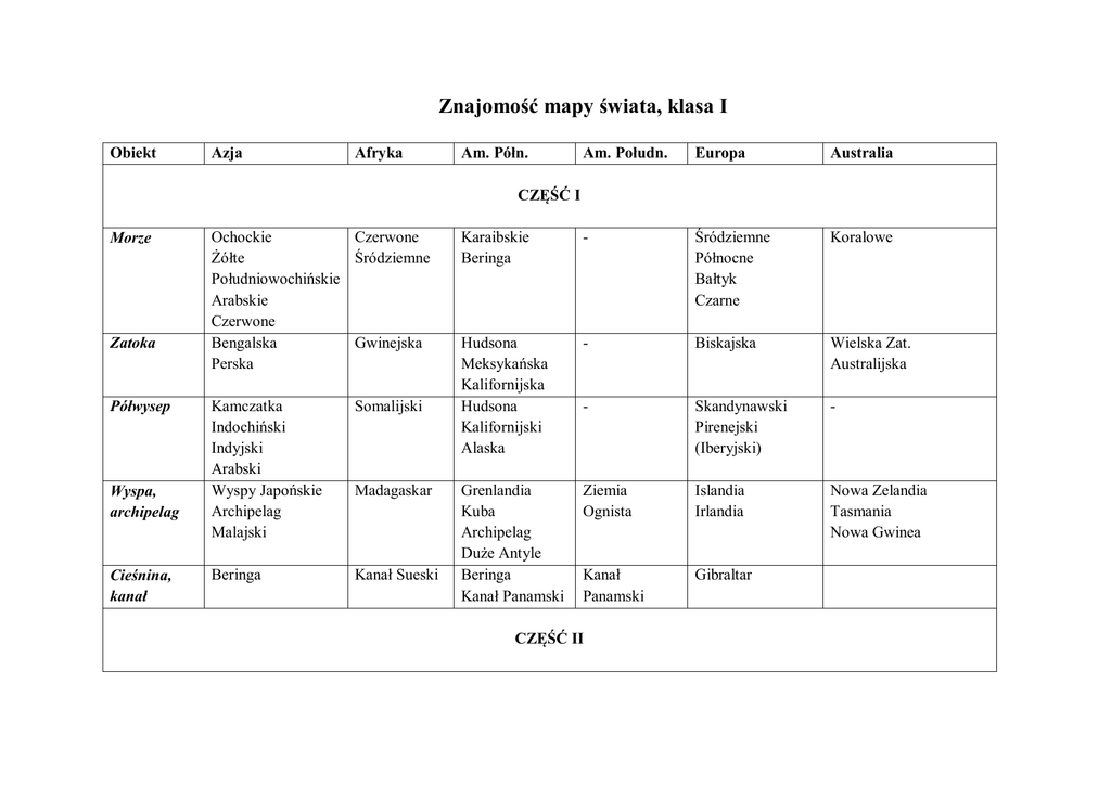Znajomość mapy świata, klasa I Obiekt Azja Afryka Am. Półn. Am. Połudn. Europa Australia Karaibskie Beringa - Śródziemne Północne Bałtyk Czarne Koralowe Hudsona Meksykańska Kalifornijska Hudsona Kalifornijski Alaska - Biskajska Wielska Zat. Australijska - Skandynawski Pirenejski (Iberyjski) - Grenlandia Kuba Archipelag Duże Antyle Beringa Kanał Panamski Ziemia Ognista Islandia Irlandia Nowa Zelandia Tasmania Nowa Gwinea Kanał Panamski Gibraltar CZĘŚĆ I Morze Zatoka Półwysep Wyspa, archipelag Cieśnina, kanał Ochockie Czerwone Żółte Śródziemne Południowochińskie Arabskie Czerwone Bengalska Gwinejska Perska Kamczatka Indochiński Indyjski Arabski Wyspy Japońskie Archipelag Malajski Somalijski Beringa Kanał Sueski Madagaskar CZĘŚĆ II Góry Wyżyny Niziny Rzeki Jeziora Inne Azja Himalaje Tien-szan Kaukaz Afryka Atlas Am. Półn. Kordyliery Appalachy Am. Połudn. Andy Tybet Środkowosyberyjska Irańska Zachodniosyberyjska Gangesu Mezopotamia Jangcy Hunag-ho Ob Jenisej Lena Ganges Kaspijskie Bajkał Aralskie Pustynia Gobi Wschodnioafrykańska - - Australia Wielkie Góry Wododziałowe Brazylijska Europa Alpy Skandynawskie Karpaty Ural - Zatokowa Amazonki La Platy Wschodnioeuropejska Wielki Basen Artezyjski Nil Kongo Missisipi z Missouri Amazonka Wołga Dunaj Murray z Darling Wiktorii Czad Wielkie Jeziora w tym jez. Górne - Ładoga - Kotlina Kongo Sahara Kotlina Kalahari - Wielka Pustynia Piaszczysta