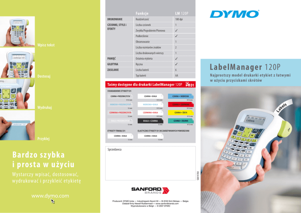 Funkcje LM 120P DRUKOWANIE Rozdzielczość 180 dpi CZCIONKI, STYLE i EFEKTY Liczba czcionek 1 Zwykła/Pogrubienie/Pionowa ✓ Podkreślenie ✓ Obramowanie 1 Liczba rozmiarów znaków 2 Liczba drukowanych wierszy 1 PAMIĘĆ Ostatnia etykieta ✓ GILOTYNA Ręczna ✓ ZASILANIE Liczba baterii 6 Typ baterii AA Wpisz tekst Dostosuj LabelManager 120P Najprostszy model drukarki etykiet z łatwymi w użyciu przyciskami skrótów Taśmy dostępne dla drukarki LabelManager 120P STANDARDOWE ETYKIETY D1 CZARNA PRZEZROCZYSTA 9/12 mm Wydrukuj NIEBIESKA PRZEZROCZYSTA 12 mm CZERWONA PRZEZROCZYSTA 12 mm BIAŁA PRZEZROCZYSTA CZARNA B IAŁA Przyklej Bardzo szybka i prosta w użyciu 9/12 mm CZARNA C ZERWONA NIEBIESKA B IAŁA 9/12 mm 9/12 mm CZARNA Ż ÓŁTA CZERWONA BIAŁA 9/12 mm BIAŁA CZARNA 12 mm ETYKIETY TRWAŁE D1 CZARNA N IEBIESKA 9/12 mm 9/12 mm CZARNA Z IELONA 12 mm 9/12 mm ELASTYCZNE ETYKIETY D1 DO ZAKRZYWIONYCH POWIERZCHNI CZARNA B IAŁA CZARNA B IAŁA 12 mm 12 mm Sprzedawca S0819780 Wystarczy wpisać, dostosować, wydrukować i przykleić etykietę Producent: DYMO bvba — Industriepark-Noord 30 — B-9100 Sint-Niklaas — Belgia Oddział firmy Newell Rubbermaid — www.sanfordbrands.com Wyprodukowano w Belgii — © 2007 DYMO LabelManager 120P Nowa drukarka Label Manager 120P posiada klawisze szybkiego dostępu do najczęściej używanych funkcji: pogrubienie, drukowanie w pionie, podkreślenie, obramowanie i rozmiar czcionki. Z całą pewnoscią jest to wielozadaniowy, choć prosty model przenośnej drukarki etykiet z klawiaturą, w rozsądnej cenie. DRUKARKA ETYKIET DLA CIEBIE KRÓTKI PRZEGLĄD FUNKCJI DRUKARKI Etykiety można naklejać na wszystko, od teczek na dokumenty po szafki w magazynie. Drukarka LabelManager 120P to trwałe i wielozadaniowe narzędzie, doskonale dopasowane do ogólnych potrzeb w biurze lub sklepie. Została zaprojektowana do intensywnej, codziennej eksploatacji. Umożliwia drukowanie profesjonalnie wyglądających etykiet w dowolnym miejscu. Mniej zgubionych dokumentów, lepsza organizacja miejsca pracy i dokładniej opisany stan magazynu to tylko niektóre efekty wykorzystania drukarki. Profesjonalne i efektywne środowisko pracy zawsze bezpośrednio wpływa na wydajność. • • • • Wyświetlacz graficzny z dokładnym podglądem etykiet. Koniec ze zgadywaniem, jak będą wyglądały gotowe etykiety. Widzisz i masz! Prosta nawigacja od menu głównego do opcji wydruku. Klawisze szybkiego dostępu do symboli i znaków diakrytycznych (np. ę, ą, ć...). Funkcja automatycznego wyłączania umożliwia oszczędzanie baterii.