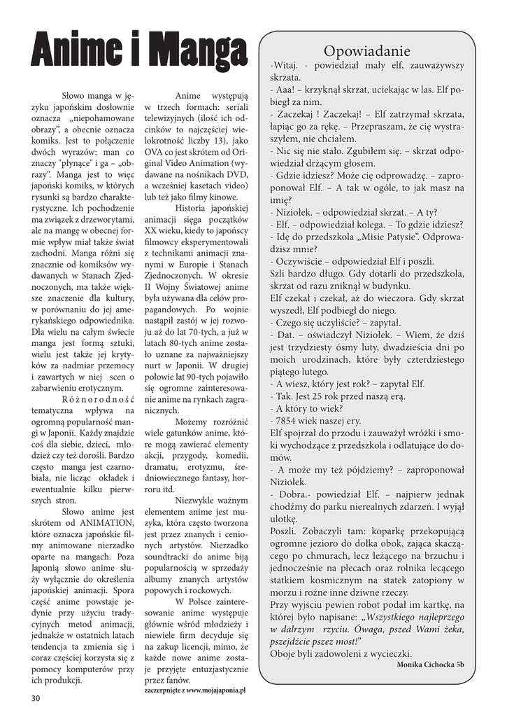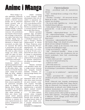 Anime i Manga Słowo manga w języku japońskim dosłownie oznacza „niepohamowane obrazy”, a obecnie oznacza komiks. Jest to połączenie dwóch wyrazów: man co znaczy "płynące" i ga – „obrazy”. Manga jest to więc japoński komiks, w których rysunki są bardzo charakterystyczne. Ich pochodzenie ma związek z drzeworytami, ale na mangę w obecnej formie wpływ miał także świat zachodni. Manga różni się znacznie od komiksów wydawanych w Stanach Zjednoczonych, ma także większe znaczenie dla kultury, w porównaniu do jej amerykańskiego odpowiednika. Dla wielu na całym świecie manga jest formą sztuki, wielu jest także jej krytyków za nadmiar przemocy i zawartych w niej scen o zabarwieniu erotycznym. Różnorodność tematyczna wpływa na ogromną popularność mangi w Japonii. Każdy znajdzie coś dla siebie, dzieci, młodzież czy też dorośli. Bardzo często manga jest czarnobiała, nie licząc okładek i ewentualnie kilku pierwszych stron. Słowo anime jest skrótem od ANIMATION, które oznacza japońskie filmy animowane nierzadko oparte na mangach. Poza Japonią słowo anime służy wyłącznie do określenia japońskiej animacji. Spora część anime powstaje jedynie przy użyciu tradycyjnych metod animacji, jednakże w ostatnich latach tendencja ta zmienia się i coraz częściej korzysta się z pomocy komputerów przy ich produkcji. 30 Anime występują w trzech formach: seriali telewizyjnych (ilość ich odcinków to najczęściej wielokrotność liczby 13), jako OVA co jest skrótem od Original Video Animation (wydawane na nośnikach DVD, a wcześniej kasetach video) lub też jako filmy kinowe. Historia japońskiej animacji sięga początków XX wieku, kiedy to japońscy filmowcy eksperymentowali z technikami animacji znanymi w Europie i Stanach Zjednoczonych. W okresie II Wojny Światowej anime była używana dla celów propagandowych. Po wojnie nastąpił zastój w jej rozwoju aż do lat 70-tych, a już w latach 80-tych anime zostało uznane za najważniejszy nurt w Japonii. W drugiej połowie lat 90-tych pojawiło się ogromne zainteresowanie anime na rynkach zagranicznych. Możemy rozróżnić wiele gatunków anime, które mogą zawierać elementy akcji, przygody, komedii, dramatu, erotyzmu, średniowiecznego fantasy, horroru itd. Niezwykle ważnym elementem anime jest muzyka, która często tworzona jest przez znanych i cenionych artystów. Nierzadko soundtracki do anime biją popularnością w sprzedaży albumy znanych artystów popowych i rockowych. W Polsce zainteresowanie anime występuje głównie wśród młodzieży i niewiele firm decyduje się na zakup licencji, mimo, że każde nowe anime zostaje przyjęte entuzjastycznie przez fanów. zaczerpnięte z www.mojajaponia.pl Opowiadanie -Witaj. - powiedział mały elf, zauważywszy skrzata. - Aaa! – krzyknął skrzat, uciekając w las. Elf pobiegł za nim. - Zaczekaj ! Zaczekaj! – Elf zatrzymał skrzata, łapiąc go za rękę. – Przepraszam, że cię wystraszyłem, nie chciałem. - Nic się nie stało. Zgubiłem się. – skrzat odpowiedział drżącym głosem. - Gdzie idziesz? Może cię odprowadzę. – zaproponował Elf. – A tak w ogóle, to jak masz na imię? - Niziołek. – odpowiedział skrzat. – A ty? - Elf. – odpowiedział kolega. – To gdzie idziesz? - Idę do przedszkola „Misie Patysie”. Odprowadzisz mnie? - Oczywiście – odpowiedział Elf i poszli. Szli bardzo długo. Gdy dotarli do przedszkola, skrzat od razu zniknął w budynku. Elf czekał i czekał, aż do wieczora. Gdy skrzat wyszedł, Elf podbiegł do niego. - Czego się uczyliście? – zapytał. - Dat. – oświadczył Niziołek. – Wiem, że dziś jest trzydziesty ósmy luty, dwadzieścia dni po moich urodzinach, które były czterdziestego piątego lutego. - A wiesz, który jest rok? – zapytał Elf. - Tak. Jest 25 rok przed naszą erą. - A który to wiek? - 7854 wiek naszej ery. Elf spojrzał do przodu i zauważył wróżki i smoki wychodzące z przedszkola i odlatujące do domów. - A może my też pójdziemy? – zaproponował Niziołek. - Dobra.- powiedział Elf. – najpierw jednak chodźmy do parku nierealnych zdarzeń. I wyjął ulotkę. Poszli. Zobaczyli tam: koparkę przekopującą ogromne jezioro do dołka obok, zająca skaczącego po chmurach, lecz leżącego na brzuchu i jednocześnie na plecach oraz rolnika lecącego statkiem kosmicznym na statek zatopiony w morzu i rożne inne dziwne rzeczy. Przy wyjściu pewien robot podał im kartkę, na której było napisane: „Wszystkiego najleprzego w dalrzym rzyciu. Ówaga, pszed Wami żeka, pszejdźcie pszez most!” Oboje byli zadowoleni z wycieczki. Monika Cichocka 5b