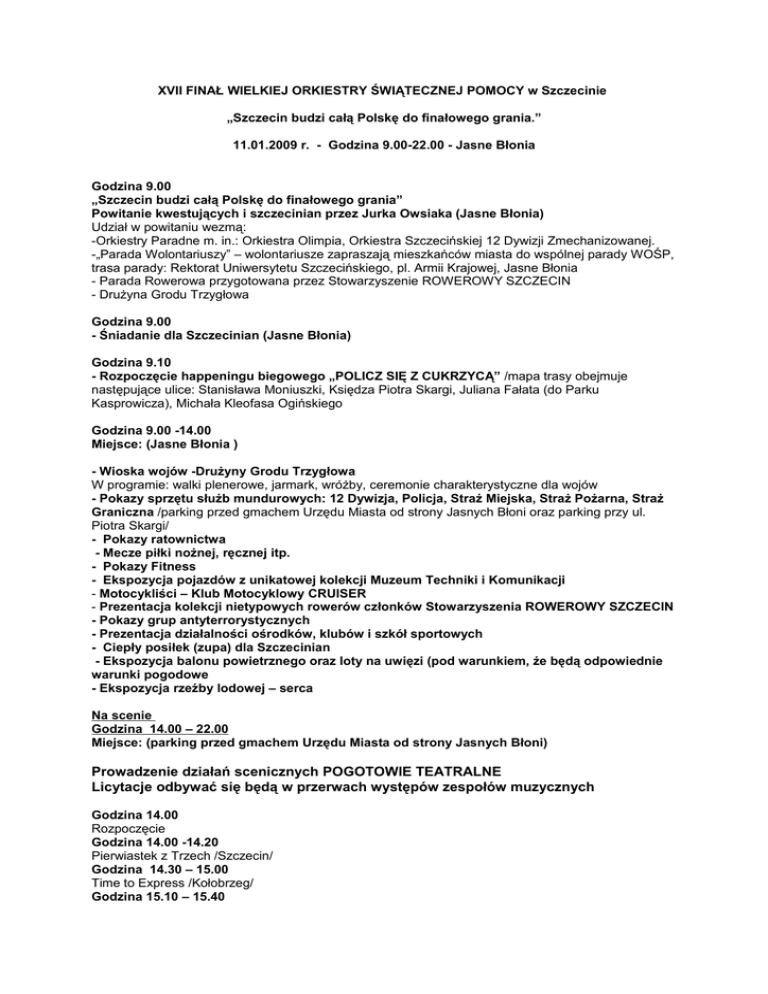 XVII FINAŁ WIELKIEJ ORKIESTRY ŚWIĄTECZNEJ POMOCY w Szczecinie „Szczecin budzi całą Polskę do finałowego grania.” 11.01.2009 r. - Godzina 9.00-22.00 - Jasne Błonia Godzina 9.00 „Szczecin budzi całą Polskę do finałowego grania” Powitanie kwestujących i szczecinian przez Jurka Owsiaka (Jasne Błonia) Udział w powitaniu wezmą: -Orkiestry Paradne m. in.: Orkiestra Olimpia, Orkiestra Szczecińskiej 12 Dywizji Zmechanizowanej. -„Parada Wolontariuszy” – wolontariusze zapraszają mieszkańców miasta do wspólnej parady WOŚP, trasa parady: Rektorat Uniwersytetu Szczecińskiego, pl. Armii Krajowej, Jasne Błonia - Parada Rowerowa przygotowana przez Stowarzyszenie ROWEROWY SZCZECIN - Drużyna Grodu Trzygłowa Godzina 9.00 - Śniadanie dla Szczecinian (Jasne Błonia) Godzina 9.10 - Rozpoczęcie happeningu biegowego „POLICZ SIĘ Z CUKRZYCĄ” /mapa trasy obejmuje następujące ulice: Stanisława Moniuszki, Księdza Piotra Skargi, Juliana Fałata (do Parku Kasprowicza), Michała Kleofasa Ogińskiego Godzina 9.00 -14.00 Miejsce: (Jasne Błonia ) - Wioska wojów -Drużyny Grodu Trzygłowa W programie: walki plenerowe, jarmark, wróżby, ceremonie charakterystyczne dla wojów - Pokazy sprzętu służb mundurowych: 12 Dywizja, Policja, Straż Miejska, Straż Pożarna, Straż Graniczna /parking przed gmachem Urzędu Miasta od strony Jasnych Błoni oraz parking przy ul. Piotra Skargi/ - Pokazy ratownictwa - Mecze piłki nożnej, ręcznej itp. - Pokazy Fitness - Ekspozycja pojazdów z unikatowej kolekcji Muzeum Techniki i Komunikacji - Motocykliści – Klub Motocyklowy CRUISER - Prezentacja kolekcji nietypowych rowerów członków Stowarzyszenia ROWEROWY SZCZECIN - Pokazy grup antyterrorystycznych - Prezentacja działalności ośrodków, klubów i szkół sportowych - Ciepły posiłek (zupa) dla Szczecinian - Ekspozycja balonu powietrznego oraz loty na uwięzi (pod warunkiem, że będą odpowiednie warunki pogodowe - Ekspozycja rzeźby lodowej – serca Na scenie Godzina 14.00 – 22.00 Miejsce: (parking przed gmachem Urzędu Miasta od strony Jasnych Błoni) Prowadzenie działań scenicznych POGOTOWIE TEATRALNE Licytacje odbywać się będą w przerwach występów zespołów muzycznych Godzina 14.00 Rozpoczęcie Godzina 14.00 -14.20 Pierwiastek z Trzech /Szczecin/ Godzina 14.30 – 15.00 Time to Express /Kołobrzeg/ Godzina 15.10 – 15.40 Skambomambo /Szczecin/ Godzina 15.50 – 16.20 Big Fat Mama /Szczecin/ Godzina 16.30 – 17.10 Free Blues Band & Agata Malcherek /Szczecin/ Godzina 17.20 – 18.20 Kasia Cerekwicka /Warszawa/ Godzina 18.30 – 19.30 Rh + /Wrocław/ Godzina 19.30- AUKCJA DNIA Godzina 19.45 – 20.45; Zakopower /Zakopane, Nowy Targ/ ok. Godziny 20.00 Światełko do nieba – pokaz laserowy Pokaz tańca w wykonaniu Finalisty programu YOU CAN DANCE – Michała Pawłowskiego Godzina 21.00 – 22.00 Coma /Łódź/ Godzina 22.00 Zakończenie imprezy W godz. 16.00 – 22.00 – oświetlenie architektoniczne gmachu Urzędu Miasta Szczecin Przez cały dzień imprezy licytacje przedmiotów w budynku Filharmonii Szczecińskiej