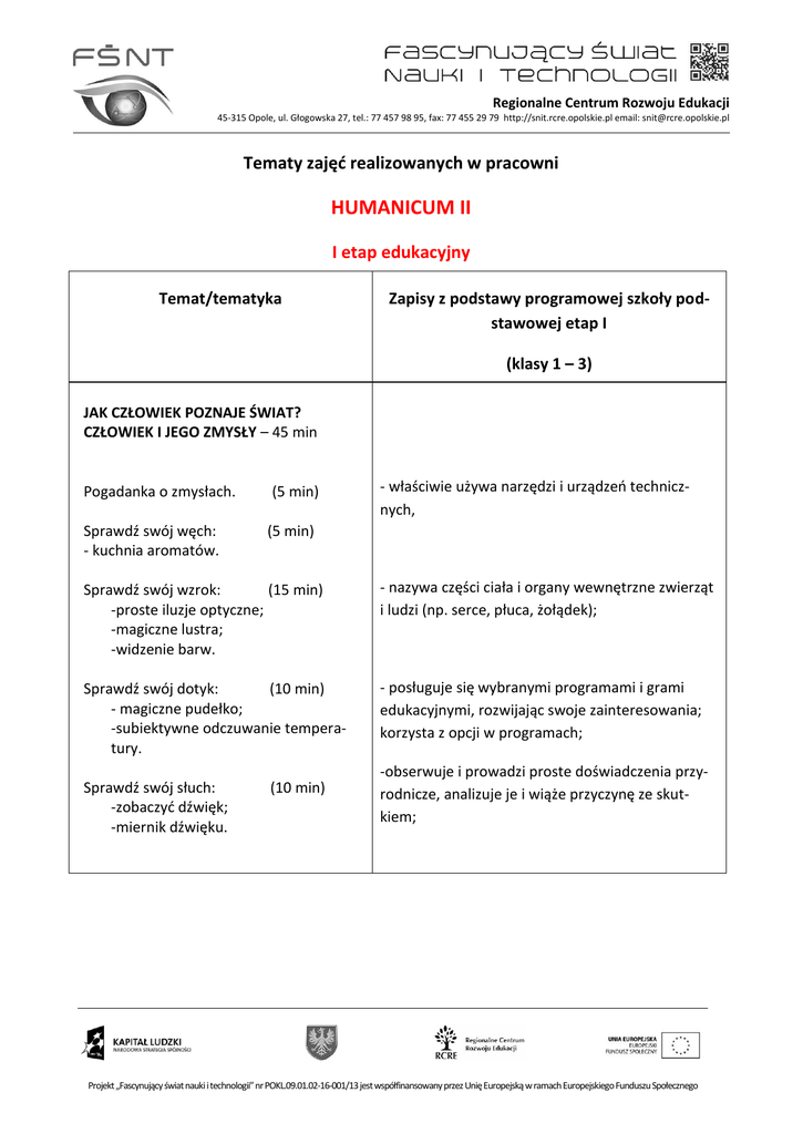 Regionalne Centrum Rozwoju Edukacji 45-315 Opole, ul. Głogowska 27, tel.: 77 457 98 95, fax: 77 455 29 79 http://snit.rcre.opolskie.pl email: [email protected] Tematy zajęć realizowanych w pracowni HUMANICUM II I etap edukacyjny Temat/tematyka Zapisy z podstawy programowej szkoły podstawowej etap I (klasy 1 – 3) JAK CZŁOWIEK POZNAJE ŚWIAT? CZŁOWIEK I JEGO ZMYSŁY – 45 min Pogadanka o zmysłach. (5 min) Sprawdź swój węch: - kuchnia aromatów. (5 min) - właściwie używa narzędzi i urządzeń technicznych, Sprawdź swój wzrok: (15 min) -proste iluzje optyczne; -magiczne lustra; -widzenie barw. - nazywa części ciała i organy wewnętrzne zwierząt i ludzi (np. serce, płuca, żołądek); Sprawdź swój dotyk: (10 min) - magiczne pudełko; -subiektywne odczuwanie temperatury. - posługuje się wybranymi programami i grami edukacyjnymi, rozwijając swoje zainteresowania; korzysta z opcji w programach; Sprawdź swój słuch: -zobaczyć dźwięk; -miernik dźwięku. (10 min) -obserwuje i prowadzi proste doświadczenia przyrodnicze, analizuje je i wiąże przyczynę ze skutkiem; Projekt „Fascynujący świat nauki i technologii” nr POKL.09.01.02-16-001/13 jest współfinansowany przez Unię Europejską w ramach Europejskiego Funduszu Społecznego Regionalne Centrum Rozwoju Edukacji 45-315 Opole, ul. Głogowska 27, tel.: 77 457 98 95, fax: 77 455 29 79 http://snit.rcre.opolskie.pl email: [email protected] II etap edukacyjny Temat/tematyka Zapisy z podstawy programowej szkoły podstawowej etap II (klasy 4 – 6) JAK CZŁOWIEK POZNAJE ŚWIAT? CZŁOWIEK I JEGO ZMYSŁY – 45 min Pogadanka o zmysłach. (5 min) Sprawdź swój węch: - kuchnia aromatów. (5 min) Sprawdź swój wzrok: (15 min) -proste iluzje optyczne; -magiczne lustra; -widzenie barw; -alfabet Braille’a; -alkogogle; -test na daltonizm; Sprawdź swój dotyk: (10 min) - magiczne pudełko; -subiektywne odczuwanie temperatury. Sprawdź swój słuch: -zobaczyć dźwięk -miernik dźwięku. - uważnie słucha wypowiedzi i korzysta z przekazywanych informacji; - nazywa zmysły człowieka i wyjaśnia ich rolę w poznawaniu przyrody, stosuje zasady bezpieczeństwa podczas obserwacji przyrodniczych; - opisuje rolę zmysłów w odbieraniu wrażeń ze środowiska zewnętrznego; - charakteryzuje podstawowe zasady ochrony narządów wzroku i słuchu; (10 min) Str. 2 Projekt „Fascynujący świat nauki i technologii” nr POKL.09.01.02-16-001/13 jest współfinansowany przez Unię Europejską w ramach Europejskiego Funduszu Społecznego