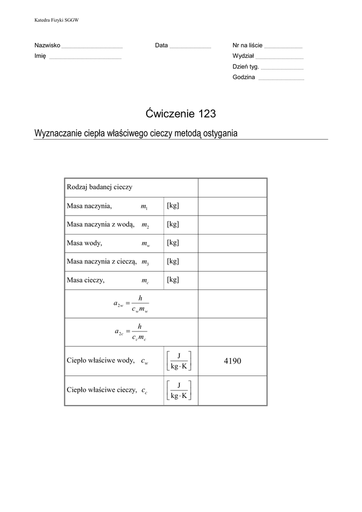 123 – instrukcja ćwiczenia: Wyznaczanie ciepła właściwego cieczy