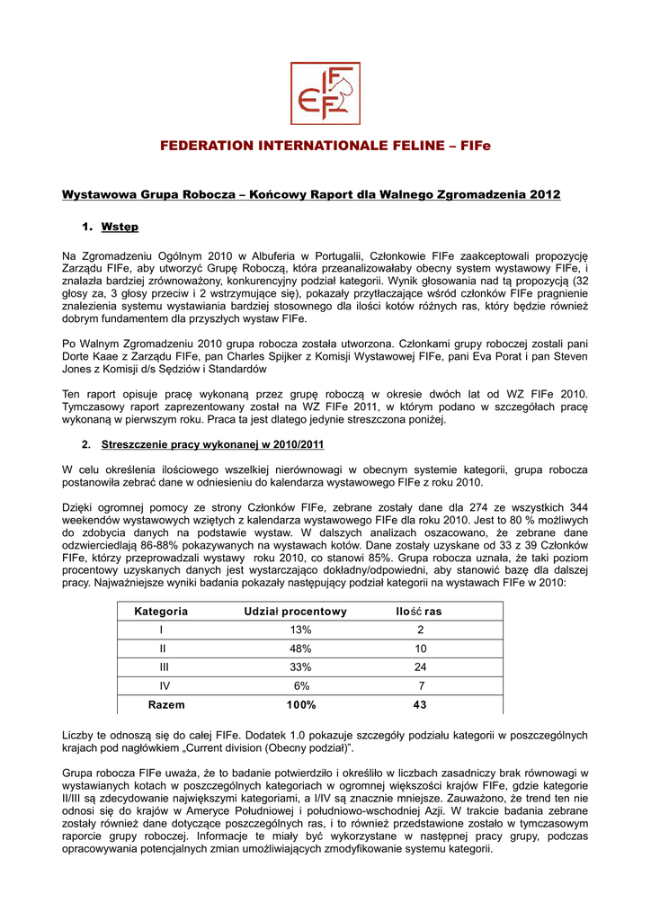 FEDERATION INTERNATIONALE FELINE – FIFe Wystawowa Grupa Robocza – Końcowy Raport dla Walnego Zgromadzenia 2012 1. Wstęp Na Zgromadzeniu Ogólnym 2010 w Albuferia w Portugalii, Członkowie FIFe zaakceptowali propozycję Zarządu FIFe, aby utworzyć Grupę Roboczą, która przeanalizowałaby obecny system wystawowy FIFe, i znalazła bardziej zrównoważony, konkurencyjny podział kategorii. Wynik głosowania nad tą propozycją (32 głosy za, 3 głosy przeciw i 2 wstrzymujące się), pokazały przytłaczające wśród członków FIFe pragnienie znalezienia systemu wystawiania bardziej stosownego dla ilości kotów różnych ras, który będzie również dobrym fundamentem dla przyszłych wystaw FIFe. Po Walnym Zgromadzeniu 2010 grupa robocza została utworzona. Członkami grupy roboczej zostali pani Dorte Kaae z Zarządu FIFe, pan Charles Spijker z Komisji Wystawowej FIFe, pani Eva Porat i pan Steven Jones z Komisji d/s Sędziów i Standardów Ten raport opisuje pracę wykonaną przez grupę roboczą w okresie dwóch lat od WZ FIFe 2010. Tymczasowy raport zaprezentowany został na WZ FIFe 2011, w którym podano w szczegółach pracę wykonaną w pierwszym roku. Praca ta jest dlatego jedynie streszczona poniżej. 2. Streszczenie pracy wykonanej w 2010/2011 W celu określenia ilościowego wszelkiej nierównowagi w obecnym systemie kategorii, grupa robocza postanowiła zebrać dane w odniesieniu do kalendarza wystawowego FIFe z roku 2010. Dzięki ogromnej pomocy ze strony Członków FIFe, zebrane zostały dane dla 274 ze wszystkich 344 weekendów wystawowych wziętych z kalendarza wystawowego FIFe dla roku 2010. Jest to 80 % możliwych do zdobycia danych na podstawie wystaw. W dalszych analizach oszacowano, że zebrane dane odzwierciedlają 86-88% pokazywanych na wystawach kotów. Dane zostały uzyskane od 33 z 39 Członków FIFe, którzy przeprowadzali wystawy roku 2010, co stanowi 85%. Grupa robocza uznała, że taki poziom procentowy uzyskanych danych jest wystarczająco dokładny/odpowiedni, aby stanowić bazę dla dalszej pracy. Najważniejsze wyniki badania pokazały następujący podział kategorii na wystawach FIFe w 2010: Kategoria Udzia ł procentowy Ilo ść ras I 13% 2 II 48% 10 III 33% 24 IV 6% 7 Razem 100% 43 Liczby te odnoszą się do całej FIFe. Dodatek 1.0 pokazuje szczegóły podziału kategorii w poszczególnych krajach pod nagłówkiem „Current division (Obecny podział)”. Grupa robocza FIFe uważa, że to badanie potwierdziło i określiło w liczbach zasadniczy brak równowagi w wystawianych kotach w poszczególnych kategoriach w ogromnej większości krajów FIFe, gdzie kategorie II/III są zdecydowanie największymi kategoriami, a I/IV są znacznie mniejsze. Zauważono, że trend ten nie odnosi się do krajów w Ameryce Południowej i południowo-wschodniej Azji. W trakcie badania zebrane zostały również dane dotyczące poszczególnych ras, i to również przedstawione zostało w tymczasowym raporcie grupy roboczej. Informacje te miały być wykorzystane w następnej pracy grupy, podczas opracowywania potencjalnych zmian umożliwiających zmodyfikowanie systemu kategorii. FEDERATION INTERNATIONALE FELINE – FIFe Po zebraniu danych, grupa robocza przeszła do następnego etapu badań. W tej fazie grupa próbowała określić wszystkie możliwe rozwiązania umożliwiające modyfikację systemu kategorii FIFe, w wyniku czego mielibyśmy bardziej zrównoważony system. Wykorzystano metodę „burzy mózgów”, i na tym etapie nie stawiano żadnych ograniczeń co do proponowanych pomysłów. Rezultatem był zbiór pomysłów od utrzymania i dostosowania istniejącego systemu czterech kategorii, aż do systemu zupełnie bez kategorii. Szczegóły i konsekwencje burzy mózgów nie były oceniane na tym etapie. Pomysły poszczególnych członków grupy roboczej były również zaprezentowane w raporcie tymczasowym grupy roboczej. 3. Walne Zgromadzenie FIFe 2011 Tymczasowy raport grupy roboczej zaprezentowany został na Walnym Zgromadzeniu FIFe 2011 w Bukareszcie, i zawarty jest w Aneksach do Protokołu WZ. Przyjęcie tymczasowego raportu przez WZ dało grupie roboczej mandat do dalszej pracy na następny rok. Dodatkowo, niektóre z propozycji Członków FIFe odnoszące się do modyfikacji kategorii, zostały włączone do dalszej pracy grupy roboczej. Co więcej, już po WZ, grupa robocza otrzymała dalsze propozycje/pomysły od innych Członków FIFe, które również zostały włączone do pracy. 4. Praca wykonana w 2011/2012 Po Walnym Zgromadzeniu w roku 2011, Wystawowa Grupa Robocza szczegółowo analizowała dane na temat wystaw FIFe i utworzyła krótka listę potencjalnych systemów kategorii, które wydawały się spełniać wymagania stawiane bardziej zrównoważonemu systemowi kategorii. Na liście umieszczono 4 propozycje, przedstawione poniżej: a. System dwóch kategorii, które powstałyby z połączenia istniejących kategorii I i II, oraz III i IV. b. System dwóch kategorii opartych ściśle na zasadzie długi włos / krótki włos. c. System trzech kategorii opartych na przesunięciu ras ocenianych w kolorach z istniejącej II (RAG/SBI/TUV) do istniejącej kategorii I, i połączeniu kategorii III i IV. kategorii d. System trzech kategorii oparty na przeniesieniu ras ocenianych w kolorach z II i BRI/CYM/MAN do istniejącej kategorii I, i połączenie istniejących kategorii III i IV. kategorii istniejącej Tabela poniżej opisuje liczby ras i szacowanej ilości kotów w nowych kategoriach dla każdej opcji (oparte na badaniach wystaw FIFe w roku 2010): KATEGORIA I KATEGORIA II KATEGORIA III rasy % kotów rasy % kotów rasy % kotów a. 12 61% 31 39% - - b. 16 59% 27 41% - - c. 5 25% 7 36% 31 39% d. 8 37% 7 35% 28 28% Opcja Wystawowa Grupa Robocza zauważyła również, że zredukowana liczba kategorii dawałaby możliwość rozszerzenia opcji BIS, i przedstawiła trzy rozwiązania dodatków do rywalizacji w BIS. FEDERATION INTERNATIONALE FELINE