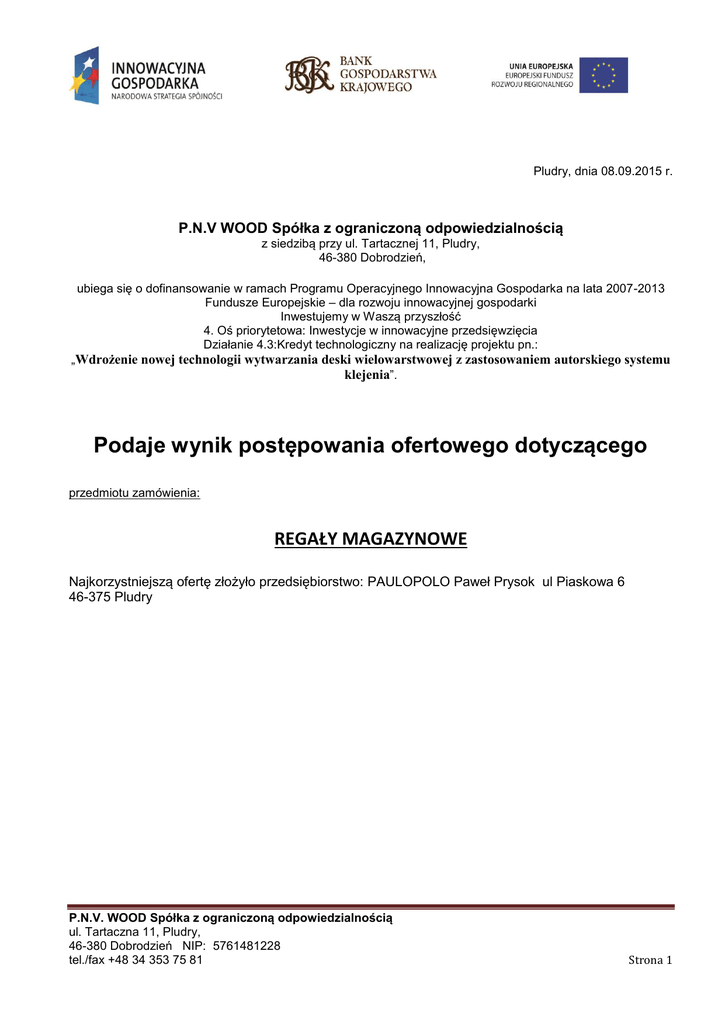 Pludry, dnia 08.09.2015 r. P.N.V WOOD Spółka z ograniczoną odpowiedzialnością z siedzibą przy ul. Tartacznej 11, Pludry, 46-380 Dobrodzień, ubiega się o dofinansowanie w ramach Programu Operacyjnego Innowacyjna Gospodarka na lata 2007-2013 Fundusze Europejskie – dla rozwoju innowacyjnej gospodarki Inwestujemy w Waszą przyszłość 4. Oś priorytetowa: Inwestycje w innowacyjne przedsięwzięcia Działanie 4.3:Kredyt technologiczny na realizację projektu pn.: „Wdrożenie nowej technologii wytwarzania deski wielowarstwowej z zastosowaniem autorskiego systemu klejenia”. Podaje wynik postępowania ofertowego dotyczącego przedmiotu zamówienia: REGAŁY MAGAZYNOWE Najkorzystniejszą ofertę złożyło przedsiębiorstwo: PAULOPOLO Paweł Prysok ul Piaskowa 6 46-375 Pludry P.N.V. WOOD Spółka z ograniczoną odpowiedzialnością ul. Tartaczna 11, Pludry, 46-380 Dobrodzień NIP: 5761481228 tel./fax +48 34 353 75 81 Strona 1