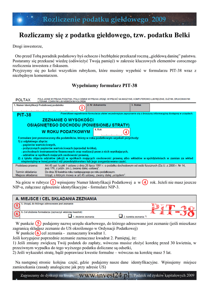Rozliczenie podatku giełdowego 2009 Rozliczamy się z podatku giełdowego, tzw. podatku Belki Drogi inwestorze, Oto przed Tobą poradnik podatkowy byś ochoczo i bezbłędnie przekazał roczną „giełdową daninę” państwu. Postaramy się przekazać wiedzę (odświeŜyć Twoją pamięć) w zakresie kluczowych elementów corocznego rozliczenia inwestora z fiskusem. Przyjrzymy się po kolei wszystkim rubrykom, które musimy wypełnić w formularzu PIT-38 wraz z niezbędnym komentarzem. Wypełniamy formularz PIT-38 1 4 Na górze w rubryce 1 wpisujemy Numer Identyfikacji Podatkowej a w 4 rok. JeŜeli nie masz jeszcze NIP-u, załączasz zgłoszenie identyfikacyjne - formularz NIP-3. 5 6 W punkcie 5 podajemy nazwę urzędu skarbowego, do którego adresowane jest zeznanie (jeśli mieszkasz zagranicą składasz zeznanie do US określonego w Ordynacji Podatkowej) W punkcie 6 cel zeznania - zaznaczamy kwadrat 1. Jeśli korygujesz poprzednie zeznanie zaznaczasz kwadrat 2. Pamiętaj, Ŝe: 1) Jeśli zmiany zwiększą Twój podatek do zapłaty, wówczas musisz złoŜyć korektę przed 30 kwietnia, w przeciwnym wypadku do tego wyŜszego podatku doliczane są odsetki, 2) Jeśli wykazałeś stratę, bądź poprawiasz kwestie formalne – wówczas na korektę masz 5 lat. Na następnej stronie kolejna część, gdzie podajemy nasze dane identyfikacyjne. Wpisujemy miejsce zamieszkania (zasady analogiczne jak przy adresie US) Zapraszamy do dyskusji na forum www.invest24.pl Podatek od zysków kapitałowych 2009 Rozliczenie podatku giełdowego 2009 W części C wykazujemy kwoty przychodów, koszty ich uzyskania, oraz wyliczamy dochód (stratę): 21 poz. 53 z PIT-8C poz. 54 z PIT-8C 22 23 24 28 27 Wypełniamy tę część na podstawie informacji zawartych w PIT-8C przesłanym nam przez biuro maklerskie, w którym mamy rachunek (DM z reguły nadsyłają takie informacje na przełomie lutego i marca). Zwracajmy teŜ uwagę, czy w wyliczeniach dostarczonych przez DM nie ma pomyłek. PoniŜej fragment PIT-8C z wykorzystywanymi informacjami: 21 22 53 54 W punkcie 21 wpisujemy sumę kwot z poz. 53 informacji PIT-8C. W punkcie 22 suma kwot z poz. 54 PIT-8C (z wszystkich biur maklerskich, w których mamy rachunek) W pozycji 23 naleŜy wykazać przychody: 1) z części F informacji PIT-8C, oprócz tych, które są zwolnienie z podatku Belki, 2) uzyskane za granicą. Zapraszamy do dyskusji na forum www.invest24.pl Podatek od zysków kapitałowych 2009 Rozliczenie podatku giełdowego 2009 W pozycji 24 wpisujemy koszty uzyskania przychodów wymienionych w punkcie 23. Koszty uzyskania przychodu to wydatki na nabycie papierów wartościowych (cena razy ich ilość) oraz poniesione w związku z np. obsługą rachunku przez biuro maklerskie (prowizje zapłacone przy kupnie i sprzedaŜy papierów wartościowych, prowadzenie, załoŜenie rachunku, transferu walorów do innego DM, zdeponowania papierów, itp.). Dochód wpisujemy w pozycji 27 , stratę w pozycji 28 . Przechodzimy teraz do części D PIT-38: 29 30 31 32 33 34 Pozycje 29 wypełniają osoby, które w latach 2003-2007 wykazały straty i w 2008 r. mają prawo do odliczenia straty z lat ubiegłych (strata moŜe być odliczana przez okres kolejnych 5 lat, z tymŜe, w kaŜdym roku nie moŜe być to więcej niŜ 50 proc. tej kwoty). Kwota z pozycji 29 nie moŜe przekroczyć kwoty z pozycji 27. Pozycja 30 jest to podstawa obliczenia podatku. Jest kwota z pozycji 27 pomniejszona o straty wykazane w pozycji 29 (po zaokrągleniu do pełnych złotych). Podstawę obliczenia podatku zaokrągla się do pełnych złotych w ten sposób, Ŝe końcówki kwot wynoszące mniej niŜ 50 groszy pomija się, a końcówki kwot wynoszące 50 i więcej groszy podwyŜsza się do pełnych złotych. Pozycja 31 , stawka podatku wynosi – 19%. Kwotę z pozycji 30 mnoŜymy przez 0,19 (stawka z pozycji 31) Pozycja 32 2 to podatek od dochodów, o których mowa w art. 30b ustawy Pozycja 33 dotyczy podatku zapłaconego za granicą, przeliczonego na złote). Wiersz ten wypełniają podatnicy, którzy uzyskali dochody za granicą lub na terytorium RP i za granicą. Wpisujemy tam podatek zapłacony zagranicą podlegający odliczeniu w zeznaniu PIT-38. W pozycji 34 naleŜy wykazać dodatkowy podatek zapłacony za granicą, o którym mowa w art. 30b ust. 5c ustawy, przeliczony na złote. Przechodzimy teraz na następną stronę naszego PIT-38: 35 36 W punkcie 35 35 wpisujemy podatek, po zaokrągleniu do pełnych złotych (zasady zaokrąglania jak powyŜej). W pozycji 36 36 naleŜy wpisać róŜnicę pomiędzy podatkiem zapłaconym za granicą a podatkiem od dochodów. Przechodzimy teraz do części E, w której dokonujemy obliczenia kwoty do zapłaty albo nadpłaty. Odpowiedni fragment PIT-38 na następnej stronie. Pozycje 37 37 wypełniają podatnicy, którzy mają podatek od dochodu z odpłatnego zbycia nieruchomości lub praw majątkowych, o których mowa w art. 10 ust. 1 pkt 8 lit.a-c ustawy (lata 2007-2008). Podatek ten płatny jest w terminie złoŜenia zeznania za rok, w którym nastąpiło zbycie. Zapraszamy do dyskusji na forum www.invest24.pl Podatek od zysków kapitałowych 2009 Rozliczenie podatku giełdowego 2009 W pozycji 38 38 naleŜy wykazać podatek (jeszcze nie pobrany), z wyjątkiem tego, który dotyczy przychodów uzyskanych za granicą z wszelkiego rodzaju odsetek, oraz wykazanego w poz. 40-41 i w części F. Kwotę tego podatku oblicza się mnoŜąc przychód przez odpowiednią dla niego stawkę podatku, określoną w ustawie (umowie) o unikaniu podwójnego opodatkowania. Przykładowo: przychód uzyskany z tytułu otrzymanych odsetek od poŜyczki udzielonej osobie fizycznej niebędącej przedsiębiorcą naleŜy pomnoŜyć przez stawkę podatku w wysokości 19%. Kwotę z pozycji 44 naleŜy wpłacić w terminie określonym dla złoŜenia zeznania za rok podatkowy. 37 38 44 Przechodzimy do kolejnej części F dotyczącej zryczałtowanego podatku dochodowego, o którym mowa w art. 44