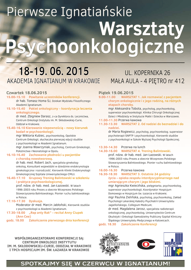 Pierwsze Ignatiańskie Warsztaty Psychoonkologiczne 18-19. 06. 2015 Akademia Ignatianum w Krakowie Czwartek 18.06.2015 15.00-15.10 Powitanie uczestników konferencji. dr hab. Tomasz Homa SJ, Dziekan Wydziału Filozoficznego Akademii Ignatianum. 15.10-15.40 Pakiet onkologiczny – koordynacja leczenia onkologicznego. dr med. Zbigniew Darasz, z-ca Dyrektora ds. Lecznictwa, Centrum Onkologii Instytutu im. M. Skłodowskiej-Curie, Oddział w Krakowie. 15.40-16.10 Kierowanie niepewnością – nowy kierunek badań w psychoonkologii. mgr Wiktoria Kubiec, psychoonkolog, Opolskie Centrum Onkologii, słuchaczka pierwszej edycji studiów z psychoonkologii w Akademii Ignatianum. mgr Joanna Wawrzyniak, psycholog, Centrum Ginekologii, Położnictwa i Neonatologii w Opolu. 16.10-16.40 Zachowanie płodności u pacjentów z chorobą nowotworową. dr hab. med. Robert Jach, specjalista ginekolog- onkolog, Konsultant wojewódzki w dziedzinie endokrynologia ginekologiczna i rozrodczość. Kierownik Kliniki Endokrynologii Ginekologicznej Szpitala Uniwersyteckiego CMUJ. 16.40-17.10 Grupowy Trening Balintowski w szkoleniu i praktyce psychoonkologicznej. prof. ndzw. dr hab. med. Jan Łazowski. W latach Piątek 19.06.2015 9.00-11.00 WARSZTAT 1. Jak rozmawiać z pacjentem chorym onkologicznie i z jego rodziną, na różnych etapach choroby. mgr Aleksandra Tobota, psycholog, psychoonkolog, superwizor psychoonkologii. Klinika Chirurgii Onkologicznej Dzieci i Młodzieży w Instytucie Matki i Dziecka w Warszawie. 11.00-11.30 Przerwa kawowa 11.30-13.30 WARSZTAT 2. Od nadziei do beznadziei i do nadziei. dr Maria Rogiewicz, psycholog, psychoonkolog. superwizor psychoterapii SNPTP i psychoonkologii. Kierownik studiów z psychoonkologii w Szkole Wyższej Psychologii Społecznej. 13.30-14.30 Przerwa na lunch 14.30-16.00 WARSZTAT 4. Trening Balintowski. prof. ndzw. dr hab. med. Jan Łazowski. W latach 1996-2003 roku Prezes a obecnie Wiceprezes Polskiego Stowarzyszenia Balintowskiego. Pionier ruchu balintowskiego w Polsce. 16.00-16.30 Przerwa kawowa 16.30-18.30 WARSZTAT 3. Ostatnie 24 godziny życia – opieka zespołu interdyscyplinarnego nad umierającym chorym i jego bliskimi. mgr Agnieszka Kwiecińska, pielęgniarka, psychoonkolog, 1996-2003 roku Prezes a obecnie Wiceprezes Polskiego Stowarzyszenia Balintowskiego. Pionier ruchu balintowskiego w Polsce. z psychoonkologii w Akademii Ignatianum. 17.10-17.30Dyskusja. Moderator dr med. Marcin Jabłoński, Kierownik studiów 17.30-18.00 „Rap anty Rak” – recital Anny Ciupek (Ann Cee) godz. 18.00 Zakończenie pierwszego dnia konferencji ul. Kopernika 26 mała Aula - 4 piętro nr 412 superwizor psychoonkologii, Koordynator Hospicjum Domowego w Hospicjum św. Łazarza w Krakowie; mgr Paulina Zielińska, psycholog, psychoonkolog, Zakład Psychologii Lekarskiej Katedry Psychiatrii Uniwersytetu Jagiellońskiego, Collegium Medicum; dr med. Magdalena Jarosz, specjalista radioterapii onkologicznej, psychoonkolog, Uniwersyteckie Centrum Okulistyki i Onkologii Samodzielny Publiczny Szpital Kliniczny Śląskiego Uniwersytetu Medycznego w Katowicach. godz. 18.30 Zakończenie Konferencji Współorganizatorami konferencji są: Centrum Onkologii Instytutu im. M. Skłodowskiej-Curie, Oddział w Krakowie i TPCh Hospicjum im. św. Łazarza w Krakowie SPOTKAJMY SIĘ W CZERWCU W IGNATIANUM!