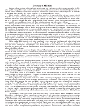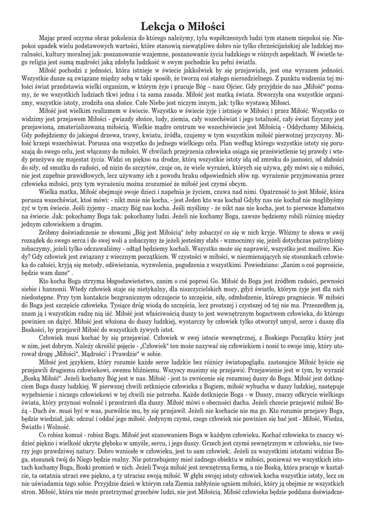 Lekcja o Mi∏oÊci Majàc przed oczyma obraz pokolenia do którego nale˝ymy, tylu wspó∏czesnych ludzi tym stanem niepokoi si´. Niepokoi upadek wielu podstawowych wartoÊci, które stanowià niewàtpliwe dobro nie tylko chrzeÊcijaƒskiej ale ludzkiej moralnoÊci, kultury moralnej jak: poszanowanie wzajemne, poszanowanie ˝ycia ludzkiego w ró˝nych aspektach. W Êwietle tego religia jest sumà màdroÊci jakà zdoby∏a ludzkoÊç w swym pochodzie ku pe∏ni Êwiat∏a. Mi∏oÊç pochodzi z jednoÊci, która istnieje w Êwiecie jakkolwiek by si´ przejawia∏a, jest ona wyrazem jednoÊci. Wszystkie dusze sà zwiàzane mi´dzy sobà w taki sposób, ˝e tworzà coÊ sta∏ego nierozdzielnego. Z punktu widzenia tej mi∏oÊci Êwiat przedstawia wielki organizm, w którym ˝yje i pracuje Bóg – nasz Ojciec. Gdy przyjdzie do nas „Mi∏oÊç“ poznamy, ˝e we wszystkich ludziach tkwi jedna i ta sama zasada. Mi∏oÊç jest matkà Êwiata. Stworzy∏a ona wszystkie organizmy, wszystkie istoty, zrodzi∏a ona s∏oƒce. Ca∏e Niebo jest niczym innym, jak: tylko wystawà Mi∏osci. Mi∏oÊç jest wielkim realizmem w Êwiecie. Wszystko w Êwiecie ˝yje i istnieje w Mi∏oÊci i przez Mi∏oÊç. Wszystko co widzimy jest przejawem Mi∏oÊci - gwiazdy s∏oƒce, ludy, ziemia, ca∏y wszechÊwiat i jego totalnoÊç, ca∏y Êwiat fizyczny jest przejawionà, zmaterializowanà mi∏oÊcià. Wielkie màdre centrum we wszechÊwiecie jest Mi∏oÊcià - Oddychamy Mi∏oÊcià. Gdy podejdziemy do jakiegoÊ drzewa, trawy, kwiatu, êród∏a, czujemy w tym wszystkim mi∏oÊç pierwotnej przyczyny. Mi∏oÊç krzepi wszechÊwiat. Porusza ona wszystko do jednego wielkiego celu. Plan wed∏ug którego wszystkie istoty si´ poruszajà do swego celu, jest w∏àczony do mi∏oÊci. W chwilach przejrzenia cz∏owieka osiàga si´ przeÊwietlenie tej prawdy i wtedy prze˝ywa si´ majestat ˝ycia. Widzi on pi´kno na drodze, którà wszystkie istoty idà od zmroku do jasnoÊci, od s∏aboÊci do si∏y, od smutku do radoÊci, od nizin do szczytów, czuje on, ˝e wiele wyra˝eƒ, których si´ u˝ywa, gdy mówi si´ o mi∏oÊci, nie jest zupe∏nie prawid∏owych, lecz u˝ywamy ich z powodu braku odpowiednich s∏ów np. wyra˝enie przyjmowania przez cz∏owieka mi∏oÊci, przy tym wyra˝eniu mo˝na zrozumieç ˝e mi∏oÊç jest czymÊ obcym. Wielka matka, Mi∏oÊç obejmuje swoje dzieci i nape∏nia je ˝yciem, czuwa nad nimi. OpatrznoÊç to jest Mi∏oÊç, która porusza wszechÊwiat, ktoÊ mówi: - nikt mnie nie kocha, - jest Jeden kto was kocha∏ Gdyby nas nie kocha∏ nie moglibyÊmy ˝yç w tym Êwiecie. JeÊli ˝yjemy - znaczy Bóg nas kocha. JeÊli myÊlimy - ˝e nikt nas nie kocha, jest to pierwsze k∏amstwo na Êwiecie. Jak: pokochamy Boga tak: pokochamy ludzi. Je˝eli nie kochamy Boga, zawsze b´dziemy robili ró˝nic´ mi´dzy jednym cz∏owiekiem a drugim. Zróbmy doÊwiadczenie ze s∏owami „Bóg jest Mi∏oÊcià“ ˝eby zobaczyç co si´ w nich kryje. W∏ó˝my te s∏owa w swój rozsàdek do swego serca i do swej woli a zobaczymy ˝e je˝eli jesteÊmy s∏abi - wzmocnimy si´, je˝eli dotychczas patrzyliÊmy zobaczymy, je˝eli tylko odczuwaliÊmy - odtàd b´dziemy kochali. Wszystko mo˝e si´ naprawiç, wszystko jest mo˝liwe. Kiedy? Gdy cz∏owiek jest zwiàzany z wiecznym poczàtkiem. W czystoÊci w mi∏oÊci, w niezmienajàcych si´ stosunkach cz∏owieka do ca∏oÊci, kryjà si´ metody, odÊwie˝ania, wyzwolenia, pogodzenia z wszystkimi. Powiedziano: „Zanim o coÊ poprosicie, b´dzie wam dane“ . Kto kocha Boga otrzyma b∏ogos∏awieƒstwo, zanim o coÊ poprosi Go. Mi∏oÊç do Boga jest êród∏em radoÊci, pewnoÊci siebie i hannonii. Wtedy cz∏owiek staje si´ nietykalny, dla niszczycielskich mocy, gdy˝ Êwiat∏o, którym ˝yje jest dla nich niedost´pne. Przy tym kontakcie bezgranicznym odczujecie to szcz´Êcie, si∏´, odm∏odzenie, którego pragniecie. W mi∏oÊci do Boga jest szcz´Êcie cz∏owieka. Tysiàce dróg wiodà do szcz´Êcia, lecz prostszej i czystszej od tej nie ma. Przeszed∏em jà, znam jà i wszystkim radz´ nià iÊç. Mi∏oÊç jest w∏aÊciwoÊcià duszy to jest wewn´trznym bogactwem cz∏owieka, do którego powinien on dà˝yç. Mi∏oÊç jest w∏o˝ona do duszy ludzkiej, wystarczy by cz∏owiek tylko otworzy∏ umys∏, serce i dusz´ dla BoskoÊci, by przejawi∏ Mi∏oÊç do wszystkich ˝ywych istot. Cz∏owiek musi kochaç by si´ przejawiaç. Cz∏owiek w swej istocie wewn´trznej, z Boskiego Poczàtku który jest w nim, jest dobrym. Nale˝y okreÊliç poj´cie - „Cz∏owiek“ ten mo˝e nazywaç si´ cz∏owiekiem i nosiç to swoje imi´, który utorowa∏ drog´ „Mi∏oÊci“, MàdroÊci' i Prawdzie“ w sobie. Mi∏oÊç jest j´zykiem, który rozumie ka˝de serce ludzkie bez ró˝nicy Êwiatopoglàdu. zastosujcie Mi∏oÊç byÊcie si´ przejawili drugiemu cz∏owiekowi, swemu bliêniemu. Wszyscy musimy si´ przejawiç. Przejawienie jest w tym, by wyraziç „Boskà Mi∏oÊç“. Je˝eli kochamy Bóg jest w nas. Mi∏oÊç - jest to zwrócenie si´ rozumnej duszy do Boga. Mi∏oÊç jest dotkn´ciem Boga duszy ludzkiej. W pierwszej chwili zetkni´cie cz∏owieka z Bogiem, mi∏oÊç wybucha w duszy ludzkiej, nast´puje wype∏nienie i niczego cz∏owiekowi w tej chwili nie potrzeba. Ka˝de dotkni´cie Boga - w Duszy, znaczy odkrycie wielkiego Êwiata, który przynosi wolnoÊç i przestrzeƒ dla duszy. Mi∏oÊç mówi o obecnoÊci ducha. Je˝eli chcecie przejawiç mi∏oÊç Bo˝à - Duch Êw. musi byç w was, pozwólcie mu, by si´ przejawi∏. Je˝eli nie kochacie nie ma go. Kto rozumie przejawy Boga, b´dzie wiedzia∏, jak: odczuç i oddaç jego mi∏oÊç. Jedynym czymÊ, czego cz∏owiek nie powinien si´ baç jest - Mi∏oÊç, Wiedza, Âwiat∏o i WolnoÊç. Co robisz komuÊ - robisz Bogu. Mi∏oÊç jest szanowaniem Boga w ka˝dym cz∏owieku. Kochaç cz∏owieka to znaczy widzieç pi´kno i wie
