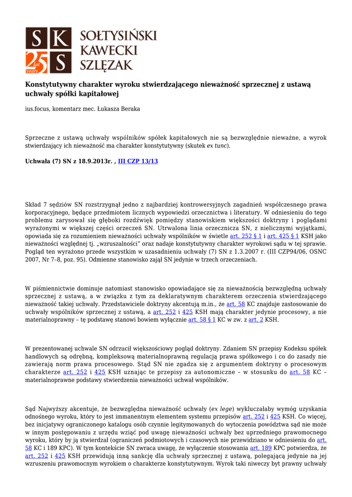 Konstytutywny charakter wyroku stwierdzającego nieważność sprzecznej z ustawą uchwały spółki kapitałowej ius.focus, komentarz mec. Łukasza Beraka Sprzeczne z ustawą uchwały wspólników spółek kapitałowych nie są bezwzględnie nieważne, a wyrok stwierdzający ich nieważność ma charakter konstytutywny (skutek ex tunc). Uchwała (7) SN z 18.9.2013r. , III CZP 13/13 Skład 7 sędziów SN rozstrzygnął jedno z najbardziej kontrowersyjnych zagadnień współczesnego prawa korporacyjnego, będące przedmiotem licznych wypowiedzi orzecznictwa i literatury. W odniesieniu do tego problemu zarysował się głęboki rozdźwięk pomiędzy stanowiskiem większości doktryny i poglądami wyrażonymi w większej części orzeczeń SN. Utrwalona linia orzecznicza SN, z nielicznymi wyjątkami, opowiada się za rozumieniem nieważności uchwały wspólników w świetle art. 252 § 1 i art. 425 § 1 KSH jako nieważności względnej tj. „wzruszalności” oraz nadaje konstytutywny charakter wyrokowi sądu w tej sprawie. Pogląd ten wyrażono przede wszystkim w uzasadnieniu uchwały (7) SN z 1.3.2007 r. (III CZP94/06, OSNC 2007, Nr 7–8, poz. 95). Odmienne stanowisko zajął SN jedynie w trzech orzeczeniach. W piśmiennictwie dominuje natomiast stanowisko opowiadające się za nieważnością bezwzględną uchwały sprzecznej z ustawą, a w związku z tym za deklaratywnym charakterem orzeczenia stwierdzającego nieważność takiej uchwały. Przedstawiciele doktryny akcentują m.in., że art. 58 KC znajduje zastosowanie do uchwały wspólników sprzecznej z ustawą, a art. 252 i 425 KSH mają charakter jedynie procesowy, a nie materialnoprawny – tę podstawę stanowi bowiem wyłącznie art. 58 § 1 KC w zw. z art. 2 KSH. W prezentowanej uchwale SN odrzucił większościowy pogląd doktryny. Zdaniem SN przepisy Kodeksu spółek handlowych są odrębną, kompleksową materialnoprawną regulacją prawa spółkowego i co do zasady nie zawierają norm prawa procesowego. Stąd SN nie zgadza się z argumentem doktryny o procesowym charakterze art. 252 i 425 KSH uznając te przepisy za autonomiczne – w stosunku do art. 58 KC – materialnoprawne podstawy stwierdzenia nieważności uchwał wspólników. Sąd Najwyższy akcentuje, że bezwzględna nieważność uchwały (ex lege) wykluczałaby wymóg uzyskania odnośnego wyroku, który to jest immanentnym elementem systemu przepisów art. 252 i 425 KSH. Co więcej, bez inicjatywy ograniczonego katalogu osób czynnie legitymowanych do wytoczenia powództwa sąd nie może w innym postępowaniu z urzędu wziąć pod uwagę nieważności uchwały bez uprzedniego prawomocnego wyroku, który by ją stwierdzał (ograniczeń podmiotowych i czasowych nie przewidziano w odniesieniu do art. 58 KC i 189 KPC). W tym kontekście SN zwraca uwagę, że wyłączenie stosowania art. 189 KPC potwierdza, że art. 252 i 425 KSH przewidują inną sankcję dla uchwały sprzecznej z ustawą, polegającą jedynie na jej wzruszeniu prawomocnym wyrokiem o charakterze konstytutywnym. Wyrok taki niweczy byt prawny uchwały od jej powzięcia. Tworzy zatem sytuację, jakby uchwała nigdy nie została podjęta. Jednak do chwili wydania takiego wyroku uchwała musi być respektowana. W konkluzji SN przyjmuje, że art. 252 i 425 KSH wprowadziły szczególną postać nieważności, odmienną od tradycyjnej nieważności bezwzględnej w rozumieniu art. 58 KC (tym bardziej, że obydwa przepisy Kodeksu spółek handlowych wiążą nieważność uchwały wyłącznie z jej sprzecznością z ustawą, a nie z obejściem ustawy lub ze sprzecznością z zasadami współżycia społecznego, jak to czyni art. 58 KC), mającą charakter nieważności względnej („wzruszalność”). Sąd Najwyższy podnosi argument zapewnienia bezpieczeństwa i stabilności obrotu, który może zostać zrealizowany jedynie przez konstytutywny charakter wyroku stwierdzającego nieważność. W przeciwnym razie, członkowie zarządu mogliby odmawiać realizacji niezaaprobowanych przez nich uchwał, opierając się na własnej ocenie sprzeczności z ustawą. Co więcej, trudno byłoby zaakceptować skutek bezwzględnej nieważności ab initio w odniesieniu do każdej nawet najdrobniejszej sprzeczności uchwały z ustawą, co również nie byłoby do pogodzenia z zasadą bezpieczeństwa obrotu. Zdaniem SN, wyłącznie sąd jest władny ocenić, czy uchybienia natury formalnej są na tyle istotne, aby stwierdzić nieważność wadliwej uchwały. Komentarz Uchwała SN ma kluczowe znaczenie dla funkcjonowania spółek kapitałowych. Sąd Najwyższy przesądza bowiem, że każda uchwała wspólników, w skrajnym przypadku nawet taka, która w sposób oczywisty narusza podstawowe zasady prawa prowadząc do ewidentnych nadużyć (np. niedozwolonego łączenia funkcji członka zarządu i rady nadzorczej), powinna być w pełni respektowana do czasu wydania prawomocnego orzeczenia stwierdzającego jej nieważność (co w praktyce może nastąpić dopiero po kilku latach od wytoczenia powództwa). Można przyjąć założenie, że pogląd przeciwny powyższemu stanowisku mógłby także prowadzić do patologii, pozwalając np. niezadowolonym członkom organów spółki na ignorowanie uchwały wspólników ze względu na jej rzekomą nieważność. Stąd uchylenie kontrowersji dotyczących art. 252 i 425 KSH wymagałoby w chwili obecnej interwencji ustawodawcy. W kontekście uchwały SN pojawia się pytanie o wpływ tej decyzji na praktykę sądów rejestrowych, a przede wszystkim na kognicję sądu rejestrowego, który zgodnie m.in. z uchwałą SN z 20.1.2010 r. (III CZP 122/09, OSNC 2010, Nr 7–8, poz. 107) jest uprawniony do badania wpływu naruszeń procedury podejmowania uchwał przez walne zgromadzenie spółki na ich treść (por. art. 23 ustawy z 20.8.1997 r. o Krajowym Rejestrze Sądowym, t.j. Dz.U. z 2013 r. poz. 1203 ze zm.; dalej jako: KRSU). Jak podkreślano w judykaturze SN, sąd rejestrowy nie jest