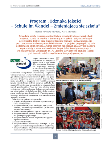 EDUKACJA POMORSKA nr 72 (23) wrzesień-październik 2015 r. Program „Odznaka jakości – Schule im Wandel – Zmieniająca się szkoła” Joanna Nowicka-Młyńska, Marta Młyńska 37 Fot. Archiwum projektu Fot. Archiwum projektu Projekt „Schule im Wandel” skierowano do wszystkich typów szkół, a jego celem było stworzenie możliwości aktywnego rozwoju w obszarach: aktywizujące metody pracy z uczniem, kształcenie kompetencji kluczowych, wspieranie wielojęzyczności, kreatywne korzystanie z technologii informacyjno-komunikacyjnych (TiK) czy przejmowanie inicjatywy przez uczniów. Główne działania uczestników skupione były wokół nauczania 100% aktywność na zajęciach LdL w klasie pierwszej języka niemieckiego, jednak program zakładał konieczność współpracy germanistów z nauczycielami innych przedmiotów. Przez cały rok szkolny grupa projektowa realizowała oraz dokumentowała zadania obowiązkowe i dodatkowe, które były zamieszczane na platformie e-learnigowej. Warunkiem pozytywnego ukończenia programu było zrealizowanie wszystkich zadań. Zadania obowiązkowe obejmowały: • projekty edukacyjne zrealizowane przez nauczycieli j. niemieckiego; Zajęcia LdL: „Alles Gute zum Geburtstag” • przeprowadzenie przez każdego z nauczycieli 10 zajęć j. niemieckiego metodą LdL (uczenie się poprzez nauczanie); • prowadzenie większości zajęć w j. niemieckim; • przeprowadzenie spotkań informacyjnych dla grona pedagogicznego; • przeprowadzenie dwóch imprez wynikających z potrzeb uczniów. Zadania dodatkowe to: • przeprowadzenie bloków zajęć metodą CLIL (zintegrowane kształcenie przedmiotowo-językowe); • przeprowadzenie projektu interdyscyplinarnego z zastosowaniem TiK; Jedno z 14 stoisk Szkolnego Jarmarku Bożonarodzeniowego Fot. Archiwum projektu Tylko dwie szkoły z naszego województwa przystąpiły do pierwszej edycji projektu „Schule im Wandel – Zmieniająca się szkoła“ zorganizowanego przez Goethe-Institut oraz Ośrodek Rozwoju Edukacji i odbywającego się pod patronatem Ambasady Republiki Niemiec. Do projektu przystąpiło łącznie siedemnaście szkół z Polski, a wśród czterech najlepszych znalazły się placówki reprezentujące nasze województwo: Zespół Szkół Ponadgimnazjalnych w Sierakowicach i Gimnazjum nr 1 w Lęborku. Uzyskały one odznakę jakości, tytuł laureata, a także wyróżnienia i nagrody pieniężne. Wokół nas Zwycięzcy Turnieju dla Gimnazjalistów – drużyna z Gimnazjum w Linii z dyrektorem ZSP w Sierakowicach • zorganizowanie imprezy we współpracy z inną organizacją – otwarcie szkoły na środowisko zewnętrzne; • przeprowadzenie zajęć otwartych. Realizacja wszelkich zadań znalazła swoje odbicie w dokładnej dokumentacji wraz z fotorelacjami, filmami, prezentacjami, testami, quizami, komiksami itp. Najciekawsze inicjatywy zrealizowane w ZSP w Sierakowicach: • projekty edukacyjne: „Essen und Trinken“ i „Mein Alltag”; w ramach projektów uczniowie umieścili swoje prace – filmiki, ćwiczenia multimedialne, prezentacje, zdjęcia, komiksy – na stronach internetowych; • akcje, w których uczniowie przejmują inicjatywę: Koncert Kolęd i Pastorałek Anglo- i Niemieckojęzycznych oraz Akcja Profilaktyczna dot. zachorowalności na raka; • projekt międzyprzedmiotowy: „Niemiecki od kuchni, czyli gotowanie po niemiecku“ z zastosowaniem narzędzi TIK; powstały prezentacje nt. kuchni krajów DACHu oraz przepisy kulinarne; uczniowie przygotowywali potrawy i cały proces opisywali w j. niemieckim; owocem ich pracy jest film, który stał się materiałem dydaktycznym dla innych klas; • otwarcie szkoły na zewnątrz: Międzyszkolny Turniej Językowy dla Gimnazjalistów podczas którego drużyny z okolicznych gimnazjów mogły wykazać się zdolnościami językowymi. Najciekawsze realizacje w Gimnazjum nr 1 w Lęborku: • projekty edukacyjne: „Über, unter, auf, an, in! Präpositionen einfach sind!” i „Gesundes Essen“; uczniowie nagrali zabawny film, który ułatwi zapamiętanie przyimków, a także przygotowali prezentacje nt. zdrowego odżywiania i przykładowe menu; • uczniowie przejmują inicjatywę: Jarmark Bożonarodzeniowy – każda klasa przygotowała stragan z ozdobami, dekoracjami, słodkościami itp., uczniowie brali udział w przedstawieniach, quizach, kolędowaniu i degustacji potraw; • projekt międzyprzedmiotowy: „Znane konstrukcje Wielkiej Brytanii – przewodnik filmowy” z zastosowaniem narzędzi TiK; uczniowie wykonali budowle Anglii z różnych materiałów i nagrali film – multimedialny przewodnik; • zajęcia CLIL: przy współpracy z nauczycielami przedmiotów ścisłych przeprowadzono 4 cykle zajęć (każdy po 3 godz.) metodą zintegrowanego nauczania przedmiotowo-językowego w j. niemieckim i j. angielskim, np. „Pomagać można w każdym języku” – łącznie z edukacją dla bezpieczeństwa; podczas zajęć uczniowie przeprowadzali resuscytację (z instrukcjami w obu językach), a efektem pracy były prezentacje i film instruktażowy. Program „Schule im Wandel“ był inspiracją dla wielu osób, pomógł uczniom i nauczycielom rozwinąć skrzydła, a także zaangażować się w inny, niekonwencjonalny sposób w działania lekcyjne i różnego rodzaju aktywności szkolne. Młodzież wzbogaciła wiedzę na temat TiK, poszerzyła horyzonty, poznała nowe metody pracy, takie jak LdL czy CLIL. Uczniowie nakręcili filmy, teledyski, stworzyli strony internetowe, materiały pomocnicze przydatne na zajęciach, przygotowali prezentacje PREZI i poznali aplikacje do nauki j. niemieckiego. Realizacja tych działań pokazała, że zarówno Zespół Szkół Ponadgimnazjalnych w Sierakowicach, jak i Gimnazjum nr 1 w Lęborku to idealne „Schule im Wandel“. Joanna Nowicka-Młyńska – nauczyciel j. niemieckiego w Gimnazjum nr 1 w Lęborku, laureatka ogólnopolskiego konkursu „Nasze talenty – prowadzę lekcję języka 