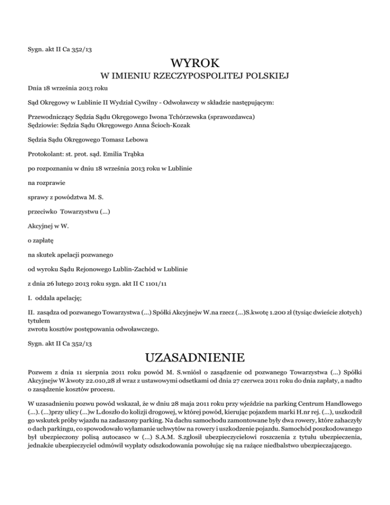 Sygn. akt II Ca 352/13 WYROK W IMIENIU RZECZYPOSPOLITEJ POLSKIEJ Dnia 18 września 2013 roku Sąd Okręgowy w Lublinie II Wydział Cywilny - Odwoławczy w składzie następującym: Przewodniczący Sędzia Sądu Okręgowego Iwona Tchórzewska (sprawozdawca) Sędziowie: Sędzia Sądu Okręgowego Anna Ścioch-Kozak Sędzia Sądu Okręgowego Tomasz Lebowa Protokolant: st. prot. sąd. Emilia Trąbka po rozpoznaniu w dniu 18 września 2013 roku w Lublinie na rozprawie sprawy z powództwa M. S. przeciwko Towarzystwu (...) Akcyjnej w W. o zapłatę na skutek apelacji pozwanego od wyroku Sądu Rejonowego Lublin-Zachód w Lublinie z dnia 26 lutego 2013 roku sygn. akt II C 1101/11 I. oddala apelację; II. zasądza od pozwanego Towarzystwa (...) Spółki Akcyjnejw W.na rzecz (...)S.kwotę 1.200 zł (tysiąc dwieście złotych) tytułem zwrotu kosztów postępowania odwoławczego. Sygn. akt II Ca 352/13 UZASADNIENIE Pozwem z dnia 11 sierpnia 2011 roku powód M. S.wniósł o zasądzenie od pozwanego Towarzystwa (...) Spółki Akcyjnejw W.kwoty 22.010,28 zł wraz z ustawowymi odsetkami od dnia 27 czerwca 2011 roku do dnia zapłaty, a nadto o zasądzenie kosztów procesu. W uzasadnieniu pozwu powód wskazał, że w dniu 28 maja 2011 roku przy wjeździe na parking Centrum Handlowego (...). (...)przy ulicy (...)w L.doszło do kolizji drogowej, w której powód, kierując pojazdem marki H.nr rej. (...), uszkodził go wskutek próby wjazdu na zadaszony parking. Na dachu samochodu zamontowane były dwa rowery, które zahaczyły o dach parkingu, co spowodowało wyłamanie uchwytów na rowery i uszkodzenie pojazdu. Samochód poszkodowanego był ubezpieczony polisą autocasco w (...) S.A.M. S.zgłosił ubezpieczycielowi roszczenia z tytułu ubezpieczenia, jednakże ubezpieczyciel odmówił wypłaty odszkodowania powołując się na rażące niedbalstwo ubezpieczającego. W odpowiedzi na pozew pozwany ubezpieczyciel wniósł o oddalenie powództwa w całości oraz zasądzenie od powoda zwrotu kosztów procesu, wskazując ponownie, że ubezpieczający, wjeżdżając na parking z zamontowanymi na dachu rowerami, wykazał się rażącym niedbalstwem, co wyłączało odpowiedzialność ubezpieczyciela. Wyrokiem z dnia 26 lutego 2013 roku Sąd Rejonowy Lublin-Zachód w Lublinie zasądził od pozwanego Towarzystwa (...) Spółki Akcyjnejw W.na rzecz powoda M. S.kwotę 21.832,97 zł z ustawowymi odsetkami od dnia 28 czerwca 2011 roku do dnia zapłaty (pkt I), oddalił powództwo w pozostałym zakresie (pkt II), zasądził od pozwanego na rzecz powoda kwotę 4.718 zł tytułem zwrotu kosztów procesu (pkt III) oraz nakazał pozwanemu uiszczenie na rzecz Skarbu Państwa – Sądu Rejonowego Lublin-Zachód w Lublinie kwoty 44,14 zł tytułem pokrytych tymczasowo z sum budżetowych wydatków na poczet wynagrodzenia biegłego (pkt IV). W uzasadnieniu wyroku Sąd Rejonowy wskazał na następujące ustalenia faktyczne i motywy swego rozstrzygnięcia. Pomiędzy M. S., a Towarzystwem (...) Spółką Akcyjnąw W.została zawarta umowa ubezpieczenia auto-casco samochodu H. (...)nr rej. (...)z ustalonym pakietem – OC, AC, NNW, ASS, MCA, IP oraz okresem ubezpieczenia od dnia 16 kwietnia 2011 roku do dnia 15 kwietnia 2012 roku. Umowa została potwierdzona polisą nr (...), wraz z ogólnymi warunkami ubezpieczenia pojazdów Autocasco, przyjętych uchwałą Zarządu (...) S.A.nr (...). Zgodnie z § 4 ust 2 ogólnych warunków ubezpieczenia, stanowiących integralną część zawartej przez strony umowy, w przypadku powstania szkody na skutek rażącego niedbalstwa ubezpieczonego bądź osób wymienionych w ust. 1 pkt 2 odszkodowanie nie należy się, chyba, że zastosowanie mają postanowienia art. 827 § 1 k.c. Stosownie do § 9 ust 8 o.w.u. ustalenie rozmiarów szkody częściowej następowało po przedłożeniu oryginałów rachunków lub faktur VAT dokumentujących naprawę pojazdu, pozostających w związku przyczynowym ze zdarzeniem, za które A. ponosi odpowiedzialność, według uprzednio uzgodnionych z A. kosztów i sposobu naprawy pojazdu przez zakład dokonujący tej naprawy, w oparciu o: normy czasowe producenta pojazdu ujęte w systemie A. lub E., średnią stawkę za roboczogodzinę ustaloną dla warsztatu naprawczego, w którym dokonywana jest naprawa, części i materiałów producenta pojazdu ujęte systemie A. lub E., nie więcej jednak niż średnie ceny zalecane producenta pojazdu lub oficjalnego importera do stosowania przez ich sieć serwisową. W dniu 28 maja 2011 roku około godz. 10.00 przy wjeździe na parking Centrum Handlowego (...). L.przy ul. (...)w L.doszło do kolizji drogowej, w którejM. S.kierujący pojazdem marki H.nr rej. (...)uszkodził przedmiotowy pojazd wskutek próby wjazdu na zadaszony parking centrum handlowego. Na dachu samochodu zamontowane były dwa rowery, które zahaczyły o dach parkingu, co spowodowało wyłamanie uchwytów na rowery i uszkodzenie pojazdu. Koszt naprawy uszkodzonych elementów pojazdu została wyceniona na kwotę 21.832, 97 zł. Ulica dojazdowa do C.H. E. L. od ulicy (...) jest ulicą przeznaczoną do obsługi zespołu obiektu centrum handlowego. Przy wjeździe od strony ulicy (...) nie było znaku dotyczącego obowiązującej prędkości. Zgodnie z kwalifikacją ulic jest to ulica dojazdowa, gdzie prędkość obowiązująca wynosi 30 km/h. Znak ograniczenia prędkości do 10 km/h usytuowany był na wysokości osi pierwszego wjazdu na parking. Na początku wjazdu, gdzie wysokość wynosi 2,5 m, brak było oznaczenia dotyczącego dopuszczalnej wysokości dla pojazdów wjeżdżających (znak B--16). W odległości 6 m od osi jezdni znajdowała się poprzeczka barwy białoczerwonej, zawieszona na łańcuchach, z uszkodzoną, nieczytelną, okrągłą tabliczką o średnicy 0,18 m, z napisem „1,9 m”. W dniu 28 maja 2011 roku M. S.zgłosił szkodę pozwanemu, który decyzją z dnia 13 czerwca 2011 roku odmówił wypłaty odszkodowania ze względu na rażące niedbalst