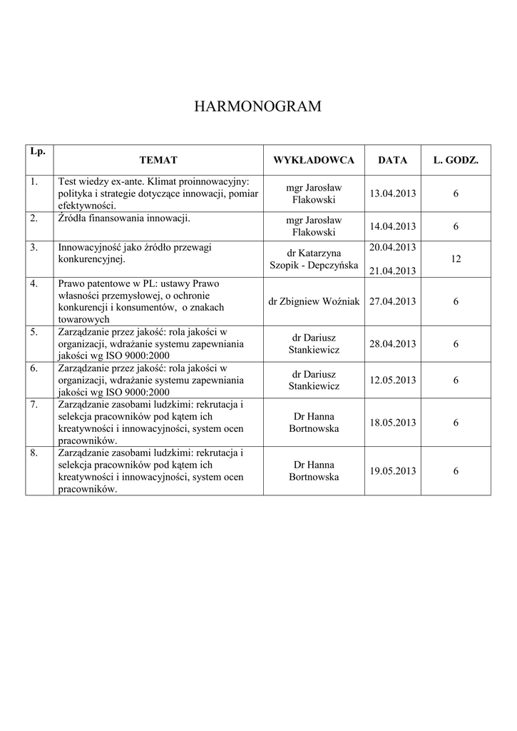 HARMONOGRAM Lp. 1. 2. 3. 4. 5. 6. 7. 8. TEMAT Test wiedzy ex-ante. Klimat proinnowacyjny: polityka i strategie dotyczące innowacji, pomiar efektywności. Źródła finansowania innowacji. Innowacyjność jako źródło przewagi konkurencyjnej. Prawo patentowe w PL: ustawy Prawo własności przemysłowej, o ochronie konkurencji i konsumentów, o znakach towarowych Zarządzanie przez jakość: rola jakości w organizacji, wdraŜanie systemu zapewniania jakości wg ISO 9000:2000 Zarządzanie przez jakość: rola jakości w organizacji, wdraŜanie systemu zapewniania jakości wg ISO 9000:2000 Zarządzanie zasobami ludzkimi: rekrutacja i selekcja pracowników pod kątem ich kreatywności i innowacyjności, system ocen pracowników. Zarządzanie zasobami ludzkimi: rekrutacja i selekcja pracowników pod kątem ich kreatywności i innowacyjności, system ocen pracowników. WYKŁADOWCA DATA L. GODZ. mgr Jarosław Flakowski 13.04.2013 6 mgr Jarosław Flakowski 14.04.2013 6 dr Katarzyna Szopik - Depczyńska 20.04.2013 12 21.04.2013 dr Zbigniew Woźniak 27.04.2013 6 dr Dariusz Stankiewicz 28.04.2013 6 dr Dariusz Stankiewicz 12.05.2013 6 Dr Hanna Bortnowska 18.05.2013 6 Dr Hanna Bortnowska 19.05.2013 6