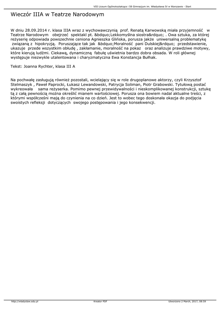 VIII Liceum Ogólnokształcące i 58 Gimnazjum im. Władysława IV w Warszawie - Start Wieczór IIIA w Teatrze Narodowym W dniu 28.09.2014 r. klasa IIIA wraz z wychowawczynią prof. Renatą Karwowską miała przyjemność w Teatrze Narodowym obejrzeć spektakl pt. „Lekkomyślna siostra” . Owa sztuka, za której reżyserię odpowiada powszechnie ceniona Agnieszka Glińska, porusza jakże uniwersalną problematykę związaną z hipokryzją. Poruszające tak jak „Moralność pani Dulskiej” przedstawienie, ukazuje przede wszystkim obłudę , zakłamanie, moralność na pokaz oraz analizuje prawdziwe motywy, które kierują ludźmi. Ciekawą, dynamiczną fabułę uświetnia bardzo dobra obsada. W roli głównej występuje niezwykle utalentowana i charyzmatyczna Ewa Konstancja Bułhak. Tekst: Joanna Rychter, klasa III A Na pochwałę zasługują również pozostali, wcielający się w role drugoplanowe aktorzy, czyli Krzysztof Stelmaszyk , Paweł Paprocki, Łukasz Lewandowski, Patrycja Soliman, Piotr Grabowski. Tytułową postać wykreowała sama reżyserka. Pomimo pewnej przewidywalności i nieskomplikowanej konstrukcji, sztukę tą z całą pewnością można określić mianem wartościowej. Porusza ona bowiem nadal aktualne treści, z którymi współcześni mają do czynienia na co dzień. Jest to wobec tego doskonała okazja do podjęcia swoistych refleksji dotyczących swojego postępowania i jego konsekwencji. http://wladyslaw.edu.pl Kreator PDF Utworzono 2 March, 2017, 08:59