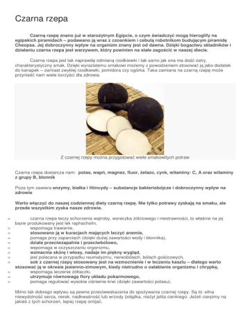Czarna rzepa Czarną rzepę znano już w starożytnym Egipcie, o czym świadczyć mogą hieroglify na egipskich piramidach – podawano ją wraz z czosnkiem i cebulą robotnikom budującym piramidę Cheopsa. Jej dobroczynny wpływ na organizm znany jest od dawna. Dzięki bogactwu składników i działaniu czarna rzepa jest warzywem, który powinien na stałe zagościć w naszej diecie. Czarna rzepa jest tak naprawdę odmianą rzodkiewki i tak samo jak ona ma dość ostry, charakterystyczny smak. Dzięki wyrazistemu smakowi możemy z powodzeniem stosować ją jako dodatek do kanapek – zamiast zwykłej rzodkiewki, pomidora czy ogórka. Taka zamiana na czarną rzepę może przynieść nam wiele korzyści dla zdrowia. Z czarnej rzepy można przygotować wiele smakowitych potraw Czarna rzepa dostarcza nam: potas, wapń, magnez, fluor, żelazo, cynk, witaminy: C, A oraz witaminy z grupy B, błonnik Poza tym zawiera enzymy, białka i fitincydy – substancje bakteriobójcze i dobroczynny wpływ na zdrowie Warto włączyć do naszej codziennej diety czarną rzepę. Nie tylko potrawy zyskają na smaku, ale przede wszystkim zyska nasze zdrowie. • • • • • • • • • • • • czarna rzepa leczy schorzenia wątroby, woreczka żółciowego i niestrawności, to właśnie na jej bazie produkowany jest lek raphacholin, wspomaga trawienie, stosowano ją w kuracjach mających leczyć anemie, pomaga przy zaparciach (dzięki dużej zawartości wody i błonnika), działa przeciwzapalnie i przeciwbólowo, wspomaga w oczyszczaniu organizmu, wzmacnia skórę i włosy, nadaje im piękny wygląd, jest polecana w przypadku reumatyzmu, nerwobólach, bólach gośćcowych, sok z czarnej rzepy stosowany jest na wzmocnienie i w leczeniu kaszlu – dlatego warto stosować ją w okresie jesienno-zimowym, kiedy nietrudno o osłabienie organizmu i chrypkę, wspomaga leczenie żółtaczki, utrzymuje równowagę flory układu pokarmowego, pomaga regulować wysokie ciśnienie krwi (dzięki zawartości potasu). Mimo tak dobrego wpływu są pewne przeciwwskazania do spożywania czarnej rzepy. Są to: silna niewydolność serca, nerek, nadkwaśność lub wrzody żołądka, nieżyt jelita cienkiego. Jeżeli cierpimy na jakieś z tych schorzeń, lepiej rzepę omijać.