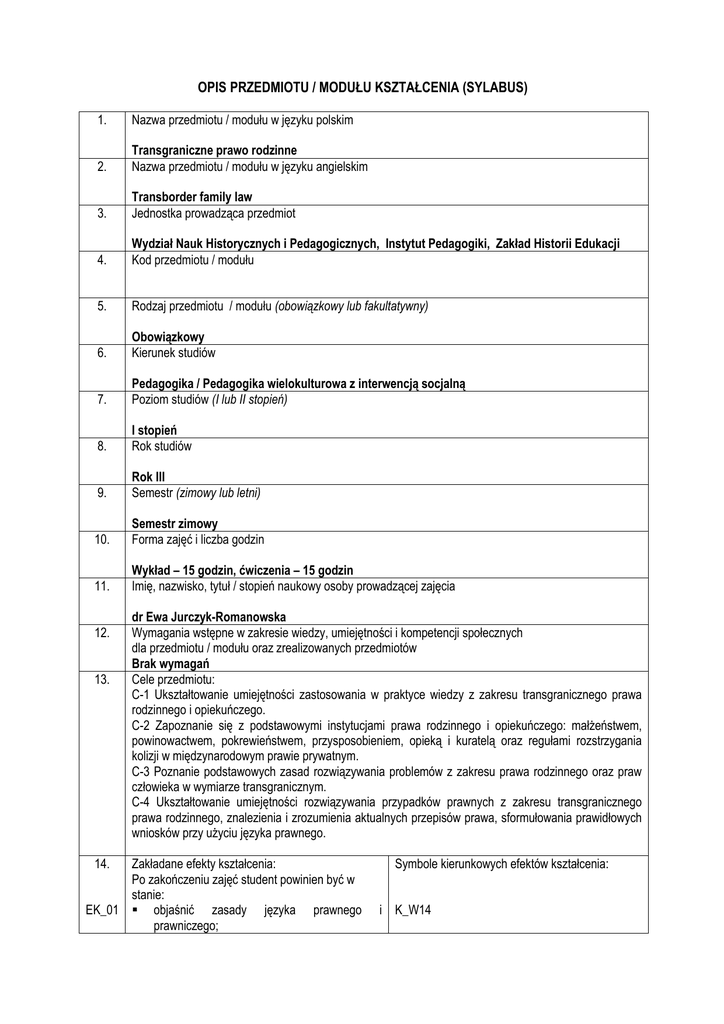 OPIS PRZEDMIOTU / MODUŁU KSZTAŁCENIA (SYLABUS) 1. Nazwa przedmiotu / modułu w języku polskim 2. Transgraniczne prawo rodzinne Nazwa przedmiotu / modułu w języku angielskim 3. Transborder family law Jednostka prowadząca przedmiot 4. Wydział Nauk Historycznych i Pedagogicznych, Instytut Pedagogiki, Zakład Historii Edukacji Kod przedmiotu / modułu 5. Rodzaj przedmiotu / modułu (obowiązkowy lub fakultatywny) 6. Obowiązkowy Kierunek studiów 7. Pedagogika / Pedagogika wielokulturowa z interwencją socjalną Poziom studiów (I lub II stopień) 8. I stopień Rok studiów 9. Rok III Semestr (zimowy lub letni) 10. Semestr zimowy Forma zajęć i liczba godzin 11. Wykład – 15 godzin, ćwiczenia – 15 godzin Imię, nazwisko, tytuł / stopień naukowy osoby prowadzącej zajęcia 12. 13. 14. dr Ewa Jurczyk-Romanowska Wymagania wstępne w zakresie wiedzy, umiejętności i kompetencji społecznych dla przedmiotu / modułu oraz zrealizowanych przedmiotów Brak wymagań Cele przedmiotu: C-1 Ukształtowanie umiejętności zastosowania w praktyce wiedzy z zakresu transgranicznego prawa rodzinnego i opiekuńczego. C-2 Zapoznanie się z podstawowymi instytucjami prawa rodzinnego i opiekuńczego: małżeństwem, powinowactwem, pokrewieństwem, przysposobieniem, opieką i kuratelą oraz regułami rozstrzygania kolizji w międzynarodowym prawie prywatnym. C-3 Poznanie podstawowych zasad rozwiązywania problemów z zakresu prawa rodzinnego oraz praw człowieka w wymiarze transgranicznym. C-4 Ukształtowanie umiejętności rozwiązywania przypadków prawnych z zakresu transgranicznego prawa rodzinnego, znalezienia i zrozumienia aktualnych przepisów prawa, sformułowania prawidłowych wniosków przy użyciu języka prawnego. Zakładane efekty kształcenia: Po zakończeniu zajęć student powinien być w stanie: EK_01 objaśnić zasady języka prawnego prawniczego; Symbole kierunkowych efektów kształcenia: i K_W14 EK_02 EK_03 EK_04 EK_05 zdefiniować podstawowe pojęcia związane z prawem rodzinnym i opiekuńczym; wytłumaczyć istotę takich instytucji prawnych jak małżeństwo, rodzicielstwo, opieka, kuratela, przysposobienie; przedstawić istotę procedur obowiązujących w prawie rodzinnym i opiekuńczym i zasady rozstrzygania spraw transgranicznych; wyliczyć i scharakteryzować uprawnienia i obowiązki poszczególnych podmiotów prawa rodzinnego i opiekuńczego oraz międzynarodowego prawa prywatnego; Po zakończeniu zajęć student powinien umieć: aktualizować swoją wiedzę z zakresu prawa; rozwiązywać indywidualne przypadki prawne (kazusy) w oparciu o aktualne przepisy prawa; EK_08 zastosować w praktyce procedury związane z prawem rodzinnym i opiekuńczym oraz międzynarodowym prawem prywatnym; EK_09 skonstruować pisma prawne: wnioski, decyzje, odwołania, opinie, itp.; EK_06 EK_07 EK_10 EK_11 EK_12 EK_13 EK_15 Po zakończeniu zajęć student powinien mieć kompetencje społeczne polegające na: docenianiu powagi i specyfiki poszczególnych instytucji prawa rodzinnego i opiekuńczego; uwrażliwieniu na odpowiedzialność ciążącą na podmiotach transgranicznego prawa rodzinnego; uwrażliwieniu na niemożliwość poddania regulacji prawnej wszelkich relacji pomiędzy podmiotami prawa rodzinnego i opiekuńczego z uwagi na ich specyfikę, delikatność i intymność; docenianiu powagi i odpowiedzialności wszelkich decyzji i orzeczeń zapadających wobec podmiotów transgranicznego prawa rodzinnego i opiekuńczego; szanowaniu przyrodzonej godności człowieka. K_W14 K_W10 K_W14 K_W14 K_U05 K_U02 K_U02 K_U07 K_K04 K_K04 K_K04 K_K04 K_K04 15. Treści programowe: Zawarcie małżeństwa. Małżeństwa konkordatowe. Ustanie małżeństwa. Małżeńskie ustroje majątkowe. Prawa i obowiązki małżonków. Separacja. Opieka. Kuratela. Władza rodzicielska. Przysposobienie. Obowiązek alimentacyjny. Zasady rozstrzygania kolizji w międzynarodowym prawie prywatnym. Zasady prowadzenia mediacji transgranicznych. 16. Zalecana literatura (podręczniki) K. Gromek, Władza rodzicielska. Komentarz, Wyd. C.H. Beck, Warszawa 2008. B. Gronowska, T. Jasudowicz, C. Mik, Prawa człowieka. Dokumenty międzynarodowe,Toruń 1996. J. Ignatowicz, M. Nazar, Prawo rodzinne, Wyd. LexisNexis, Warszawa 2006 Konstytucja RP z 1997 r. S. Pieckowski, Mediacja w sprawach cywilnych, Wyd. Centrum Doradztwa i Informacji Difin, Warszawa 2006 J. Strzebińczyk, Prawo rodzinne, Wyd. Zakamycze, Kraków 2003 Ustawa z dnia 25 lutego 1964 r. Kodeks rodzinny i opiekuńczy, Dz.U.1964.9.59 z późniejszymi zmianami Ustawa z dnia 23 kwietnia 1964 r. Kodeks cywilny, Dz.U.1964.16.93 z późniejszymi zmianami Ustawa z dnia 4 lutego 2011 r. Prawo prywatne międzynarodowe, Dz.U.2011.80.432 z poźniejszymi zmianami K. Zagórska, Mediacje transgraniczne w sprawach rodzinnych, [w:] M. Tabernacka (red.) Mediacje ponad podziałami, http://www.bibliotekacyfrowa.pl/dlibra/doccontent?id=43447&from=FBC 17. Forma zaliczenia poszczególnych komponentów przedmiotu / modułu, sposób sprawdzenia osiągnięcia zamierzonych efektów kształcenia: wykład: egzamin pisemny: ocena nabytej przez studenta wiedzy – EK_01(K_W14), EK_02(K_W14), EK_03 (K_W10), EK_04(K_W14), EK_05 (K_W14) ćwiczenia: formy weryfikacji założonych efektów kształcenia: - praca projektowa – rozwiązanie kazusu (ze szczególnym uwzględnieniem kwestii etycznych) z zakresu transgranicznego prawa rodzinnego EK_06(K_U05), EK_07(K_U02), EK_08(K_U02), EK_09(K_U07), EK_10(K_K04), EK_11(K_K04), EK_12(K_K04), EK_13(K_K04), EK_15(K_K04) Kryteria oceny: - ocena bardzo dobra – student ma ugruntowaną i operatywną wiedzę z zakresu prawa rodzinnego i opiekuńczego, a także podstawowych zasad rozstrzygania spraw transgranicznych. - ocena dobra – student ma wystarczającą wiedzę z zakresu prawa rodzinnego i opiekuńczego, a także podstawowych zasad rozstrzygania spraw transgranicznych. - ocena dostateczna – student opanował zdecydowanie podstawowy zakres wiedzy na temat prawa