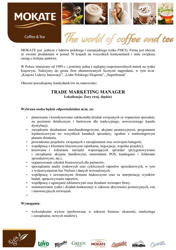 ! MOKATE jest jednym z liderów polskiego i europejskiego rynku FMCG. Firma jest obecna ze swoimi produktami w ponad 70 krajach na wszystkich kontynentach i stale zwiększa zasięg o kolejne państwa. W Polsce istniejemy od 1989 r. i jesteśmy jedną z najlepiej rozpoznawalnych marek na rynku krajowym. Należymy do grona firm uhonorowanych licznymi nagrodami, w tym m.in. „Krajowi Liderzy Innowacji”, „Lider Polskiego Eksportu”, „Superbrands”. Obecnie poszukujemy kandydatek/ów na stanowisko: TRADE MARKETING MANAGER Lokalizacja: Żory (woj. śląskie) Wybrana osoba będzie odpowiedzialna m.in. za: • • • • • • • • • • planowanie i koordynowanie całokształtu działań związanych ze wsparciem sprzedaży na poziomie detalicznym i hurtowym dla tradycyjnego, nowoczesnego kanału dystrybucji, zarządzanie działaniami merchandisingowymi, akcjami promocyjnymi, programami lojalnościowymi we wszystkich kanałach sprzedaży, zgodnie z marketingowym planem działania, prowadzenie projektów związanych z zarządzaniem oraz rozwojem kategorii, współpracę z klientami kluczowymi (spotkania, negocjacje, wspólne projekty), kreowanie i wdrażanie narzędzi wspierających sprzedaż (przygotowywanie i zarządzanie akcjami handlowymi, materiałami POS, katalogami i folderami sprzedażowymi, itp.), organizowanie szkoleń biznesowych dla partnerów, sporządzanie analiz rynkowych oraz cyklicznych raportów sprzedażowych, w tym z wykorzystaniem baz Nielsen i danych wewnętrznych, współpracę z zewnętrznymi firmami badawczymi oraz za interpretację wyników badań, opracowywanie raportów, współpracę z agencjami reklamowymi oraz działami wewnątrz firmy, monitorowanie rynku i działań konkurencji w zakresie aktywności promocyjnych, cen i innowacyjnych rozwiązań. • Wymagania: • ! ! wykształcenie wyższe (preferowane w zakresie biznesu, ekonomii, marketingu i zarządzania, nowych mediów), ! • • • • • • • • • • min. 3 lata doświadczenia w pracy w Dziale Trade Marketingu lub Marketingu w branży FMCG (mile widziane osoby z doświadczeniem sprzedażowym na stanowiskach Przedstawiciela Handlowego lub Key Account Managera), znajomość narzędzi trade marketingowych (mile widziana znajomość bazy Nielsen), wysoko rozwinięte umiejętności w zakresie analizy i syntezy danych oraz podejmowania decyzji pod presją czasu, bardzo dobra organizacja pracy i zaangażowanie w realizację wyznaczonych celów, umiejętność łączenia różnych działań w celu osiągnięcia spójnego podejścia do zagadnień i wyników, umiejętność pracy w zespole, bardzo dobrą znajomość obsługi komputera ze szczególnym uwzględnieniem MS Excel oraz Power Point, dobra znajomość języka angielskiego, prawo jazdy kat. B, gotowość do relokacji. Osoby zainteresowane uprzejmie prosimy o przesyłanie CV [email protected] podając w tytule maila nazwę stanowiska. na adres e-mail: Uprzejmie informujemy, że skontaktujemy się wyłącznie z wybranymi osobami. Prosimy o dopisanie następującej w CV klauzuli „Wyrażam zgodę na przetwarzanie moich danych osobowych dla potrzeb niezbędnych dla realizacji procesu rekrutacji (zgodnie z ustawą z dn. 29.08.97 roku o Ochronie Danych Osobowych Dz. Ust Nr 133 poz. 883)”. ! ! !