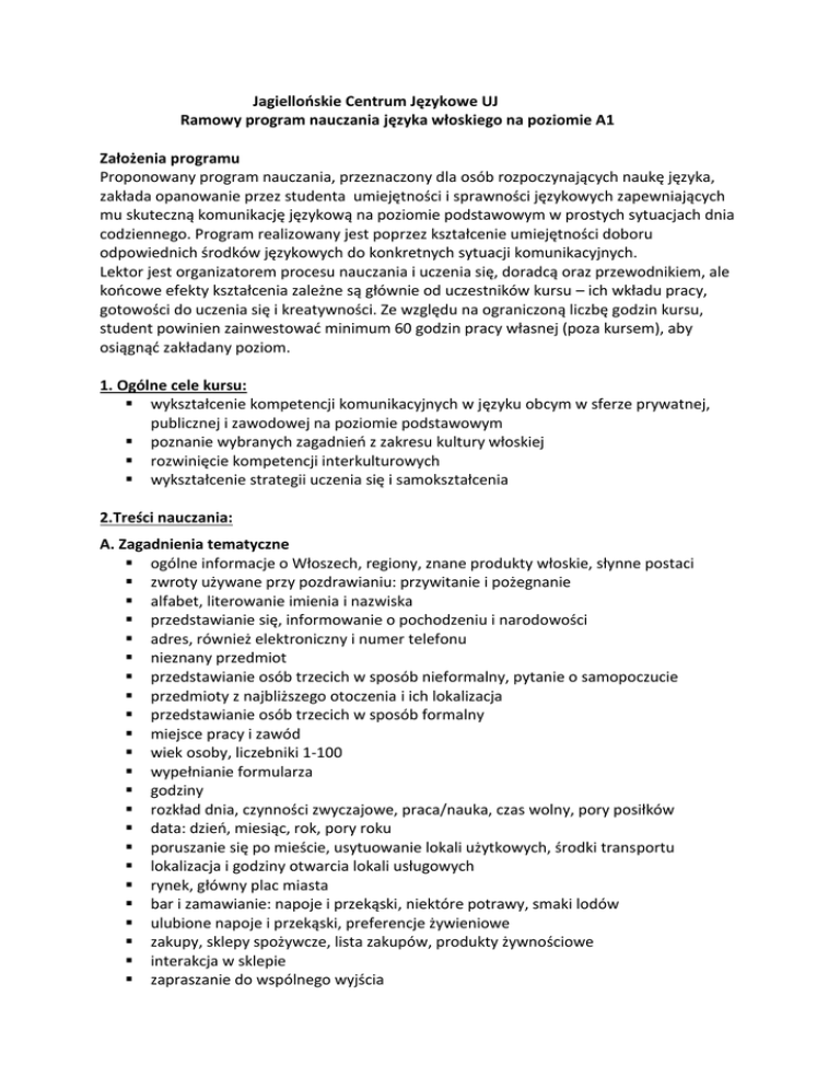 Jagiellońskie Centrum Językowe UJ Ramowy program nauczania języka włoskiego na poziomie A1 Założenia programu Proponowany program nauczania, przeznaczony dla osób rozpoczynających naukę języka, zakłada opanowanie przez studenta umiejętności i sprawności językowych zapewniających mu skuteczną komunikację językową na poziomie podstawowym w prostych sytuacjach dnia codziennego. Program realizowany jest poprzez kształcenie umiejętności doboru odpowiednich środków językowych do konkretnych sytuacji komunikacyjnych. Lektor jest organizatorem procesu nauczania i uczenia się, doradcą oraz przewodnikiem, ale końcowe efekty kształcenia zależne są głównie od uczestników kursu – ich wkładu pracy, gotowości do uczenia się i kreatywności. Ze względu na ograniczoną liczbę godzin kursu, student powinien zainwestować minimum 60 godzin pracy własnej (poza kursem), aby osiągnąć zakładany poziom. 1. Ogólne cele kursu: wykształcenie kompetencji komunikacyjnych w języku obcym w sferze prywatnej, publicznej i zawodowej na poziomie podstawowym poznanie wybranych zagadnień z zakresu kultury włoskiej rozwinięcie kompetencji interkulturowych wykształcenie strategii uczenia się i samokształcenia 2.Treści nauczania: A. Zagadnienia tematyczne ogólne informacje o Włoszech, regiony, znane produkty włoskie, słynne postaci zwroty używane przy pozdrawianiu: przywitanie i pożegnanie alfabet, literowanie imienia i nazwiska przedstawianie się, informowanie o pochodzeniu i narodowości adres, również elektroniczny i numer telefonu nieznany przedmiot przedstawianie osób trzecich w sposób nieformalny, pytanie o samopoczucie przedmioty z najbliższego otoczenia i ich lokalizacja przedstawianie osób trzecich w sposób formalny miejsce pracy i zawód wiek osoby, liczebniki 1-100 wypełnianie formularza godziny rozkład dnia, czynności zwyczajowe, praca/nauka, czas wolny, pory posiłków data: dzień, miesiąc, rok, pory roku poruszanie się po mieście, usytuowanie lokali użytkowych, środki transportu lokalizacja i godziny otwarcia lokali usługowych rynek, główny plac miasta bar i zamawianie: napoje i przekąski, niektóre potrawy, smaki lodów ulubione napoje i przekąski, preferencje żywieniowe zakupy, sklepy spożywcze, lista zakupów, produkty żywnościowe interakcja w sklepie zapraszanie do wspólnego wyjścia spędzania weekendu pogoda miejsce zamieszkania, dom, mieszkanie, rodzaje pomieszczeń rozmieszczenie sprzętów w pokoju, opis pomieszczenia określanie odległości i czasu potrzebnego do dotarcia do domu nazywanie i opisywanie odzieży, obuwia i akcesoriów, materiały, kolory, rozmiary przymierzanie ubrań i pytanie jak leżą monety, banknoty i sposoby płatności, liczebniki 100 – 1000 000 miniony weekend, ubiegłe wakacje, miejsca spędzania wakacji rezerwowanie pokoju w hotelu usługi w hotelu nazwy członków rodziny, wyrażenie pokrewieństwa opisywanie osób pod kątem wyglądu i charakteru formuły używane przy składaniu życzeń B. Zagadnienia gramatyczno-leksykalne zaimki osobowe w funkcji podmiotu pronomi personali - soggetto, forma grzecznościowa czasowniki verbi: essere, avere, stare czasownik chiamarsi 1,2 i 3 os. l.poj. czasownik piacere, konstrukcja: Mi piace…/Mi piacciono… rzeczowniki i przymiotniki oznaczające narodowość nomi e aggettivi di nazionalità zaimki pytające: chi?, che cosa?, come?, dove?, di dove? perché? quanto? quale? rzeczowniki sostantivi, rodzaj, liczba mnoga, formy regularne rodzajniki nieokreślone articoli indeterminativi przymiotniki aggettivi qualificativi, tworzenie rodzaju żeńskiego i liczby mnogiej zgodność rzeczownika i przymiotnika accordo sostantivo e aggettivo rodzajniki określone articoli determinativi czas teraźniejszy presente dell’indicativo czasowników regularnych I, II i III koniugacji czasowniki nieregularne: fare, venire, andare, dire, bere, salire, uscire, dare czasowniki andare i venire z przyimkami oznaczającymi bycie w/ruch ku miejscu czasowniki andare i venire z bezokolicznikiem partykuła zaimkowa ci: - Vai a Roma? - Si`, ci vado. czasowniki modalne verbi servili/modali: dovere, potere, volere, sapere czasownik volere w 1.osobie trybu przypuszczającego condizionzle semplice czasownik esserci, konstrukcja c’e`, ci sono przyimki proste preposizioni semplici: di, da, a, in, su, con, fra, per przyimki złożone preposizioni articolate zaimki i przymiotniki dzierżawcze i possessivi liczebniki główne 1-1000 i porządkowe 1-10 numeri cardinali i ordinali zaimek wskazujący pronome dimostrativo: questo czasowniki zwrotne verbi riflessivi, również z czasownikiem modalnym czasowniki na –care, -gare verbi in –care, -gare przysłówki częstotliwości avverbi di frequenza przysłówki miejsca avverbi di luogo: vicino a, lontano da, sotto, a sinistra, a destra itp. zaimki w dopelnieniu bliższym pronomi diretti zaimki w dopelnieniu dalszym pronomi indiretti czas przeszły bliższy passato prossimo imiesłów czasu przeszłego participio passato regolare e alcune forme irregolari przysłówek nigdy i podwojne przeczenie avverbio mai e la doppia negazione partykuła zaimkowa ci particella pronominale ci przymiotniki dzierżawcze również z rzeczownikami oznaczającymi pokrewienstwo aggettivi possessivi anche con i nomi di parentela zdania oznajmujące, pytajce, twierdzące i przeczące frasi dichiarative, interrogative, affermative e negative czasowniki zaimkowe volerci e metterci verbi pronominali volerci e metterci C. Wymowa i intonacja zasady wymowy spółgłosek, samogłosek, dyftongów akcent wyrazowy, akcent graficzny akcent zdaniowy i melodyczny intonacja w zdaniach oznajmujących, pytających i rozkazujących łączenie wyrazów w zadaniu D. Aspekt kulturowy Włochy: regiony i miasta rozpoznawanie sytuacji formalnej i nieformalnej, używania formy grzecznościowej zwroty stosowane przy powitaniu kobiety we Włoszech stawianie tytułów naukowych i 
