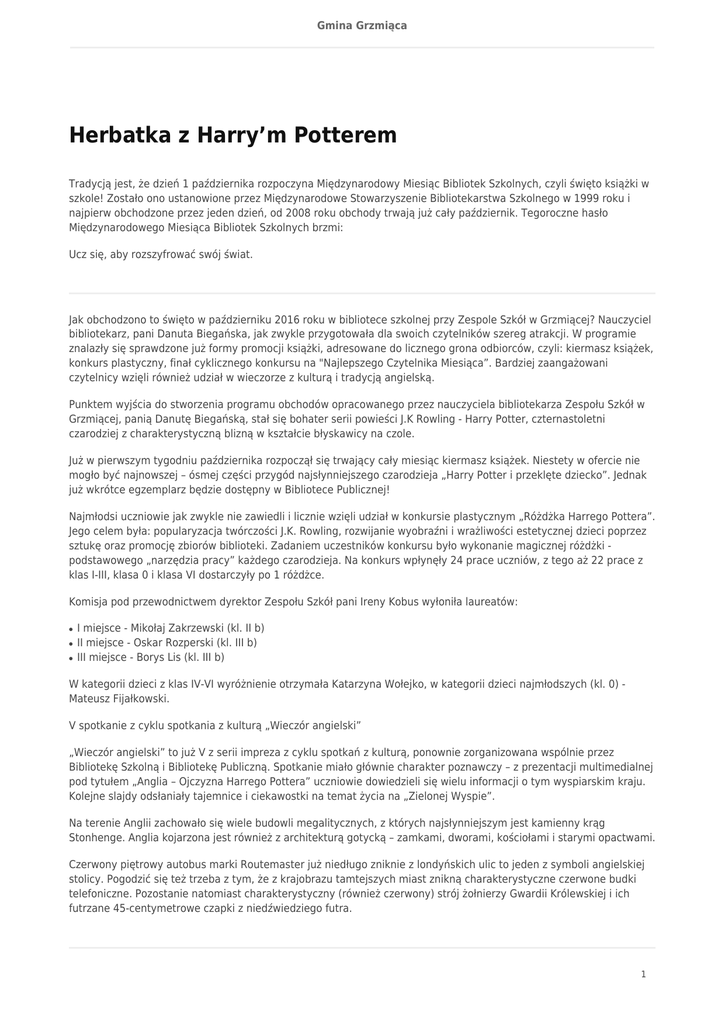 Gmina Grzmiąca Herbatka z Harry’m Potterem Tradycją jest, że dzień 1 października rozpoczyna Międzynarodowy Miesiąc Bibliotek Szkolnych, czyli święto książki w szkole! Zostało ono ustanowione przez Międzynarodowe Stowarzyszenie Bibliotekarstwa Szkolnego w 1999 roku i najpierw obchodzone przez jeden dzień, od 2008 roku obchody trwają już cały październik. Tegoroczne hasło Międzynarodowego Miesiąca Bibliotek Szkolnych brzmi: Ucz się, aby rozszyfrować swój świat. Jak obchodzono to święto w październiku 2016 roku w bibliotece szkolnej przy Zespole Szkół w Grzmiącej? Nauczyciel bibliotekarz, pani Danuta Biegańska, jak zwykle przygotowała dla swoich czytelników szereg atrakcji. W programie znalazły się sprawdzone już formy promocji książki, adresowane do licznego grona odbiorców, czyli: kiermasz książek, konkurs plastyczny, finał cyklicznego konkursu na "Najlepszego Czytelnika Miesiąca”. Bardziej zaangażowani czytelnicy wzięli również udział w wieczorze z kulturą i tradycją angielską. Punktem wyjścia do stworzenia programu obchodów opracowanego przez nauczyciela bibliotekarza Zespołu Szkół w Grzmiącej, panią Danutę Biegańską, stał się bohater serii powieści J.K Rowling - Harry Potter, czternastoletni czarodziej z charakterystyczną blizną w kształcie błyskawicy na czole. Już w pierwszym tygodniu października rozpoczął się trwający cały miesiąc kiermasz książek. Niestety w ofercie nie mogło być najnowszej – ósmej części przygód najsłynniejszego czarodzieja „Harry Potter i przeklęte dziecko”. Jednak już wkrótce egzemplarz będzie dostępny w Bibliotece Publicznej! Najmłodsi uczniowie jak zwykle nie zawiedli i licznie wzięli udział w konkursie plastycznym „Różdżka Harrego Pottera”. Jego celem była: popularyzacja twórczości J.K. Rowling, rozwijanie wyobraźni i wrażliwości estetycznej dzieci poprzez sztukę oraz promocję zbiorów biblioteki. Zadaniem uczestników konkursu było wykonanie magicznej różdżki podstawowego „narzędzia pracy” każdego czarodzieja. Na konkurs wpłynęły 24 prace uczniów, z tego aż 22 prace z klas I-III, klasa 0 i klasa VI dostarczyły po 1 różdżce. Komisja pod przewodnictwem dyrektor Zespołu Szkół pani Ireny Kobus wyłoniła laureatów: ● ● ● I miejsce - Mikołaj Zakrzewski (kl. II b) II miejsce - Oskar Rozperski (kl. III b) III miejsce - Borys Lis (kl. III b) W kategorii dzieci z klas IV-VI wyróżnienie otrzymała Katarzyna Wołejko, w kategorii dzieci najmłodszych (kl. 0) Mateusz Fijałkowski. V spotkanie z cyklu spotkania z kulturą „Wieczór angielski” „Wieczór angielski” to już V z serii impreza z cyklu spotkań z kulturą, ponownie zorganizowana wspólnie przez Bibliotekę Szkolną i Bibliotekę Publiczną. Spotkanie miało głównie charakter poznawczy – z prezentacji multimedialnej pod tytułem „Anglia – Ojczyzna Harrego Pottera” uczniowie dowiedzieli się wielu informacji o tym wyspiarskim kraju. Kolejne slajdy odsłaniały tajemnice i ciekawostki na temat życia na „Zielonej Wyspie”. Na terenie Anglii zachowało się wiele budowli megalitycznych, z których najsłynniejszym jest kamienny krąg Stonhenge. Anglia kojarzona jest również z architekturą gotycką – zamkami, dworami, kościołami i starymi opactwami. Czerwony piętrowy autobus marki Routemaster już niedługo zniknie z londyńskich ulic to jeden z symboli angielskiej stolicy. Pogodzić się też trzeba z tym, że z krajobrazu tamtejszych miast znikną charakterystyczne czerwone budki telefoniczne. Pozostanie natomiast charakterystyczny (również czerwony) strój żołnierzy Gwardii Królewskiej i ich futrzane 45-centymetrowe czapki z niedźwiedziego futra. 1 Gmina Grzmiąca Obowiązkowo każdy turysta powinien sobie zrobić zdjęcie w towarzystwie woskowych sław pozujących w Muzeum Figur Woskowych Madame Tussaud założonym w 1835 przez Marie Tussaud. Medal z portretem młodej królowej Wiktorii był wzorem dla pierwszego znaczka pocztowego. 6 maja 1840 r. Wielka Brytania wprowadziła do obiegu pierwszy na świecie znaczek pocztowy o nominale jednego pensa (w czarnym kolorze, tzw. „Penny Black”). Znaczek przedstawiał podobiznę Królowej Wiktorii, a profil twarzy Królowej na znaczku nie zmieniał się przez 60 lat. Takiego znaczka w swoim klaserze nie posiadała wprawdzie prowadząca spotkanie, ale słuchacze mogli dowiedzieć się co nieco o hobby zwanym filatelistyką, czyli kolekcjonowaniu wszelkiego rodzaju walorów pocztowych, głównie znaczków pocztowych. Anglia jest ojczyzną wielu wybitnych pisarzy i filozofów. Najbardziej znanym przedstawicielem literatury brytyjskiej jest William Szekspir znany wszystkim ze stworzenia postaci Romeo i Julii. Obok niego należy wymienić: Johna Miltona, Charlesa Dickensa, Jane Austen, George’a Orwella, Agatę Christie, J.R.R. Tolkiena, i oczywiście J.K. Rowlling. Ostatni slajd prezentacji dotyczył brytyjskiego zwyczaju picia popołudniowej herbaty. Zgodnie z tradycją piąta po południu to tzw. Tea Time - czas zarezerwowany na filiżankę mocnego czarnego naparu (i drobną słodką przekąskę) wypijanego w towarzystwie domowników lub przyjaciół. Na degustację angielskiej herbatki zaproszeni zostali również goście przybyli na „Wieczór angielski”. Po kilku kubkach smakowitego naparu odbył się błyskawiczny test sprawdzający wiedzę zaprezentowaną w trakcie prezentacji. Obecna na spotkaniu dyrektor ZS w Grzmiącej, pani Irena Kobus, była pod wrażeniem błyskotliwych i błyskawicznych odpowiedzi. Impreza nie mogła obyć się bez typowo książkowego akcentu. Uczestniczący w niej goście wspólnie odczytali fragmenty książki „Harry Potter i kamień filozoficzny”. Po krótkiej rozmowie na temat przeczytanego tekstu goście zabrali się do pisania listu do bohatera wieczoru. Zadanie to poprzedzone było instruktażem prowadzącej dotyczącym kompozycji listu, te