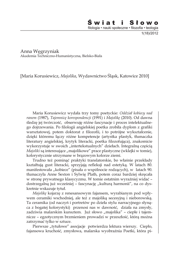 Świat i Słowo filologia • nauki społeczne • filozofia • teologia 1(18)/2012 Anna Węgrzyniak Akademia Techniczno-Humanistyczna, Bielsko-Biała [Maria Korusiewicz, Majolika, Wydawnictwo Śląsk, Katowice 2010] Maria Korusiewicz wydała trzy tomy poetyckie: Oddział kobiecy nad ranem (1987), Tajemnicę korespondencji (1991) i Majolikę (2010). Od dawna śledzę jej twórczość, obserwuję różne fascynacje i proces intelektualnego dojrzewania. Po filologii angielskiej poetka zrobiła dyplom z grafiki warsztatowej, potem doktorat z filozofii, i to potrójne wykształcenie, dzięki któremu łączy różne kompetencje (artystka plastyk, tłumaczka literatury angielskiej, krytyk literacki, poetka filozofująca), znakomicie wykorzystuje w swoich „intertekstualnych” dziełach. Integralną częścią Majoliki są interesujące „majolikowe” prace plastyczne (wklejki w tomie), kolorystycznie utrzymane w brązowym kolorze ziemi. Trudno też pominąć praktyki translatorskie, bo właśnie przekłady kształtują gust literacki, sprzyjają refleksji nad estetyką. W latach 80. manifestowała „kobiece” (pisała o wspólnocie rodzących), w latach 90. tłumaczyła Anne Sexton i Sylwię Plath, potem coraz bardziej skręcała w stronę prywatnego klasycyzmu. W tomie ostatnim wyraźniej widać – dostrzegalną już wcześniej – fascynację „kulturą harmonii”, na co dyskretnie wskazuje tytuł. Majolikę kojarzę z renesansowym fajansem, wyrabianym pod wpływem ceramiki wschodniej, ale też z majoliką secesyjną i nieborowską. Ta ceramika (od naczyń i portretów po dzieła stylu narracyjnego słynąca z bogatej kolorystyki) przenosi nas w dawność, działa na zmysły, zadziwia malarskim kunsztem. Już słowo „majolika” – ciepłe i tajemnicze – egzotycznym brzmieniem prowadzi w przeszłość, którą można zatrzymać tylko w sztuce. Pierwsze „tytułowe” asocjacje potwierdza lektura wierszy. Ciepło, fajansowa kruchość, zmysłowa, malarska wyobraźnia Poetki, która pi- 212 Anna Węgrzyniak sze/maluje znaczącymi detalami – to cechy pozwalające dostrzec kontynuację „majolikowej” tradycji. Otwierający tomik wiersz Vermeer (1958) – liryczną kontemplację obrazu Nalewająca mleko – natychmiast kojarzę z Pokojem umeblowanym Herberta, Vermeerem Szymborskiej i Malarzami Holandii Zagajewskiego. W takim towarzystwie Maria Korusiewicz nie znalazła się przypadkiem, jej liryka kontynuuje podobną „linię wierności” dawnym mistrzom, którzy umieli „mieszkać”, którzy cenili zwykłe cuda codziennego bytowania, chwytali „wieczność chwili”. Autorka Majoliki jest poetką korespondencji: ponad wiekami rozmawia z Vermeerem, ale też dialoguje z Herbertem, Szymborską, Zagajewskim. Herberta kusi złote światło, Szymborska eksponuje ciszę i skupienie kobiety, natomiast Korusiewicz w Vermeerowskiej postaci widzi „łagodne czuwanie nad biegnącą bielą”. Czuwanie kobiece, czułe, bolesno-oczyszczające, o którym mówi, że jest ono „jak ran omywanie jak witanie zmarłych”: Ostateczna czułość tkwi w porządku Rzeczy W mrocznym tunelu dzbanka drzemie nienazwane Ciemny rytuał przejścia gdzieś na inną stronę W jej interpretacji biel mleka koresponduje z „krochmaloną bielą płótna”. Biel farby (użytej przez malarza) na płótnie łączy mleko z czepkiem, a symboliczną „jasność” i czystość „bieli” poetka łączy z mrokiem, ciemnością, śmiercią (w płótno owija się zmarłych). Znakomicie uchwycone Vermeerowskie „światło poranka”, w którym „sen ciała i gliny […] rozkwita // prosto w błękit” zapowiada istotny dla tego tomu wątek metafizyczny. Wraz z Nalewającą mleko wchodzimy tutaj w obszar Bieli: zimy, lodu, śmierci, samotności. W tomie Majolika wiele ciszy, zadumy, szeptu, wspomnień, migawek z życia osób, które odeszły. „Krochmaloną biel” odnajduję też w wierszu Emilia Machnik z domu Pyzik. Emilia (zapewne babka autorki) wspomina konkretną chwilę: to październik roku 1919 lub 1920, ktoś idzie i gwiżdże, a Wilhelm, Józek, Rutka i Emilia siedzą „przy sosnowym stole/ owiniętym w chłodną krochmaloną biel”. Emilia nie pamięta „żadnego przedtem ani potem/ tylko bezwiedne trwanie wokół bieli stołu”, narzeka na pamięć „pustą bezbarwną”, ale pamięta, że siedzieli ciepłym kręgu światła – bliskich łączył „kuchenny stół”, na którym „szklanka mleka drogowskaz świecący nad / żółtą serwetką”. Jaka sztuka ukształtowała „oko” Marii Korusiewicz, można odczytać z wierszy; Tintoretto, Zurbarán, mali Holendrzy, ale głównie Vermeer i majolika: Obok dymi szklanka zimowej herbaty nóż złocista wstążka cytrynowej skórki Majolika blada porcelana snów (Rozmawiając przez telefon piętnastego marca) Zauważam to zwłaszcza w lirycznych narracjach, osnutych na wydarzeniach, które są nam prawie nieznane, jak pojedynek na wyspie Funajima: Błyszczy lakierowana skóra nagolenników metal rękawic pryska piach Ciężkie chmury gniotą siność wód [….] Lekko migają drobne zmarszczki lśniące fałdki fal u wybrzeży Funajimy (Plaża Funajima 13 kwietnia 1612) W opowieściach „japońskich” szklankę herbaty zastępuje „czarka z herbatą”. W wierszach Korusiewicz stale powraca motyw herbaty (czy mleka), jako stały rekwizyt portretowanych postaci. Herbata ma być gorąca (ona „dymi”), ma dawać ciepło, grzać. Bo w tym świecie najważniejsze jest ciepło: dłoni, spojrzenia, przyjaźni. Bohaterka wiersza Wielkie Morze Piasku – turystka zwiedzająca zasypane piaskiem ogrody „pierwszego w historii Japonii mistrza ceremonii herbaty” – wspomina tego, który przed śmiercią „po raz ostatni przygotował herbatę dla swoich przyjaciół”. O czym Korusiewicz opowiada? O zburzeniu Troi i wyburzeniu górniczych domków w Katowicach, o bitwie pod San Romano i pojedynku samurajów, o miłości, zdradzie, umierani