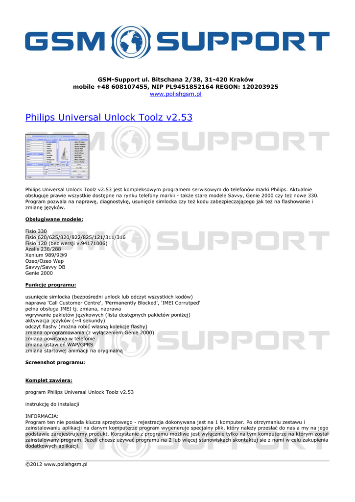 GSM-Support ul. Bitschana 2/38, 31-420 Kraków mobile +48 608107455, NIP PL9451852164 REGON: 120203925 www.polishgsm.pl Philips Universal Unlock Toolz v2.53 Philips Universal Unlock Toolz v2.53 jest kompleksowym programem serwisowym do telefonów marki Philips. Aktualnie obsługuje prawie wszystkie dostępne na rynku telefony markii - także stare modele Savvy, Genie 2000 czy też nowe 330. Program pozwala na naprawę, diagnostykę, usunięcie simlocka czy też kodu zabezpieczającego jak też na flashowanie i zmianę języków. Obsługiwane modele: Fisio 330 Fisio 620/625/820/822/825/121/311/316 Fisio 120 (bez wersji v.94171006) Azalis 238/288 Xenium 989/9@9 Ozeo/Ozeo Wap Savvy/Savvy DB Genie 2000 Funkcje programu: usunięcie simlocka (bezpośredni unlock lub odczyt wszystkich kodów) naprawa 'Call Customer Centre', 'Permanently Blocked', 'IMEI Corrutped' pełna obsługa IMEI tj. zmiana, naprawa wgrywanie pakietów językowych (lista dostępnych pakietów poniżej) aktywacja języków (~4 sekundy) odczyt flashy (można robić własną kolekcje flashy) zmiana oprogramowania (z wyłączeniem Genie 2000) zmiana powitania w telefonie zmiana ustawień WAP/GPRS zmiana startowej animacji na oryginalną Screenshot programu: Komplet zawiera: program Philips Universal Unlock Toolz v2.53 instrukcję do instalacji INFORMACJA: Program ten nie posiada klucza sprzętowego - rejestracja dokonywana jest na 1 komputer. Po otrzymaniu zestawu i zainstalowaniu aplikacji na danym komputerze program wygeneruje specjalny plik, który należy przesłać do nas a my na jego podstawie zarejestrujemy produkt. Korzystanie z programu możliwe jest wyłącznie tylko na tym komputerze na którym został zainstalowany program. Jeżeli chcesz używać programu na 2 lub więcej stanowiskach skontaktuj sie z nami w celu zakupienia dodatkowych aplikacji. ©2012 www.polishgsm.pl Opis ten nie stanowi oferty w rozumieniu Kodeksu Cywilnego. GSM-Support zastrzega sobie prawo do możliwych błędów w opisie produktu. Prosimy o weryfikację z Państwa strony, a w razie wątpliwości o kontakt. GSM-Support ul. Bitschana 2/38 31-420 Kraków POLSKA tel. 608107455 e-mail: [email protected] Powered by TCPDF (www.tcpdf.org)