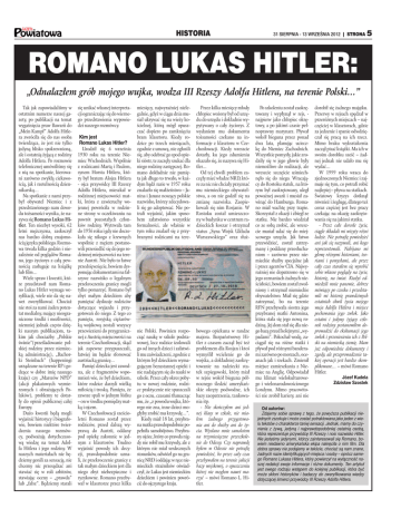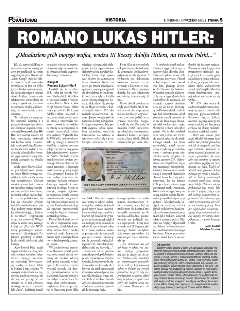 HISTORIA 31 SIERPNIA - 13 WRZEŚNIA 2012 | STRONA 5 ROMANO LUKAS HITLER: „Odnalazłem grób mojego wujka, wodza III Rzeszy Adolfa Hitlera, na terenie Polski…” Tak jak zapowiadaliśmy w ostatnim numerze naszej gazety, po publikacji na temat wygaśnięcia praw Bawarii do „Mein Kampf” Adolfa Hitlera zwróciła się do nas osoba twierdząca, że jest nie tylko jedyną blisko spokrewnioną, ale i ostatnią żyjącą z rodziny Adolfa Hitlera. Po rozmowie telefonicznej umówiliśmy się z nią na spotkanie, kierowani zarówno zwykłą ciekawością, jak i rzetelnością dziennikarską… Na spotkanie z nami przybył obywatel Niemiec i z przedstawionego nam dowodu tożsamości wynika, że nazywa się Romano Lukas Hitler. Ten niezbyt wysoki, 62 letni mężczyzna, zaskoczył nas bardzo dobrą znajomością języka polskiego. Rozmowa trwała kilka godzin i niezależnie od poglądów Romano, jego życiorys z całą pewnością zasługuje na książkę lub film… Wiele spraw i kwestii, które przedstawił nam Romano Lukas Hitler wymaga weryfikacji, wiele nie da się nawet zweryfikować. Chociaż nie stoi za nami żaden potentat medialny, mający nieograniczone środki i możliwości, niemniej jednak często dzięki naszym publikacjom, takim jak chociażby „Polskie świnie”(prześladowanie polskiej rodziny przez niemiecką administrację), „Bachorki Steinbach” (happeningi urządzane na terenie RP i godzące w dobre imię naszego kraju) czy „Marszów NPD” (akcji plakatowych wymierzonych i obrażających Polaków), problemy te dotarły do opinii publicznej całej Europy. Dużo kwestii będą mogli wyjaśnić historycy i biografowie, bowiem niektóre twierdzenia naszego rozmówcy, podważają dotychczasową wiedzę na temat Adolfa Hitlera i jego rodziny. W naszych materiałach nie będziemy gonili za sensacją, nie chcemy nic przesądzać ani stawiać się w roli arbitrów, stawiając oceny – „prawda” lub „fałsz”. Będziemy starali się unikać własnej interpretacji ograniczając się do wiernego przedstawienia wypowiedzi naszego rozmówcy. Kim jest Romano Lukas Hitler? Urodził się 6 września 1950 roku na terenie Niemiec Wschodnich. Wspólnie z rodzicami Martą i Paulem, synem Horsta Hitlera, który był bratem Alojza Hitlera - ojca przywódcy III Rzeszy Adolfa Hitlera, mieszkał w rodzinnej miejscowości matki, która z zawieruchy wojennej powróciła w rodzinne strony w oczekiwaniu na powrót pozostałych członków rodziny. Wytrwała tam do 1956 roku i gdy nie doczekała się nikogo z krewnych wspólnie z mężem postanowili przesiedlić się do jego rodzinnej miejscowości na terenie Austrii. Nie było to łatwe przedsięwzięcie, bowiem dysponując dokumentami na fałszywe nazwisko o legalnym przekroczeniu granicy mogli tylko pomarzyć. Romano był zbyt małym dzieckiem aby pamiętać dyskusje rodziców dotyczące wyjazdu i przygotowań do niego. Z tego co pamięta, rosyjską ciężarówką wojskową zostali wszyscy przewiezieni do przygranicznej z Austrią miejscowości na terenie Czechosłowacji, skąd jak zapewne przypuszczali, łatwiej im będzie sforsować austriacką granicę… Pamięć dziecka jest zawodna, ale z fragmentów wspomnień wie, że był dzieckiem, które rodzice darzyli wielką miłością i troską. Pamięta, że zawsze spali w jednym łóżku – on w środku pomiędzy matką i ojcem. W Czechosłowacji sześcioletni Romano został przez rodziców, przed dalszą wyprawą do Austrii, oddany pod opiekę zakonnic w jednym z klasztorów. Trudno wyjaśnić powody ich decyzji, prawdopodobnie uznali, że przekroczenie granicy z tak małym dzieckiem jest dla niego zbyt niebezpieczne i ryzykowne. Romano przebywał w klasztorze przez kilka miesięcy, najwyraźniej nielegalnie, gdyż w ciągu dnia musiał ukrywać się na wieży kościelnej, którą mógł opuszczać dopiero po zamknięciu bram klasztoru. Kiedy rodzice po trzech miesiącach, zgodnie z umową, nie zgłosili się, aby odebrać go spod opieki sióstr, te zaczęły szukać dla niego rodziny zastępczej. Romano dokładnie nie pamięta jak długo to trwało, w każdym bądź razie w 1957 roku znalazło się małżeństwo – Janina i Janusz noszący polskie nazwisko, którzy zdecydowali się go adoptować. Nie potrafi wyjaśnić, jakim sposobem załatwiono wszystkie formalności, ale właśnie w tym roku znalazł się z przybranymi rodzicami na tere- Przez kilka miesięcy młody chłopiec wożony był od urzędu do urzędu i dokładnie wypytywany o cały życiorys. Z wydaniem mu dokumentu tożsamości czekano na informacje z klasztoru w Czechosłowacji. Kiedy wreszcie dotarły, ku jego zdumieniu okazało się, że nazywa się Hitler… Od tej chwili problem zaczęły mieć władze NRD, które za nic nie chciały przyznać mu niemieckiego obywatelstwa, a on nie godził się na zmianę nazwiska. Zaopiekowali się nim Rosjanie. W Rostoku został umieszczony w budynku w centrum radzieckich koszar i otrzymał status „Syna Wojsk Układu Warszawskiego” oraz służ- nie Polski. Powinien rozpocząć naukę w szkole podstawowej, lecz rodzice izolowali go od innych dzieci i załatwili mu zaświadczeni, zgodnie z którym był dzieckiem wymagającym bezustannej opieki i nie nadającym się do nauki w szkole. Przez cały okres pobytu w nowej rodzinie, rodzice praktycznie nie spuszczali go z oczu, czasami tłumacząc mu, że „z powodu wujka, którego nie zna, inne dzieci mogłyby zrobić mu krzywdę…”. Kiedy miał 18 lat, przybrana matka prawdopodobnie popełniła samobójstwo. Przybrany ojciec, który co prawda nigdy nie robił mu krzywdy, ale z którym nie miał serdecznych stosunków, odwiózł go na granicę NRD i oddając w ręce niemieckich strażników oświadczył, że Lukas jest niemieckim dzieckiem i powinien powrócić do ojczystego kraju. bowego opiekuna w randze majora. Bezpaństwowy Hitler z czasem zaczął być też problemem dla Rosjan i ktoś wymyślił wcielenie go do wojska, a