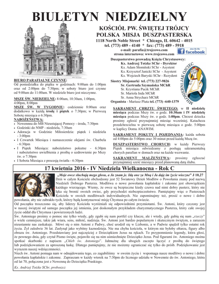 BIULETYN NIEDZIELNY KOĝCIÓà PW. ĝWIĉTEJ TRÓJCY POLSKA MISJA DUSZPASTERSKA 1118 North Noble Street * Chicago, IL 60642 - 4015 tel. (773) 489 - 4140 * fax: (773) 489 - 5918 e-mail: [email protected] strona internetowa: www.trojcowo.com Duszpasterstwo prowadzą KsiĊĪa Chrystusowcy: Ks. Andrzej Totzke SChr - Dyrektor Ks. Adam SáomiĔski SChr - Asystent Ks. Krzysztof Janicki SChr - Asystent Ks. Wojciech Baryski SChr - Rezydent BIURO PARAFIALNE CZYNNE: Od poniedziaáku do piątku w godzinach: 9:00am do 1:00pm oraz od 2:00pm do 7:30pm; w soboty biuro jest czynne od 9:00am do 11:00am. W niedziele biuro jest nieczynne. MSZE ĝW. NIEDZIELNE: 8:00am, 10:30am, 1:00pm, 4:00pm, 8:00pm MSZE ĝW. W TYGODNIU: codziennie 8:00am oraz dodatkowo w kaĪdą ĞrodĊ i piątek o 7:30pm; w Pierwszą SobotĊ miesiąca o 6:30pm. NABOĩEēSTWA: • Nowennna do MB Nieustającej Pomocy - Ğroda, 7:30pm • Godzinki do NMP - niedziela, 7:30am • Adoracja w Godzinie Miáosierdzia: piątek i niedziela - 3:00pm • I Czwartek Miesiąca i namaszczenie olejami Ğw. Charbela - 6:30pm • I Piątek Miesiąca: naboĪeĔstwo pokutne - 6:30pm i naboĪeĔstwo uwielbienia z proĞbą o uzdrowienie po Mszy Ğw. o 7:30pm • I Sobota Miesiąca z procesją Ğwiatáa - 6:30pm Siostry Misjonarki tel. (773) 227-9826 Sr. Gertruda SzymaĔska MChR Sr. Krystiana Pucik MChR Sr. Mariola Inda MChR Sr. Anna Strycharz MChR Organista - Mariusz Pluta tel. (773) -640-1379 SAKRAMENT CHRZTU ĝWIĉTEGO: w II niedzielĊ miesiąca podczas Mszy Ğw. o godz. 10:30am i IV niedzielĊ miesiąca podczas Mszy Ğw. o godz. 1:00pm. Chrzest dziecka prosimy zgáosiü przynajmniej miesiąc wczeĞniej. Katacheza przedchrzcielna w pierwszą sobotĊ miesiąca o godz. 5:00pm w kaplicy Domu ANAWIM. SAKRAMENT POKUTY I POJEDNANIA: kaĪda sobota od 4:00pm do 5:00pm oraz 30 minut przed kaĪdą Mszą Ğw. DUSZPASTERSTWO CHORYCH: w kaĪdy Pierwszy Piątek miesiąca odwiedzamy z posáugą sakramentalną chorych parafian w domach oraz na kaĪde wezwanie. SAKRAMENT MAàĩEēSTWA: prosimy zgáaszaü przynajmniej szeĞü miesiĊcy przed planowaną datą Ğlubu. 17 kwietnia 2016 - IV Niedziela Wielkanocna - Rok C „Moje owce sáuchają mego gáosu, a Ja znam je. Idą one za Mną i Ja dajĊ im Īycie wieczne” J 10,27 DziĞ w caáym KoĞciele obchodzony jest 52 ĝwiatowy DzieĔ Modlitw o Powoáania znany pod nazwą Niedzieli Dobrego Pasterza. Modlitwa o nowe powoáania kapáaĔskie i zakonne jest obowiązkiem kaĪdego wierzącego. Wiemy, Īe owce są bezpieczne kiedy czuwa nad nimi dobry pasterz, który nie lĊka siĊ broniü swoich owiec, gdy przychodzi niebezpieczeĔstwo. PamiĊtajmy wiĊc o Pasterzach KoĞcioáa w swoich modlitwach indywidualnych. Nie zapominajmy teĪ, prosiü o nowe i dobre powoáania, aby nie zabrakáo tych, którzy bĊdą kontynuowaü misjĊ Chystusa po caáym Ğwiecie. Od początku troszczono siĊ, aby liderzy KoĞcioáa wyróĪniali siĊ odpowiednimi przymiotami. ĝw. Antoni, który czczony jest w naszej Ğwiątyni od samego początku jej istnienia, jest doskonaáym przykáadem charyzmatycznego Pasterza, który caáe swojej Īycie oddaá dla Chrystusa i powierzonych ludzi. ĝw. Antoniego proĞmy o pomoc nie tylko wtedy, gdy zgubi siĊ nam portfel czy klucze, ale i wtedy, gdy gubią siĊ nam „rzeczy” o wiele cenniejsze, takie jak wiara, sens, miáoĞü, nadzieja. ĝw. Antoni jest bardzo popularnym i skutecznym ĞwiĊtym, a zarazem nieustannie nas zaskakuje. Mówi siĊ o nim Antoni z Padwy, choü urodziá siĊ w Lizbonie, a w Padwie spĊdziá tylko ostatni rok Īycia. ĩyá zaledwie 36 lat. Zasáynąá jako wybitny kaznodzieja. Nie ma chyba koĞcioáa, w którym nie byáoby oátarza, figury albo obrazu Ğw. Antoniego. Przedstawiany jest najczĊĞciej z Dzieciątkiem Jezus na rĊkach. To przypomnienie legendy, która gáosi, Īe pewnego dnia, gdy czytaá Pismo ĞwiĊte, pojawiáo siĊ na nim uĞmiechniĊte Dzieciątko Jezus. Pod figurami Ğw. Antoniego moĪna spotkaü skarbonki z napisem „Chleb Ğw. Antoniego”. JaámuĪnĊ dla ubogich zaczĊto áączyü z proĞbą do ĞwiĊtego lub podziĊkowaniem za uproszoną áaskĊ. Dlatego pamiĊtajmy, Īe nie moĪemy ograniczaü siĊ tylko do próĞb. PodziĊkowanie jest wyrazem naszej wdziĊczmnoĞci. Niech Ğw. Antoni pomaga nam w odnajdowaniu tego, co zagubiliĞmy w swoim Īyciu i wspomaga nasze modlitwy o nowe i dobre powoáania kapáaĔskie i zakonne. Zapraszam w kaĪdy wtorek na 7:30pm do licznego udziaáu w Nowennie do Ğw. Antoniego, która od lat 70, poáączona jest z Nowenną do Dzieciątka Praskiego. Ks. Andrzej Totzke SChr, proboszcz ROZWAĩANIA O MIàOSIERDZIU BOĩYM opracowane na podstawie publikacji ks. dr Michaáa Sopoüki MIàOĝû JAKO DAē WDZIĉCZNOĝCI ZA MIàOSIERDZIE BOĩE "Ja jestem Pan, Bóg twój OkazujĊ áaskĊ aĪ do tysiącznego pokolenia tym, którzy Mnie miáują" (Wj 20,2.6) MiáoĞü Boga jest gáównym obowiązkiem naszym wzglĊdem Miáosiernego Stwórcy naszego, to gáówne prawo Ğwiata, to gáówne i najwyĪsze przeznaczenie czáowieka. Jak sáoĔce jest na to, aby nam przyĞwiecaáo, jak ogieĔ istnieje po to, aby grzaá i paliá, jak roĞliny sadzimy, aby nam wydawaáy owoce - tak czáowiek na to tylko istnieje, aby ukochaá StwórcĊ swego miáoĞcią ponad wszystko na Ğwiecie. UsuĔmy miáoĞü, a dzieáo naszego stworzenia byáoby do gruntu zwichniĊte. Co ojcu po dzieciach bez serca? Co Bogu po stworzeniach rozumnych, które nie páaciáyby Mu sáodkiej daniny miáoĞci? Obowiązek miáoĞci Boga wypáywa z prawa natury i z samego przeznaczenia czáowieka. Dlatego Ğw. Paweá naucza, Īe bez miáoĞci wszystko jest niczym: ani wiara, ani dobre uczynki, ani nawet mĊczeĔstwo zastąpiü jej nie mogą: „Gdybym mówiá jĊzykami ludzi i anioáów,a miáoĞci bym nie miaá, staábym siĊ jak miedĨ brzĊcząca albo cymbaá brzmiący. Gdybym teĪ miaá dar prorokowania i znaá wszystkie tajemnice, i posiadaá wszelką wiedzĊ, i wiarĊ miaá tak wielką, iĪbym