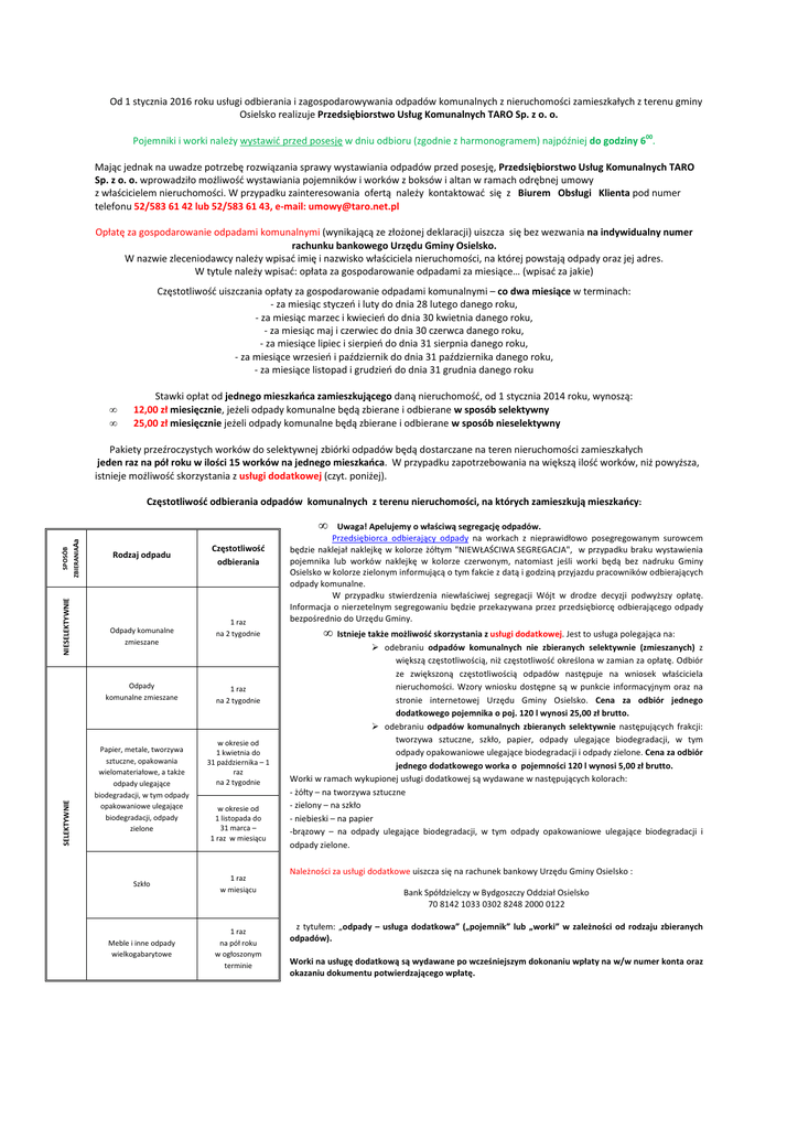 Od 1 stycznia 2016 roku usługi odbierania i zagospodarowywania odpadów komunalnych z nieruchomości zamieszkałych z terenu gminy Osielsko realizuje Przedsiębiorstwo Usług Komunalnych TARO Sp. z o. o. Pojemniki i worki należy wystawić przed posesję w dniu odbioru (zgodnie z harmonogramem) najpóźniej do godziny 600. Mając jednak na uwadze potrzebę rozwiązania sprawy wystawiania odpadów przed posesję, Przedsiębiorstwo Usług Komunalnych TARO Sp. z o. o. wprowadziło możliwość wystawiania pojemników i worków z boksów i altan w ramach odrębnej umowy z właścicielem nieruchomości. W przypadku zainteresowania ofertą należy kontaktować się z Biurem Obsługi Klienta pod numer telefonu 52/583 61 42 lub 52/583 61 43, e-mail: [email protected] Opłatę za gospodarowanie odpadami komunalnymi (wynikającą ze złożonej deklaracji) uiszcza się bez wezwania na indywidualny numer rachunku bankowego Urzędu Gminy Osielsko. W nazwie zleceniodawcy należy wpisać imię i nazwisko właściciela nieruchomości, na której powstają odpady oraz jej adres. W tytule należy wpisać: opłata za gospodarowanie odpadami za miesiące… (wpisać za jakie) Częstotliwość uiszczania opłaty za gospodarowanie odpadami komunalnymi – co dwa miesiące w terminach: - za miesiąc styczeń i luty do dnia 28 lutego danego roku, - za miesiąc marzec i kwiecień do dnia 30 kwietnia danego roku, - za miesiąc maj i czerwiec do dnia 30 czerwca danego roku, - za miesiące lipiec i sierpień do dnia 31 sierpnia danego roku, - za miesiące wrzesień i październik do dnia 31 października danego roku, - za miesiące listopad i grudzień do dnia 31 grudnia danego roku • • Stawki opłat od jednego mieszkańca zamieszkującego daną nieruchomość, od 1 stycznia 2014 roku, wynoszą: 12,00 zł miesięcznie, jeżeli odpady komunalne będą zbierane i odbierane w sposób selektywny 25,00 zł miesięcznie jeżeli odpady komunalne będą zbierane i odbierane w sposób nieselektywny Pakiety przeźroczystych worków do selektywnej zbiórki odpadów będą dostarczane na teren nieruchomości zamieszkałych jeden raz na pół roku w ilości 15 worków na jednego mieszkańca. W przypadku zapotrzebowania na większą ilość worków, niż powyższa, istnieje możliwość skorzystania z usługi dodatkowej (czyt. poniżej). Częstotliwość odbierania odpadów komunalnych z terenu nieruchomości, na których zamieszkują mieszkańcy: SPOSÓB NIESELEKTYWNIE ZBIERANIAAa • Rodzaj odpadu Odpady komunalne zmieszane SELEKTYWNIE Odpady komunalne zmieszane Papier, metale, tworzywa sztuczne, opakowania wielomateriałowe, a także odpady ulegające biodegradacji, w tym odpady opakowaniowe ulegające biodegradacji, odpady zielone Częstotliwość odbierania 1 raz na 2 tygodnie 1 raz na 2 tygodnie w okresie od 1 kwietnia do 31 października – 1 raz na 2 tygodnie w okresie od 1 listopada do 31 marca – 1 raz w miesiącu Szkło 1 raz w miesiącu Meble i inne odpady wielkogabarytowe 1 raz na pół roku w ogłoszonym terminie Uwaga! Apelujemy o właściwą segregację odpadów. Przedsiębiorca odbierający odpady na workach z nieprawidłowo posegregowanym surowcem będzie naklejał naklejkę w kolorze żółtym "NIEWŁAŚCIWA SEGREGACJA", w przypadku braku wystawienia pojemnika lub worków naklejkę w kolorze czerwonym, natomiast jeśli worki będą bez nadruku Gminy Osielsko w kolorze zielonym informującą o tym fakcie z datą i godziną przyjazdu pracowników odbierających odpady komunalne. W przypadku stwierdzenia niewłaściwej segregacji Wójt w drodze decyzji podwyższy opłatę. Informacja o nierzetelnym segregowaniu będzie przekazywana przez przedsiębiorcę odbierającego odpady bezpośrednio do Urzędu Gminy. • Istnieje także możliwość skorzystania z usługi dodatkowej. Jest to usługa polegająca na: odebraniu odpadów komunalnych nie zbieranych selektywnie (zmieszanych) z większą częstotliwością, niż częstotliwość określona w zamian za opłatę. Odbiór ze zwiększoną częstotliwością odpadów następuje na wniosek właściciela nieruchomości. Wzory wniosku dostępne są w punkcie informacyjnym oraz na stronie internetowej Urzędu Gminy Osielsko. Cena za odbiór jednego dodatkowego pojemnika o poj. 120 l wynosi 25,00 zł brutto. odebraniu odpadów komunalnych zbieranych selektywnie następujących frakcji: tworzywa sztuczne, szkło, papier, odpady ulegające biodegradacji, w tym odpady opakowaniowe ulegające biodegradacji i odpady zielone. Cena za odbiór jednego dodatkowego worka o pojemności 120 l wynosi 5,00 zł brutto. Worki w ramach wykupionej usługi dodatkowej są wydawane w następujących kolorach: - żółty – na tworzywa sztuczne - zielony – na szkło - niebieski – na papier -brązowy – na odpady ulegające biodegradacji, w tym odpady opakowaniowe ulegające biodegradacji i odpady zielone. Należności za usługi dodatkowe uiszcza się na rachunek bankowy Urzędu Gminy Osielsko : Bank Spółdzielczy w Bydgoszczy Oddział Osielsko 70 8142 1033 0302 8248 2000 0122 z tytułem: „odpady – usługa dodatkowa” („pojemnik” lub „worki” w zależności od rodzaju zbieranych odpadów). Worki na usługę dodatkową są wydawane po wcześniejszym dokonaniu wpłaty na w/w numer konta oraz okazaniu dokumentu potwierdzającego wpłatę.