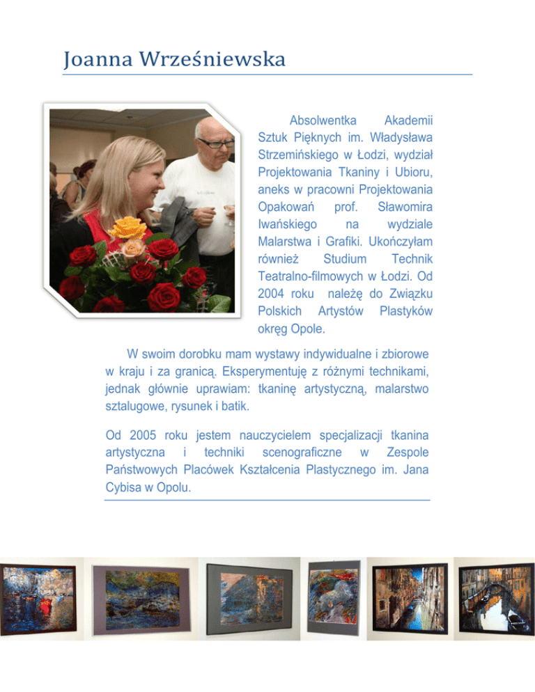 Joanna Wrześ niewska Absolwentka Akademii Sztuk Pięknych im. Władysława Strzemińskiego w Łodzi, wydział Projektowania Tkaniny i Ubioru, aneks w pracowni Projektowania Opakowań prof. Sławomira Iwańskiego na wydziale Malarstwa i Grafiki. Ukończyłam również Studium Technik Teatralno-filmowych w Łodzi. Od 2004 roku należę do Związku Polskich Artystów Plastyków okręg Opole. W swoim dorobku mam wystawy indywidualne i zbiorowe w kraju i za granicą. Eksperymentuję z różnymi technikami, jednak głównie uprawiam: tkaninę artystyczną, malarstwo sztalugowe, rysunek i batik. Od 2005 roku jestem nauczycielem specjalizacji tkanina artystyczna i techniki scenograficzne w Zespole Państwowych Placówek Kształcenia Plastycznego im. Jana Cybisa w Opolu.