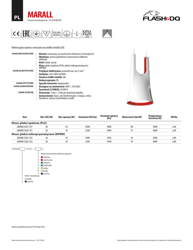 MARALL PL Grupa katalogowa: FLASH&DQ Dekoracyjna oprawa zwieszana na źródła światła LED. DANE MECHANICZNE DANE ELEKTRYCZNE DANE OPTYCZNE DANE DODATKOWE DANE OGÓLNE Montaż: zwieszany, na zawieszeniu linkowym (w komplecie) Obudowa: żywica poliestrowa wzmocniona włóknem szklanym Kolor: biały, czarny Klosz: pleksi opalowa (PLX), pleksi mikropryzmatyczna (MPRM) Przyłącze elektryczne: przewód max 3x2,5 mm² Zasilanie: 220-240V 50/60Hz Zawiera źródło światła: tak Rodzaj osprzętu: ED Sposób świecenia: bezpośredni Dostępne na zamówienie: DIM 1..10V, DALI Żywotność (L70B50): 50 000 h Gwarancja: 3 lata + 2 lata po rejestracji projektu Zastosowanie: biura, sale konferencyjne, recepcje, centra handlowe, salony samochodowe, butiki Kod Moc LED [W] Moc oprawy [W] Klosz: pleksi opalowa (PLX) 20008X.5L01.1X1 36 43 20008X.5L02.1X1 36 43 Klosz: pleksi mikropryzmatyczna (MPRM) 20008X.5L01.1X2 36 43 20008X.5L02.1X2 36 43 20008 .5L01.1 Strumień LED [lm] Strumień oprawy [lm] Skuteczność [lm/W] Temperatura barwowa [K] CRI/Ra 5000 5200 3800 3900 88 91 3000 4000 ≥80 ≥80 5000 5200 3950 4100 92 95 3000 4000 ≥80 ≥80 2 Kolor elementów dekoracyjnych 1 2 3 4 5 6 7 Kolor obudowy 1 3 różowy czerwony zielony niebieski żółty biały czarny biały czarny Oprawa zaprojektowana przez LUG Design Team Data utworzenia dokumentu: 29-7-2016 Zastrzegamy sobie prawo zmian konstrukcyjnych w oprawach oświetleniowych PL MARALL Grupa katalogowa: FLASH&DQ Wymiary Wymiary montażowe Masa Ilość Ilość [mm] netto [mm] na palecie w opakowaniu WH [kg] W Klosz: pleksi opalowa (PLX) 20008X.5L01.1X1 535 1150 380 2 1 8,2 20008X.5L02.1X1 535 1150 380 2 1 8,2 Klosz: pleksi mikropryzmatyczna (MPRM) 20008X.5L01.1X2 535 1150 380 2 1 8,2 20008X.5L02.1X2 535 1150 380 2 1 8,2 Kod KRZYWE ŚWIATŁOŚCI 200081.5L01.111 200081.5L01.112 Oprawa zaprojektowana przez LUG Design Team Data utworzenia dokumentu: 29-7-2016 Zastrzegamy sobie prawo zmian konstrukcyjnych w oprawach oświetleniowych