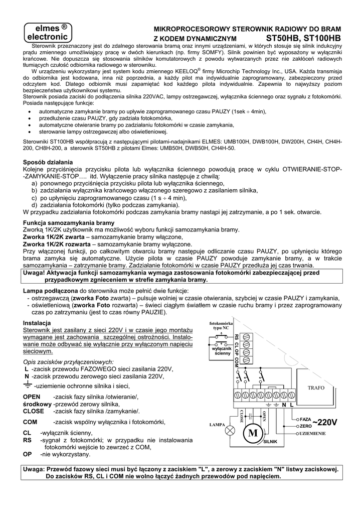 elmes ® electronic MIKROPROCESOROWY STEROWNIK RADIOWY DO BRAM Z KODEM DYNAMICZNYM ST50HB, ST100HB Sterownik przeznaczony jest do zdalnego sterowania bramą oraz innymi urządzeniami, w których stosuje się silnik indukcyjny prądu zmiennego umożliwiający pracę w dwóch kierunkach (np. firmy SOMFY). Silnik powinien być wyposażony w wyłączniki krańcowe. Nie dopuszcza się stosowania silników komutatorowych z powodu wytwarzanych przez nie zakłóceń radiowych tłumiących czułość odbiornika radiowego w sterowniku. W urządzeniu wykorzystany jest system kodu zmiennego KEELOQ® firmy Microchip Technology Inc., USA. Każda transmisja do odbiornika jest kodowana, inna niż poprzednia, a każdy pilot ma indywidualnie zaprogramowany, zabezpieczony przed odczytem kod. Dlatego odbiornik musi zapamiętać kod każdego pilota indywidualnie. Zapewnia to najwyższy poziom bezpieczeństwa użytkownikowi systemu. Sterownik posiada zaciski do podłączenia silnika 220VAC, lampy ostrzegawczej, wyłącznika ściennego oraz sygnału z fotokomórki. Posiada następujące funkcje: • • • • automatyczne zamykanie bramy po upływie zaprogramowanego czasu PAUZY (1sek ÷ 4min), przedłużenie czasu PAUZY, gdy zadziała fotokomórka, automatyczne otwieranie bramy po zadziałaniu fotokomórki w czasie zamykania, sterowanie lampy ostrzegawczej albo oświetleniowej. Sterowniki ST100HB współpracują z następującymi pilotami-nadajnikami ELMES: UMB100H, DWB100H, DW200H, CH4H, CH4H200, CH8H-200, a sterownik ST50HB z pilotami Elmes: UMB50H, DWB50H, CH4H-50. Sposób działania Kolejne przyciśnięcia przycisku pilota lub wyłącznika ściennego powodują pracę w cyklu OTWIERANIE-STOP-ZAMYKANIE-STOP…. itd. Wyłączenie pracy silnika następuje z chwilą: a) ponownego przyciśnięcia przycisku pilota lub wyłącznika ściennego, b) zadziałania wyłącznika krańcowego włączonego szeregowo z zasilaniem silnika, c) po upłynięciu zaprogramowanego czasu (1 s ÷ 4 min), d) zadziałania fotokomórki (tylko podczas zamykania). W przypadku zadziałania fotokomórki podczas zamykania bramy nastąpi jej zatrzymanie, a po 1 sek. otwarcie. Funkcja samozamykania bramy Zworką 1K/2K użytkownik ma możliwość wyboru funkcji samozamykania bramy. Zworka 1K/2K zwarta – samozamykanie bramy włączone, Zworka 1K/2K rozwarta – samozamykanie bramy wyłączone. Przy włączonej funkcji, po całkowitym otwarciu bramy następuje odliczanie czasu PAUZY, po upłynięciu którego brama zamyka się automatyczne. Użycie pilota w czasie PAUZY powoduje zamykanie bramy, a w trakcie samozamykania – zatrzymanie bramy. Zadziałanie fotokomórki w czasie PAUZY przedłuża jej czas trwania. Uwaga! Aktywacja funkcji samozamykania wymaga zastosowania fotokomórki zabezpieczającej przed przypadkowym zgnieceniem w strefie zamykania bramy. Lampa podłączona do sterownika może pełnić dwie funkcje: - ostrzegawczą (zworka Foto zwarta) – pulsuje wolniej w czasie otwierania, szybciej w czasie PAUZY i zamykania, - oświetleniową (zworka Foto rozwarta) – świeci ciągłym światłem w czasie ruchu bramy i przez zaprogramowany czas po zatrzymaniu (jest to czas równy PAUZIE). fotokomórka typu NC wyłącznik ścienny Opis zacisków przyłączeniowych: L -zacisk przewodu FAZOWEGO sieci zasilania 220V, N -zacisk przewodu zerowego sieci zasilania 220V, RS CL OP COM Instalacja Sterownik jest zasilany z sieci 220V i w czasie jego montażu wymagane jest zachowania szczególnej ostrożności. Instalowanie może odbywać się wyłącznie przy wyłączonym napięciu sieciowym. -uziemienie ochronne silnika i sieci, TRAFO OPEN -zacisk fazy silnika /otwieranie/, środkowy -przewód zerowy silnika, CLOSE -zacisk fazy silnika /zamykanie/. OP -wyłącznik ścienny, -sygnał z fotokomórki; w przypadku nie instalowania fotokomórki wejście to zewrzeć z COM, -nie wykorzystany. LAMPA OPEN CL RS -zacisk wspólny wyłącznika i fotokomórki, CLOSE COM N L FAZA ZERO M ~220V UZIEMIENIE SILNIK Uwaga: Przewód fazowy sieci musi być łączony z zaciskiem "L", a zerowy z zaciskiem "N" listwy zaciskowej. Do zacisków RS, CL i COM nie wolno łączyć żadnych przewodów pod napięciem. Sterownika nie należy instalować w miejscach narażonych na działanie czynników atmosferycznych. W celu zwiększenia zasięgu pracy pilotów można przewodem koncentrycznym przyłączyć do odbiornika antenę zewnętrzną prętową lub dipolową w miejsce przewodu antenowego na płytce odbiornika. Ekran przewodu lutować do masy w pobliżu wejścia antenowego. Zestaw wyposażony jest w dwa kołki rozporowe φ6 mm, które umożliwiają bezpośredni montaż odbiornika na ścianie poprzez otwory montażowe. Sterownik powinien być zainstalowany złączem silnika do góry, a antenka powinna swobodnie zwisać. Przewodu antenowego nie wolno trwale mocować i kleić do ścian. PROCEDURY PROGRAMOWANIA 1. Wprowadzenie pilota do pamięci odbiornika (maksymalnie do 12 pilotów): a) Przycisnąć przycisk PRG. w odbiorniku (LED zaświeci się) na czas krótszy niż 2 s. Po zwolnieniu przycisku LED świeci dalej, co potwierdza wejście w ten tryb. b) Przycisnąć dowolny przycisk pilota - LED w odbiorniku gaśnie. c) Przycisnąć przycisk pilota drugi raz (ten sam co poprzednio). LED w odbiorniku wielokrotnie błyska potwierdzając prawidłowe wykonanie procedury. Uwaga: Ilość pilotów w zestawie jest ograniczona do 12. Wprowadzenie do pamięci 13-tego skasuje pierwszy, 14tego drugi, itd. Konieczność eliminacji z systemu skradzionego lub zgubionego pilota wymaga kasowania pamięci odbiornika, a następnie wprowadzenia do niej każdego z pozostałych pilotów. 2. Programowanie czasu, po którym nastąpi wyłączenie silnika oraz czasu PAUZY: a) Przycisnąć przycisk PRG w odbiorniku - LED zaświeci się - i przytrzymać na czas dłuższy niż 2 s, ale krótszy niż 8 s. Po zwolnieniu przycisku dioda LED w odbiorniku gaśnie. b) Przycisnąć przycisk pilota - LED zaświeci 