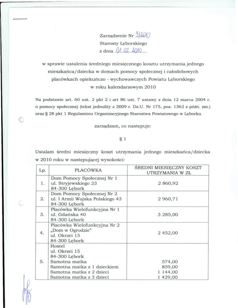 Zarządzenie Nr ~ j.WAO Starosty Lęborskiego z dnia w sprawie ustalenia mieszkańca/ .Ol.02 .. ifYr.o.... średniego miesięcznego kosztu utrzymania jednego dziecka w domach pomocy społecznej i całodobowych placówkach opiekuńczo - wychowawczych Powiatu Lęborskiego w roku kalendarzowym 2010 Na podstawie art. 60 ust. 2 pkt 2 i art 86 ust. 7 ustawy z dnia 12 marca 2004 r. o pomocy społecznej (tekst jednolity z 2009 r. Dz.U. Nr 175, poz. 1362 z późno zm.) oraz § 28 pkt 1 Regulaminu Organizacyjnego Starostwa Powiatowegow Lęborku zarządzam, co następuje: § Ustalam średni miesięczny w 2010 roku w następującej Lp. 1. 2. 3. 4. 5. 1 koszt utrzymania jednego mieszkańca! dziecka wysokości: PLACÓWKA Dom Pomocy Społecznej Nr 1 ul. Stryjewskiego 23 84-300 Lębork Dom Pomocy Społecznej Nr 2 ul. I Armii Wojska Polskiego 43 84-300 Lębork Placówka Wielofunkcyjna Nr 1 ul. Gdańska 40 84-300 Lębork Placówka Wielofunkcyjna Nr 2 "Dom w Ogrodzie" ul. Okrzei 15 84-300 Lębork Hostel ul. Okrzei 15 84-300 Lębork Samotna matka Samotna matka z 1 dzieckiem Samotna matka z 2 dzieci Samotna matka z 3 dzieci ŚREDNI MIESIĘCZNY KOSZT UTRZYMANIAW ZŁ 2 860,92 2 960,71 3285,00 2452,00 574,00 859,00 1 144,00 1 429,00 §2 Traci moc Zarządzenie Nr 3/2009 2009 r. w sprawie ustalenia jednego mieszkańca/dziecka placówkach opiekuńczo Starosty Lęborskiego z dnia 26 stycznia średniego miesięcznego kosztu utrzymania w domach pomocy społecznej i całodobowych - wychowawczych Powiatu Lęborskiego w roku kalendarzowym 2009, ze zmianami. §3 Zarządzenie podlega ogłoszeniu w Dzienniku Pomorskiego i wchodzi w życie od następnego Urzędowym Województwa miesiąca przypadającego po miesiącu, w którym zostało opublikowane. Sprawdz.ono pod względem for Ino - prawnym s TAn~ S TA -r-: