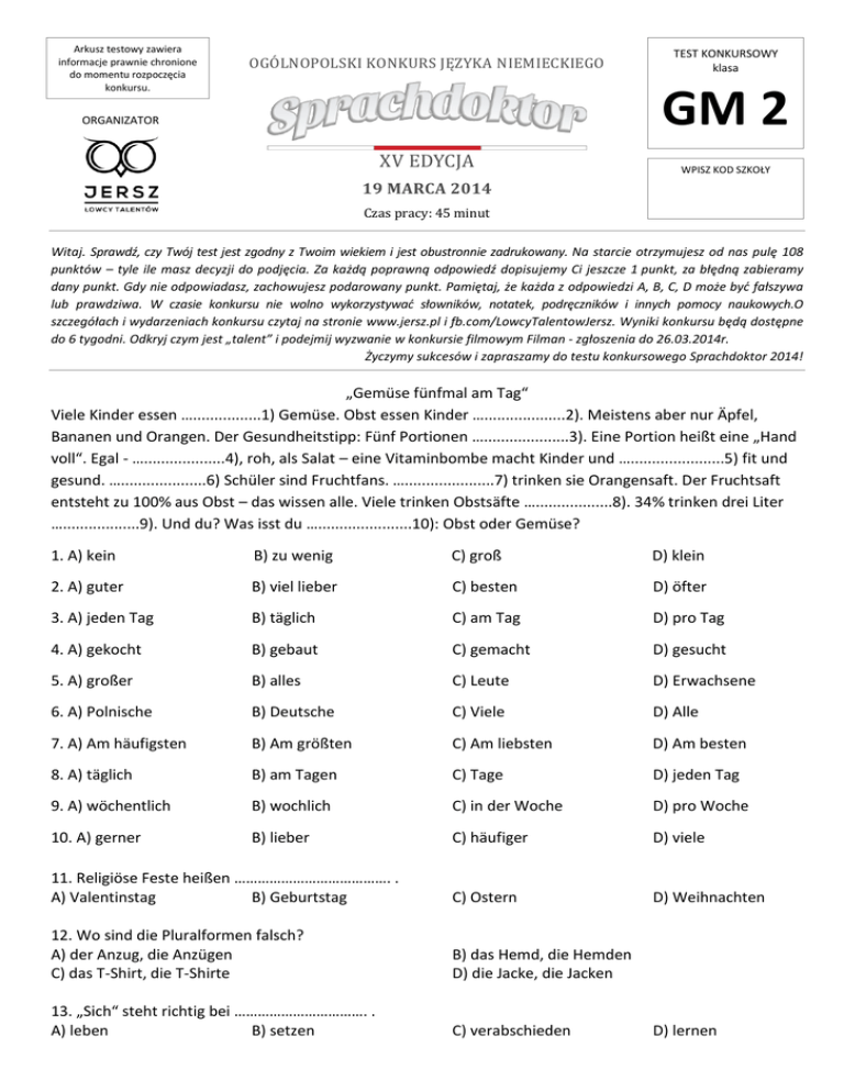 Arkusz testowy zawiera informacje prawnie chronione do momentu rozpoczęcia konkursu. OGÓLNOPOLSKI KONKURS JĘZYKA NIEMIECKIEGO TEST KONKURSOWY klasa GM 2 ORGANIZATOR XV EDYCJA WPISZ KOD SZKOŁY 19 MARCA 2014 Czas pracy: 45 minut Witaj. Sprawdź, czy Twój test jest zgodny z Twoim wiekiem i jest obustronnie zadrukowany. Na starcie otrzymujesz od nas pulę 108 punktów – tyle ile masz decyzji do podjęcia. Za każdą poprawną odpowiedź dopisujemy Ci jeszcze 1 punkt, za błędną zabieramy dany punkt. Gdy nie odpowiadasz, zachowujesz podarowany punkt. Pamiętaj, że każda z odpowiedzi A, B, C, D może być fałszywa lub prawdziwa. W czasie konkursu nie wolno wykorzystywać słowników, notatek, podręczników i innych pomocy naukowych.O szczegółach i wydarzeniach konkursu czytaj na stronie www.jersz.pl i fb.com/LowcyTalentowJersz. Wyniki konkursu będą dostępne do 6 tygodni. Odkryj czym jest „talent” i podejmij wyzwanie w konkursie filmowym Filman - zgłoszenia do 26.03.2014r. Życzymy sukcesów i zapraszamy do testu konkursowego Sprachdoktor 2014! „Gemüse fünfmal am Tag“ Viele Kinder essen …................1) Gemüse. Obst essen Kinder …...................2). Meistens aber nur Äpfel, Bananen und Orangen. Der Gesundheitstipp: Fünf Portionen …....................3). Eine Portion heißt eine „Hand voll“. Egal - …...................4), roh, als Salat – eine Vitaminbombe macht Kinder und …......................5) fit und gesund. …....................6) Schüler sind Fruchtfans. ….....................7) trinken sie Orangensaft. Der Fruchtsaft entsteht zu 100% aus Obst – das wissen alle. Viele trinken Obstsäfte …..................8). 34% trinken drei Liter …..................9). Und du? Was isst du …......................10): Obst oder Gemüse? 1. A) kein B) zu wenig C) groß D) klein 2. A) guter B) viel lieber C) besten D) öfter 3. A) jeden Tag B) täglich C) am Tag D) pro Tag 4. A) gekocht B) gebaut C) gemacht D) gesucht 5. A) großer B) alles C) Leute D) Erwachsene 6. A) Polnische B) Deutsche C) Viele D) Alle 7. A) Am häufigsten B) Am größten C) Am liebsten D) Am besten 8. A) täglich B) am Tagen C) Tage D) jeden Tag 9. A) wöchentlich B) wochlich C) in der Woche D) pro Woche 10. A) gerner B) lieber C) häufiger D) viele 11. Religiöse Feste heißen …………………………………. . A) Valentinstag B) Geburtstag C) Ostern D) Weihnachten 12. Wo sind die Pluralformen falsch? A) der Anzug, die Anzügen C) das T-Shirt, die T-Shirte B) das Hemd, die Hemden D) die Jacke, die Jacken 13. „Sich“ steht richtig bei ……………………………. . A) leben B) setzen C) verabschieden D) lernen 14. Frau Köhler kauft Äpfel, ………………………………………………… . A) weil sie Fleisch mag B) weil Obst gesund ist C) weil sie Hähnchen gern isst D) weil sie einen Kuchen backen will 15. Der Taxifahrer bringt ……………. zum Bahnhof. A) ihn B) uns C) alle D) niemand 16. Das Auto des ………………………….. war in der Garage. A) Junges B) Bekannten C) Freundes D) Tourist 17. Den Advent symbolisieren …………………………………. . A) der Adventskalender B) die Adventseier C) sechs Kerzen D) der Adventskranz 18. Mein Hobby ist ………………………. . A) Musik hören B) super C) auch D) Reiten 19. ……………………………… liegt in Österreich. A) Wien B) Bern C) Salzburg D) Innsbruck 20. Komm, wir gehen in den ……………………………….! A) Schwimmbad B) Wald C) Park D) Turnhalle 21. Guten Tag, Frau Braun! Wie geht es ………………………… Mann? A) ihrem B) Ihren C) Ihrem D) sein 22. Jeder hat ………………. eigenes Buch. A) seinen B) seiner C) seines D) sein 23. Ihr …………………….. gern Bücher. A) lest B) liest C) bearbeitet D) mögt 24. Ergänze richtig mit „ r”! A) ko…..igieren B) diktie…..en C) hö…..en D) notie…..en 25. Welche Sätze sind richtig? A) Wiederholen Sie bitte! C) Spreche nicht so laut! B) Bitte wiederholen Sie das! D) Sprecht lauter bitte! 26. Wo liegt München? A) In Mitteldeutschland. C) In Norddeutschland. B) In Süddeutschland. D) In Bayern. 27. ………………………… ist kaputt. A) Die Telefonnummer B) Die Kassette C) Die Lampe PARTNERZY I PATRONI © COPYRIGHT BY ŁOWCY TALENTÓW – JERSZ. WILCZYN 2013 D) Die Adresse
