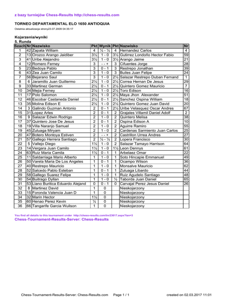 z bazy turniejów Chess-Results http://chess-results.com TORNEO DEPARTAMENTAL ELO 1650 ANTIOQUIA Ostatnia aktualizacja strony23.07.2009 04:35:17 Kojarzenia/wyniki 5. Runda Szach Nr Nazwisko 1 42 Zapata William 2 13 Orozco Arango Jaidiber 3 41 Uribe Alejandro 4 12 Romero Ferney 5 23 Bedoya Pablo 6 43 Zea Juan Camilo 7 56 Bejarano Saul 8 6 Jaramillo Juan Guillermo 9 33 Martinez German 10 34 Mejia Ferney 11 17 Polo Salomon 12 46 Escobar Castaneda Daniel 13 35 Molina Edison E 14 3 Galindo Guzman Antonio 15 31 Lopez Arles 16 9 Salazar Edwin Rodrigo 17 37 Quintero Jose De Jesus 18 19 Villa Naranjo Samuel 19 45 Zuluaga Miryam 20 47 Botero Montoya Estiven 21 57 Gallego Herrera Santiago 22 5 Vallejo Diego 23 14 Vergara Juan Camilo 24 63 Ruiz Maria Camila 25 11 Saldarriaga Mario Alberto 26 50 Varela Maria De Los Angeles 27 40 Restrepo Mauricio 28 52 Salcedo Pablo Esteban 29 58 Gallego Suarez Felipe 30 54 Buitrago Dyllan 31 53 Llano Buritica Eduardo Alejand 32 8 Martinez David 33 15 Foronda Valencia Juan D 34 32 Marin Hector 35 60 Henao Perez Kevin 36 66 Tangarife Garcia Wuilson Pkt 4 3½ 3½ 3 3 3 3 2½ 2½ 2½ 2½ 2½ 2½ 2 2 2 2 2 2 2 2 1½ 1½ 1½ 1 1 1 1 1 1 0 1 1 1½ ½ 1 Wynik ½-½ 1-0 1-0 --+ 0-1 1-0 1-0 1-0 0-1 1-0 1-0 0-1 1-0 0-1 0-1 1-0 0-1 1-0 1-0 --+ ½-½ 1-0 1-0 0-1 1-0 0-1 1-0 0-1 1-0 1-0 0-1 0 0 0 0 0 Pkt 4 3½ 3½ 3 3 3 2½ 2½ 2½ 2½ 2½ 2½ 2½ 2½ 2 2 2 2 2 2 2 2 1½ 1 1 1 1 1 1 ½ 0 Nazwisko Hernandez Carlos Gutirrez Londoño Hector Fabio Arango Jaime Cifuentes Jorge Restrepo Jonathan Builes Juan Felipe Salazar Restrepo Duban Fernand Correa Hernan De Jesus Quintero Gomez Mauricio Toro Edison Maya Jhon Alexander Sanchez Ospina William Quintero Gomez Juan David Uribe Velasquez Oscar Andres Grajales Villamil Daniel Adolf Quintero Melisa Ospina Edison A Aguirre Ramiro Cardenas Sarmiento Juan Carlos Castrillon Urrea Andres Lopera Francisco Salazar Tamayo Harrison Leon Dennys Arbelaez Omar Soto Hincapie Emmanuel Ocampo Wilson Monsalve Mauricio Zuluaga Libardo Ruiz Agudelo Santiago Taborda Juan Daniel Carvajal Perez Jesus Daniel Nieskojarzony Nieskojarzony Nieskojarzony Nieskojarzony Nieskojarzony Nr 4 59 21 28 39 24 1 29 7 16 51 18 20 67 2 38 10 55 25 27 30 64 61 22 49 36 62 44 48 65 26 You find all details to this tournament under http://chess-results.com/tnr23617.aspx?lan=3 Chess-Tournament-Results-Server: Chess-Results Chess-Tournament-Results-Server: Chess-Results.com Page 1 / 1 created on 02.03.2017 11:01