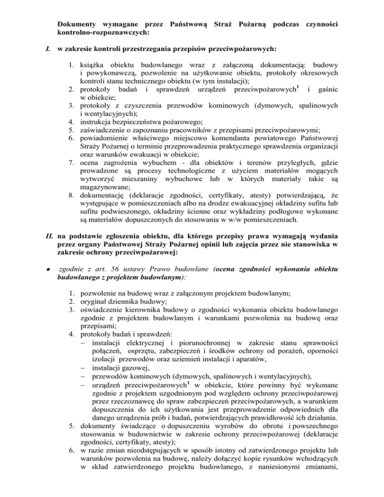 Dokumenty wymagane przez Państwową Straż Pożarną podczas czynności kontrolno-rozpoznawczych: I. w zakresie kontroli przestrzegania przepisów przeciwpożarowych: 1. książka obiektu budowlanego wraz z załączoną dokumentacją: budowy i powykonawczą, pozwolenie na użytkowanie obiektu, protokoły okresowych kontroli stanu technicznego obiektu (w tym instalacji); 2. protokoły badań i sprawdzeń urządzeń przeciwpożarowych1 i gaśnic w obiekcie; 3. protokoły z czyszczenia przewodów kominowych (dymowych, spalinowych i wentylacyjnych); 4. instrukcja bezpieczeństwa pożarowego; 5. zaświadczenie o zapoznaniu pracowników z przepisami przeciwpożarowymi; 6. powiadomienie właściwego miejscowo komendanta powiatowego Państwowej Straży Pożarnej o terminie przeprowadzenia praktycznego sprawdzenia organizacji oraz warunków ewakuacji w obiekcie; 7. ocena zagrożenia wybuchem - dla obiektów i terenów przyległych, gdzie prowadzone są procesy technologiczne z użyciem materiałów mogących wytworzyć mieszaniny wybuchowe lub w których materiały takie są magazynowane; 8. dokumentację (deklaracje zgodności, certyfikaty, atesty) potwierdzającą, że występujące w pomieszczeniach albo na drodze ewakuacyjnej okładziny sufitu lub sufitu podwieszonego, okładziny ścienne oraz wykładziny podłogowe wykonane są materiałów dopuszczonych do stosowania w w/w pomieszczeniach. II. na podstawie zgłoszenia obiektu, dla którego przepisy prawa wymagają wydania przez organy Państwowej Straży Pożarnej opinii lub zajęcia przez nie stanowiska w zakresie ochrony przeciwpożarowej: zgodnie z art. 56 ustawy Prawo budowlane (ocena zgodności wykonania obiektu budowlanego z projektem budowlanym): 1. pozwolenie na budowę wraz z załączonym projektem budowlanym; 2. oryginał dziennika budowy; 3. oświadczenie kierownika budowy o zgodności wykonania obiektu budowlanego zgodnie z projektem budowlanym i warunkami pozwolenia na budowę oraz przepisami; 4. protokoły badań i sprawdzeń: instalacji elektrycznej i piorunochronnej w zakresie stanu sprawności połączeń, osprzętu, zabezpieczeń i środków ochrony od porażeń, oporności izolacji przewodów oraz uziemień instalacji i aparatów, instalacji gazowej, przewodów kominowych (dymowych, spalinowych i wentylacyjnych), urządzeń przeciwpożarowych1 w obiekcie, które powinny być wykonane zgodnie z projektem uzgodnionym pod względem ochrony przeciwpożarowej przez rzeczoznawcę do spraw zabezpieczeń przeciwpożarowych, a warunkiem dopuszczenia do ich użytkowania jest przeprowadzenie odpowiednich dla danego urządzenia prób i badań, potwierdzających prawidłowość ich działania. 5. dokumenty świadczące o dopuszczeniu wyrobów do obrotu i powszechnego stosowania w budownictwie w zakresie ochrony przeciwpożarowej (deklaracje zgodności, certyfikaty, atesty); 6. w razie zmian nieodstępujących w sposób istotny od zatwierdzonego projektu lub warunków pozwolenia na budowę, należy dołączyć kopie rysunków wchodzących w skład zatwierdzonego projektu budowlanego, z naniesionymi zmianami, a w razie potrzeby także uzupełniający opis. W takim przypadku oświadczenie kierownika budowy o zgodności wykonania obiektu budowlanego z projektem budowlanym i warunkami pozwolenia na budowę oraz przepisami, powinno być potwierdzone przez projektanta i inspektora nadzoru inwestorskiego, jeżeli został ustanowiony. W przypadku gdy powyższe zmiany mają wpływ na bezpieczeństwo pożarowe, a projekt budowlany wymagał zgodnie z odrębnymi przepisami uzgodnienia przez rzeczoznawcę ds. zabezpieczeń przeciwpożarowych, zmiany te powinny również być potwierdzone przez rzeczoznawcę ds. zabezpieczeń przeciwpożarowych. inne opinie, np. w sprawie spełnienia wymagań przeciwpożarowych dla szkoły, przedszkola, punktu przedszkolnego lub zespołu wychowania przedszkolnego, placówki opiekuńczo-wychowawczej, kategorii obiektów hotelarskich, w zakresie obrotu i konfekcjonowania środków ochrony roślin: 1. książka obiektu budowlanego wraz z załączoną dokumentacją: budowy i powykonawczą, pozwolenie na użytkowanie obiektu, protokoły okresowych kontroli stanu technicznego obiektu, 2. protokoły badań i sprawdzeń: instalacji elektrycznej i piorunochronnej w zakresie stanu sprawności połączeń, osprzętu, zabezpieczeń i środków ochrony od porażeń, oporności izolacji przewodów oraz uziemień instalacji i aparatów, instalacji gazowej, przewodów kominowych (dymowych, spalinowych i wentylacyjnych), urządzeń przeciwpożarowych1 w obiekcie, które powinny być wykonane zgodnie z projektem uzgodnionym pod względem ochrony przeciwpożarowej przez rzeczoznawcę do spraw zabezpieczeń przeciwpożarowych, a warunkiem dopuszczenia do ich użytkowania jest przeprowadzenie odpowiednich dla danego urządzenia prób i badań, potwierdzających prawidłowość ich działania. 3. instrukcja bezpieczeństwa pożarowego 4. zaświadczenie o zapoznaniu pracowników z przepisami przeciwpożarowymi 5. powiadomienie właściwego miejscowo komendanta powiatowego Państwowej Straży Pożarnej o terminie przeprowadzenia praktycznego sprawdzenia organizacji oraz warunków ewakuacji. 6. ocena zagrożenia wybuchem - dla obiektów i terenów przyległych, gdzie prowadzone są procesy technologiczne z użyciem materiałów mogących wytworzyć mieszaniny wybuchowe lub w których materiały takie są magazynowane 7. dokumentację (deklaracje zgodności, certyfikaty, atesty) potwierdzającą, że występujące w pomieszczeniach albo na drodze ewakuacyjnej okładziny sufitu lub sufitu podwieszonego, okładziny ścienne oraz wykładziny podłogowe wykonane są materiałów dopuszczonych do stosowania w ww. pomieszczeniach. opinie o niezbędnej wielkości sił i środków potrzebnych do zabezpieczenia imprezy masowej, zastrzeżeniach do stanu technicznego obiektu (terenu) oraz o przewidywanych zagrożeniach: 1. graficzny plan obiektu (tere