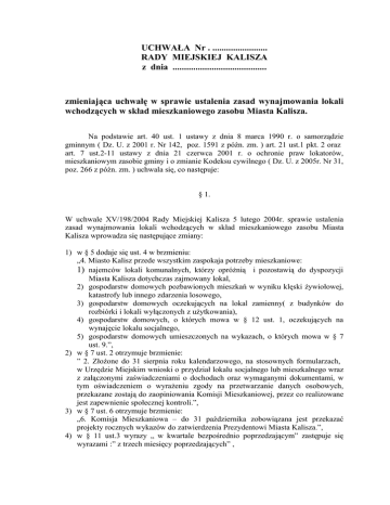 UCHWAŁA Nr . ........................ RADY MIEJSKIEJ KALISZA z dnia ......................................... zmieniająca uchwałę w sprawie ustalenia zasad wynajmowania lokali wchodzących w skład mieszkaniowego zasobu Miasta Kalisza. Na podstawie art. 40 ust. 1 ustawy z dnia 8 marca 1990 r. o samorządzie gminnym ( Dz. U. z 2001 r. Nr 142, poz. 1591 z późn. zm. ) art. 21 ust.1 pkt. 2 oraz art. 7 ust.2-11 ustawy z dnia 21 czerwca 2001 r. o ochronie praw lokatorów, mieszkaniowym zasobie gminy i o zmianie Kodeksu cywilnego ( Dz. U. z 2005r. Nr 31, poz. 266 z późn. zm. ) uchwala się, co następuje: § 1. W uchwale XV/198/2004 Rady Miejskiej Kalisza 5 lutego 2004r. sprawie ustalenia zasad wynajmowania lokali wchodzących w skład mieszkaniowego zasobu Miasta Kalisza wprowadza się następujące zmiany: 1) w § 5 dodaje się ust. 4 w brzmieniu: „4. Miasto Kalisz przede wszystkim zaspokaja potrzeby mieszkaniowe: 1) najemców lokali komunalnych, którzy opróżnią i pozostawią do dyspozycji Miasta Kalisza dotychczas zajmowany lokal, 2) gospodarstw domowych pozbawionych mieszkań w wyniku klęski żywiołowej, katastrofy lub innego zdarzenia losowego, 3) gospodarstw domowych oczekujących na lokal zamienny( z budynków do rozbiórki i lokali wyłączonych z użytkowania), 4) gospodarstw domowych, o których mowa w § 12 ust. 1, oczekujących na wynajęcie lokalu socjalnego, 5) gospodarstw domowych umieszczonych na wykazach, o których mowa w § 7 ust. 9.”, 2) w § 7 ust. 2 otrzymuje brzmienie: ” 2. Złożone do 31 sierpnia roku kalendarzowego, na stosownych formularzach, w Urzędzie Miejskim wnioski o przydział lokalu socjalnego lub mieszkalnego wraz z załączonymi zaświadczeniami o dochodach oraz wymaganymi dokumentami, w tym oświadczeniem o wyrażeniu zgody na przetwarzanie danych osobowych, przekazane zostają do zaopiniowania Komisji Mieszkaniowej, przez co realizowane jest zapewnienie społecznej kontroli.”, 3) w § 7 ust. 6 otrzymuje brzmienie: „6. Komisja Mieszkaniowa – do 31 października zobowiązana jest przekazać projekty rocznych wykazów do zatwierdzenia Prezydentowi Miasta Kalisza.”, 4) w § 11 ust.3 wyrazy „ w kwartale bezpośrednio poprzedzającym” zastępuje się wyrazami :” z trzech miesięcy poprzedzających” , 5) w § 16 ust. 1 otrzymuje brzmienie: „1. Najemcą lokalu mieszkalnego może zostać wyłącznie osoba, zamieszkująca w lokalu, w którym na osobę przypada mniej niż 5m2 powierzchni mieszkalnej, której średni miesięczny dochód z trzech kolejnych miesięcy poprzedzających dzień złożenia wniosku oraz trzech miesięcy poprzedzających zawarcie umowy najmu lokalu mieszkalnego, w przeliczeniu na członka gospodarstwa domowego nie przekracza 175% najniższej emerytury w gospodarstwie jednoosobowym lub 125% najniższej emerytury w gospodarstwie wieloosobowym.”, 6) w § 20 ust. 1 po wyrazie „dokonać” dodaje się wyrazy „dobrowolnej”, 7) w § 20 ust. 2 po wyrazie „lokalu” dodaje się wyrazy :” między najemcami”, 8) w § 20 ust. 3 po wyrazie „mieszkalnych” dodaje się wyrazy : „ między najemcami”, 9) w § 20 ust. 4 po wyrazie mieszkalnych” dodaje się wyrazy : „ między najemcami”, 10) w § 20 ust. 5 po wyrazie „ mieszkalnych” dodaje się wyrazy „ między najemcami”, 11) § w 20 ust. 7 otrzymuje brzmienie: „7. w przypadku dokonania dobrowolnej zamiany między najemcami lokali mieszkalnych, najemcy dokonują remontu lokali związanych z tą zamianą, na koszt własny.”, 12) w § 21 ust. 1 pkt 1 otrzymuje brzmienie: „1) średni miesięczny dochód z trzech kolejnych miesięcy poprzedzających dzień złożenia wniosku oraz trzech miesięcy poprzedzających zawarcie umowy najmu lokalu mieszkalnego, w przeliczeniu na członka gospodarstwa domowego nie przekracza 150% dochodu określonego w § 16 ust.1”, 13) w § 21 ust. 1 skreśla się pkt 4 14) w § 30 ust. 1 otrzymuje brzmienie : „1.Prezydent Miasta Kalisza – na wniosek najemcy, po zasięgnięciu opinii Komisji Mieszkaniowej – może przydzielić dodatkowo, do obecnie zajmowanego lokalu, wolny lokal nie spełniający warunków samodzielnego lokalu mieszkalnego lub socjalnego.”, 15) § 33 otrzymuje brzmienie: „1.Wynajmujący może zawrzeć umowę najmu lokalu z osobami, które nie wstąpiły w stosunek najmu po śmierci najemcy, jeżeli były zameldowane w lokalu i zamieszkiwały z najemcą przez okres co najmniej 10 lat, pod warunkiem, że spełniają kryterium dochodowe określone w § 16 ust. 1. 2.Wynajmujący może zawrzeć umowę najmu lokalu z osobami, z którymi nie zawarto umowy najmu na podstawie § 29 ust. 1, jeżeli były zameldowane w lokalu i zamieszkiwały z najemcą przez okres co najmniej 10 lat, pod warunkiem, że spełniają kryterium dochodowe określone w § 16 ust. 1.” , 16) w § 35a ust. 2 dodaje się pkt 4) w brzmieniu „4) w innych przypadkach po uzyskaniu pozytywnej opinii Komisji Mieszkaniowej.”, 17) po Rozdziale VIII dodaje się Rozdział VIII a w brzmieniu: „VIIIa Zasady obniżania czynszu . § 35b. Na wniosek najemców zajmujących lokale wchodzące w skład mieszkaniowego zasobu gminy oraz podnajemców używających lokali wynajmowanych przez gminę od innych właścicieli i podnajmowanych tym podnajemcom stosuje się obniżki czynszu, o ile dochód na członka gospodarstwa domowego nie przekracza kwoty 175% najniższej emerytury w gospodarstwach jednoosobowych lub 125% najniższej emerytury w gospodarstwach wieloosobowych. § 35c. Ustala się wskaźniki obniżek czynszu w następujących wysokościach: 1) 20% dla najemców, których średni miesięczny dochód w przeliczeniu na członka gospodarstwa domowego jest niższy niż 50% kwoty uprawniającej do ubiegania się o obniżkę; 2) 10% dla najemców, których średni miesięczny dochód w przeliczeniu na członka gospodarstwa domowego jest równy lub wyższy niż 50% kwoty uprawniającej do ubiegania się o obniżkę, ale nie wyżs