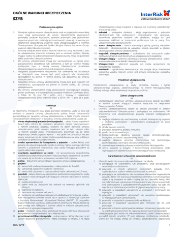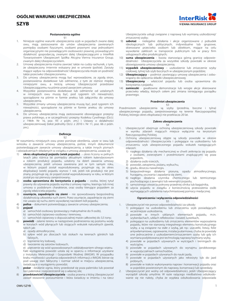 OGÓLNE WARUNKI UBEZPIECZENIA SZYB 1. 2. 3. 4. 5. 6. Postanowienia ogólne §1 Niniejsze ogólne warunki ubezpieczenia szyb w pojazdach zwane dalej owu, mają zastosowanie do umów ubezpieczenia zawieranych pomiędzy osobami fizycznymi, osobami prawnymi oraz jednostkami organizacyjnymi nie posiadającymi osobowości prawnej, prowadzącymi działalność gospodarczą, zwanymi dalej Ubezpieczającymi a InterRisk Towarzystwem Ubezpieczeń Spółka Akcyjna Vienna Insurance Group. zwanym dalej Ubezpieczycielem. Umowę ubezpieczenia można zawrzeć także na cudzy rachunek, z tym, że ubezpieczony imiennie wskazany jest w umowie (polisie). Zarzuty mające wpływ na odpowiedzialność Ubezpieczyciela może on podnieść także przeciwko Ubezpieczonemu. Do umowy ubezpieczenia mogą być wprowadzone, za zgodą stron, postanowienia dodatkowe lub odmienne, z tym że różnice między niniejszymi owu, a treścią umowy Ubezpieczyciel przedstawi Ubezpieczającemu na piśmie przed zawarciem umowy. Wszystkie postanowienia dodatkowe lub odmienne od ustalonych w niniejszych owu muszą być, pod rygorem ich nieważności, sporządzone na piśmie w formie aneksu lub załącznika do umowy ubezpieczenia. Wszystkie zmiany umowy ubezpieczenia muszą być, pod rygorem ich nieważności, sporządzone na piśmie w formie aneksu do umowy ubezpieczenia. Do umowy ubezpieczenia mają zastosowanie obowiązujące przepisy prawa polskiego, a w szczególności przepisy Kodeksu Cywilnego (Dz.U. z 1964r. Nr 16, poz. 93 z późn. zm.) i Ustawy o działalności ubezpieczeniowej (tekst jednolity Dz.U. z 2010 r. Nr 11, poz. 66 z późn. zm.). Definicje §2 W rozumieniu niniejszych owu przez poniższe określenia, użyte w owu lub wniosku o zawarcie umowy ubezpieczenia, polisie, innym dokumencie potwierdzającym zawarcie umowy ubezpieczenia, a także innych pismach i oświadczeniach składanych w związku z umową ubezpieczenia, uważa się: 1) okres eksploatacji pojazdu (wiek pojazdu) – okres liczony w pełnych latach jako różnica lat pomiędzy aktualnym rokiem kalendarzowym a rokiem produkcji pojazdu, ustalony na dzień zawarcia umowy ubezpieczenia; jeżeli umowa zawierana jest w tym samym roku, w którym pojazd został wyprodukowany, przyjmuje się, że okres eksploatacji (wiek) pojazdu wynosi 1 rok; jeżeli rok produkcji nie jest znany, przyjmuje się, że pojazd został wyprodukowany w roku, w którym został po raz pierwszy zarejestrowany; 2) osoba uprawniona do korzystania z pojazdu – osoba, której tytuł prawny do używania pojazdu wynika z umowy najmu, leasingu lub innej umowy o podobnym charakterze, oraz osoby kierujące pojazdem za zgodą właściciela pojazdu; 3) osunięcie, zapadnięcie się ziemi – nie spowodowany bezpośrednią działalnością człowieka ruch ziemi. Przez osunięcie, zapadnięcie się ziemi nie uważa się ruchu ziemi wywołanej naciskiem kół pojazdu; 4) polisa – dokument potwierdzający zawarcie umowy ubezpieczenia; 5) pojazd: a) samochód osobowy (przewożący maksymalnie do 9 osób), b) samochód ciężarowo-osobowy i terenowy, c) samochód ciężarowy o dopuszczalnej masie całkowitej do 3,5 tony; 6) powódź - zalanie terenu w następstwie podniesienia się poziomu wody w korytach wód płynących lub stojących wskutek naturalnych zjawisk, takich jak: a) opady atmosferyczne, b) spływ wód po zboczach lub stokach na terenach górskich lub falistych, c) topnienie kry lodowej, d) tworzenie się zatorów lodowych, e) piętrzenie się wód spowodowanych oddziaływaniem silnego wiatru. Fakt wystąpienia powodzi ustala się w oparciu o informacje uzyskane z Instytutu Meteorologii i Gospodarki Wodnej (IMiGW). W przypadku braku możliwości uzyskania odpowiednich informacji z IMiGW, bierze się pod uwagę stan faktyczny i rozmiar szkód w miejscu ubezpieczenia, świadczące o wystąpieniu powodzi; 7) pożar - działanie ognia, który przedostał się poza palenisko lub powstał bez paleniska i rozprzestrzenił się o własnej sile; 8) przedstawiciel Ubezpieczyciela - osoba prawna z którą Ubezpieczyciel zawarł stosowne porozumienie i która świadczy w imieniu i na rzecz OWU SZYB 19) 10) 11) 12) 13) 14) Ubezpieczyciela usługi związane z naprawą lub wymianą uszkodzonej/ zniszczonej szyby; sabotaż – nielegalne działania i akcje organizowane z pobudek ideologicznych lub politycznych, indywidualne lub grupowe, skierowane przeciwko osobom lub obiektom, mające na celu wywołanie zakłóceń w transporcie publicznym lub w pracy firm usługowych albo produkcyjnych; suma ubezpieczenia - kwota stanowiąca górną granicę odpowiedzialności Ubezpieczyciela za wszystkie szkody powstałe w okresie obowiązywania umowy ubezpieczenia; wypadek ubezpieczeniowy – uszkodzenie lub zniszczenie szyby czołowej, tylnej lub szyb bocznych w ubezpieczonym pojeździe; Ubezpieczający – podmiot zawierający umowę ubezpieczenia i zobowiązany do opłacenia składki Ubezpieczeniowej; Ubezpieczony - właściciel pojazdu lub osoba uprawniona do korzystania z pojazdu; zamieszki - gwałtowne demonstracje lub wrogie akcje skierowane przeciwko władzy, których celem jest zmiana istniejącego porządku prawnego. Przedmiot ubezpieczenia §3 Przedmiotem ubezpieczenia są szyby (przednia, boczne i tylna) ubezpieczonego pojazdu, zarejestrowanego na terenie Rzeczypospolitej Polskiej, którego okres eksploatacji nie przekracza 20 lat. 1. 2. 1. 2. Zakres ubezpieczenia §4 Ubezpieczyciel obejmuje ochroną ubezpieczeniową szkody powstałe w wyniku zdarzeń mających miejsce wyłącznie na terytorium Rzeczypospolitej Polskiej. Ochroną ubezpieczeniową objęte są szkody powstałe w okresie odpowiedzialności Ubezpieczyciela i polegające na uszkodzeniu lub zniszczeniu szyb ubezpieczonego pojazdu wskutek następujących zdarzeń: 1) nagłego działania siły mechanicznej w chwili zetknięcia się pojazdu z osobami, zwierzętami i przedmiotami znajdującymi się poza pojazdem, 2) działania osób trzecich, 3) pow