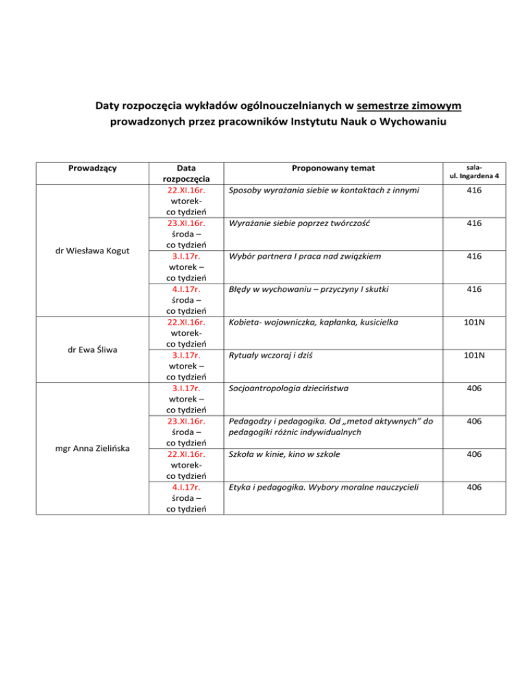 Daty rozpoczęcia wykładów ogólnouczelnianych w semestrze zimowym prowadzonych przez pracowników Instytutu Nauk o Wychowaniu Prowadzący dr Wiesława Kogut dr Ewa Śliwa mgr Anna Zielińska Data rozpoczęcia 22.XI.16r. wtorekco tydzień 23.XI.16r. środa – co tydzień 3.I.17r. wtorek – co tydzień 4.I.17r. środa – co tydzień 22.XI.16r. wtorekco tydzień 3.I.17r. wtorek – co tydzień 3.I.17r. wtorek – co tydzień 23.XI.16r. środa – co tydzień 22.XI.16r. wtorekco tydzień 4.I.17r. środa – co tydzień Proponowany temat salaul. Ingardena 4 Sposoby wyrażania siebie w kontaktach z innymi 416 Wyrażanie siebie poprzez twórczość 416 Wybór partnera I praca nad związkiem 416 Błędy w wychowaniu – przyczyny I skutki 416 Kobieta- wojowniczka, kapłanka, kusicielka 101N Rytuały wczoraj i dziś 101N Socjoantropologia dzieciństwa 406 Pedagodzy i pedagogika. Od „metod aktywnych” do pedagogiki różnic indywidualnych 406 Szkoła w kinie, kino w szkole 406 Etyka i pedagogika. Wybory moralne nauczycieli 406