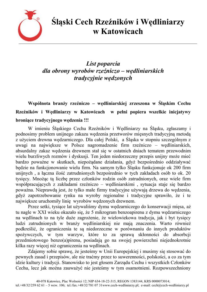 Śląski Cech Rzeźników i Wędliniarzy w Katowicach List poparcia dla obrony wyrobów rzeźniczo – wędliniarskich tradycyjnie wędzonych Wspólnota branży rzeźniczo – wędliniarskiej zrzeszona w Śląskim Cechu Rzeźników i Wędliniarzy w Katowicach w pełni popiera wszelkie inicjatywy broniące tradycyjnego wędzenia !!! W imieniu Śląskiego Cechu Rzeźników i Wędliniarzy na Śląsku, zgłaszamy i podnosimy problem unijnego zakazu wędzenia przetworów mięsnych tradycyjną metodą z użyciem drewna wędzarniczego. Dla całej Polski, a Śląska w stopniu szczególnym z uwagi na największe w Polsce nagromadzenie firm rzeźniczo – wędliniarskich, absurdalny zakaz wędzenia drewnem stał się w ostatnich dniach tematem przewodnim wielu burzliwych rozmów i dyskusji. Ten jeden niedorzeczny przepis unijny może mieć bardzo poważne w skutkach, niepożądane działania, gdyż bezpośrednio oddziaływać będzie na funkcjonowanie wielu firm. Na samym tylko Śląsku funkcjonuje ok 200 firm unijnych , a łączna ilość zatrudnionych bezpośrednio w tych zakładach osób to ok. 20 tysięcy. Mnożąc tą liczbę przez członków rodzin osób zatrudnionych, oraz wiele firm współpracujących z zakładami rzeźniczo – wędliniarskimi , sytuacja staje się bardzo poważna. Nieprawdą jest, że tylko małe firmy tradycyjne używają drzewa do wędzenia, gdyż zapotrzebowanie rynku na wyroby regionalne i tradycyjne sprawiło, że i te największe uruchomiły linię wyrobów wędzonych drewnem. Przez setki, tysiące lat używaliśmy dymu wędzarniczego do konserwacji mięsa, aż tu nagle w XXI wieku okazało się, że 5 mikrogram benzoapirenu z dymu wędzarniczego na wędlinach to na tyle duże zagrożenie, że wielowiekowa tradycja, jak i byt tysięcy ludzi zatrudnionych w branży wędliniarskiej nie mają znaczenia. Warto również podkreślić, że ograniczenia te są niedorzeczne w porównaniu do innych produktów spożywczych, w tym warzyw, które to za sprawą skłonności do absorbcji przedmiotowego benzo(a)pirenu, posiadają go na swojej powierzchni niejednokrotnie kilka razy więcej niż ograniczenia na wędlinach. Zdajemy sobie sprawę, że jesteśmy w Unii Europejskiej i musimy się stosować do pewnych zasad i przepisów, ale nie traćmy przez to suwerenności, polskości, a co za tym idzie kultury i tradycji. Stanowisko to jest głosem Zarządu Cechu i wszystkich Członków Cechu, lecz jak można zauważyć nie jesteśmy w tym osamotnieni. Rozpowszechniony 40-078 Katowice, Plac Wolności 12; NIP 634-18-22-315, REGON 1383144, KRS 0000073014; tel.+48/32/259 62 61 – 5 wew. 106; tel./fax.+48/32/781 07 31www.cech-wedliniarzy.pl; e-mail: [email protected] temat zakazu wędzenia drzewem przez różne nośniki medialne, spowodował lawinę komentarzy i wypowiedzi czytelników i internautów. Pod każdym artykułem widnieją setki komentarzy osób, którzy podobnie jak my są bardzo negatywnie nastawienie do tego zakazu. Zdajemy sobie sprawę, że w obecnym stopniu zaawansowania procedur prawnych, bardzo trudno będzie odwołać zgłaszany zakaz, dlatego z całą stanowczością apelujemy o odpowiednie przepisy wewnętrzne, warunkujące, dopuszczające możliwość wędzenia przetworów mięsnych za pomocą drzewa. Uważamy, iż powinny równocześnie zaistnieć warunkowe przepisy dopuszczające możliwość wędzenia drzewem z uwagi na wyroby regionalne i tradycyjne rejestrowane w Unii Europejskiej. Słynne „unijne słoneczka” na trwałe zapisały się również w branży wędliniarskiej i w wielu przypadkach wędzenie drzewem jest nieodzownym elementem procesu produkcji. Wiele przypadków potwierdziło, że nie musimy na wszystko się godzić, wystarczy veto lub podanie alternatywnego rozwiązania. Również same względy smakowe przemawiają za dopuszczeniem do tradycyjnego wędzenia wędlin. Od setek, tysięcy lat ludzie jedzą mięso. Przełomem w ewolucji ludzkości było ujarzmienie ognia, który pozwalał na obróbkę termiczną mięsa i konserwowanie dymem wędzarniczym. Tysiące lat, prawie niezmiennie używano drewna do wędzenia wyrobów mięsnych i żadna „Unia” tego nie zmieni, a wprowadzony zakaz spowoduje zdecydowane nasilenie się już i tak sporej „szarej strefy” Zarząd Śląskiego Cechu Rzeźników i Wędliniarzy w Katowicach apeluje o odpowiednie działania, które spowodują równowagę i spokój. Już dość afer i ciągłych ataków na branżę rzeźniczo – wędliniarską. Unię Europejska bardzo „boli” fakt, że w Polska branża rzeźniczo – wędliniarska jest jedną z najlepszych na Świecie i nawet kraje „wysoko rozwinięte” takie jak np. Niemcy – mogą nam tylko pozazdrościć jakości zarówno zakładów przetwórczych jak i samych wyrobów. Równocześnie deklarujemy wszechstronną pomoc merytoryczną. Członkowie naszego Cechu to niejednokrotnie cenieni fachowcy, technolodzy, właściciele zarówno małych jak i średnich i dużych firm, który stanowią skarbnicę wiedzy na temat branży rzeźniczo – wędliniarskiej. Z wyrazami szacunku, Grzegorz Miketa Dyrektor Śląskiego Cechu Rzeźników i Wędliniarzy w Katowicach 40-078 Katowice, Plac Wolności 12; NIP 634-18-22-315, REGON 1383144, KRS 0000073014; tel.+48/32/259 62 61 – 5 wew. 106; tel./fax.+48/32/781 07 31www.cech-wedliniarzy.pl; e-mail: [email protected]